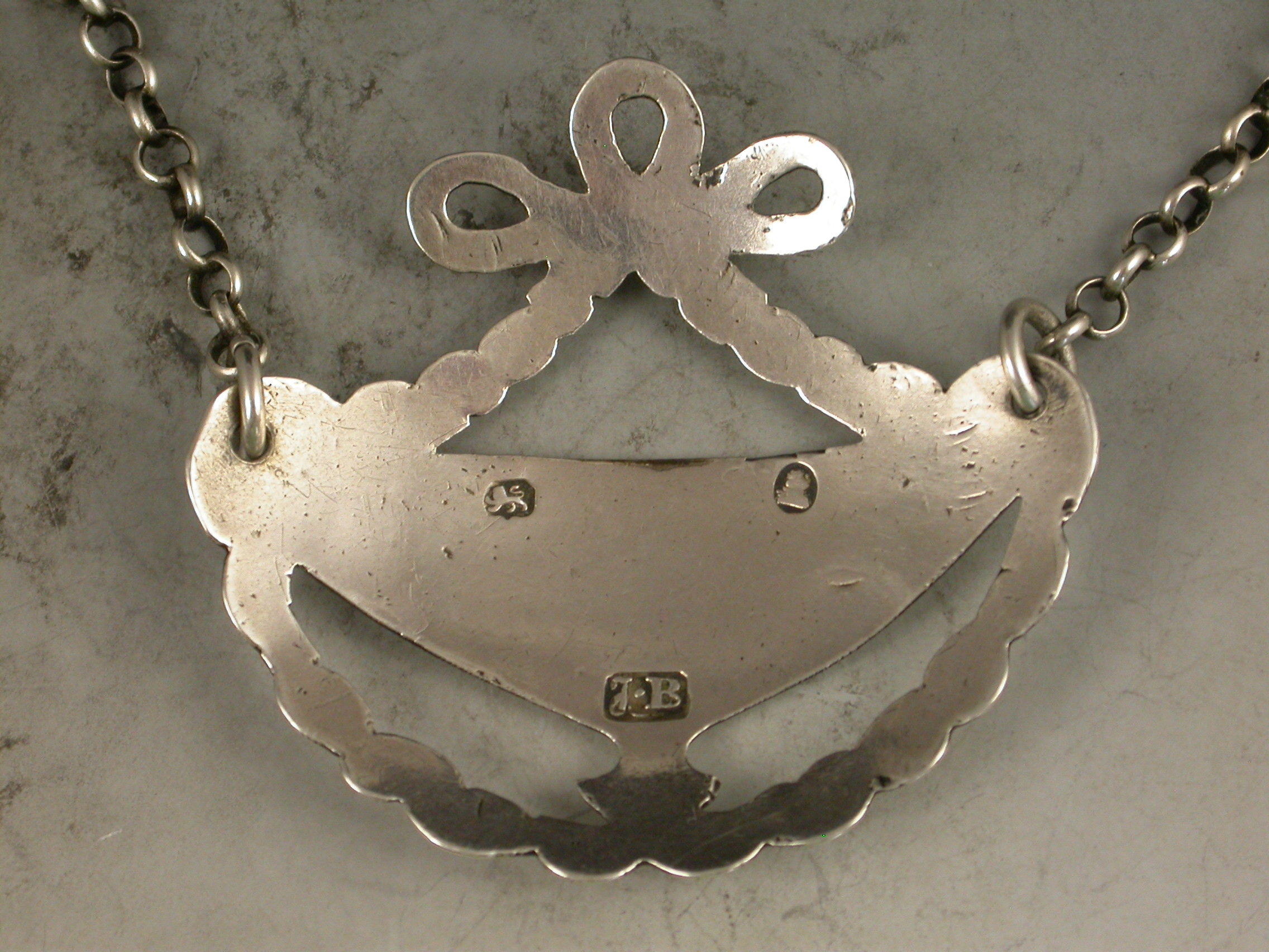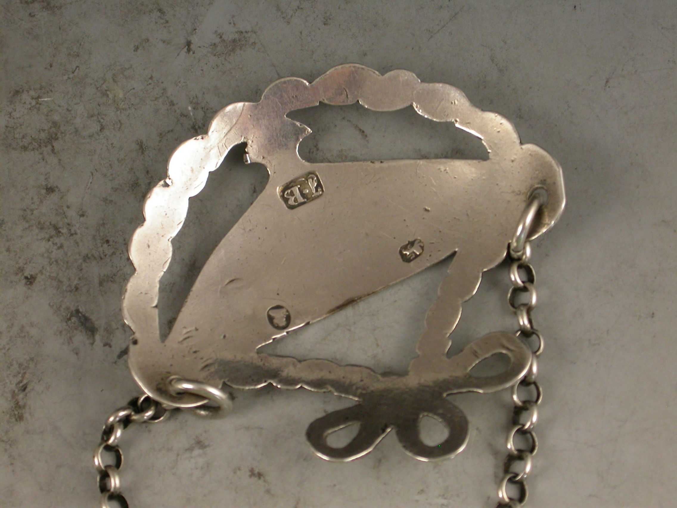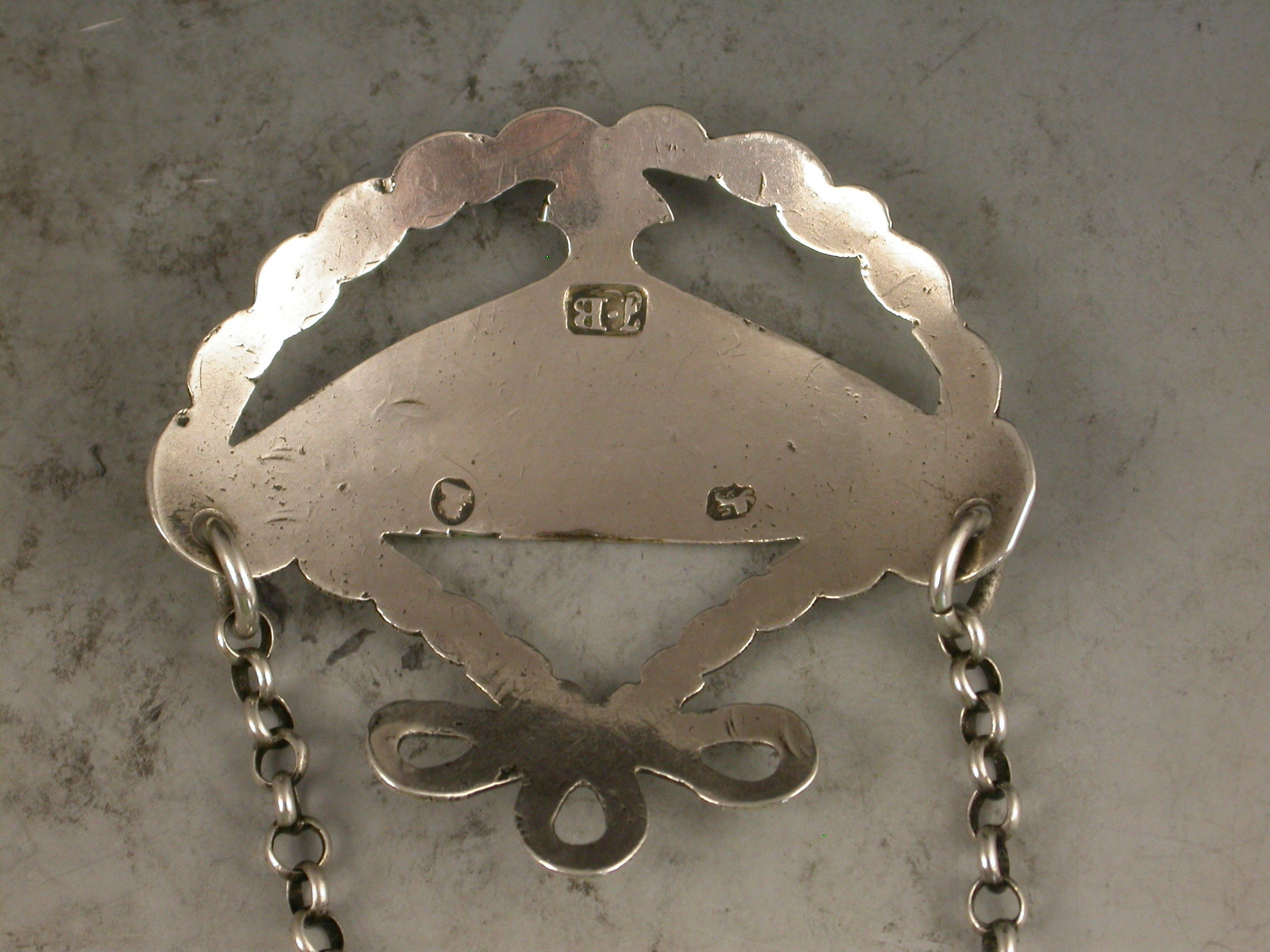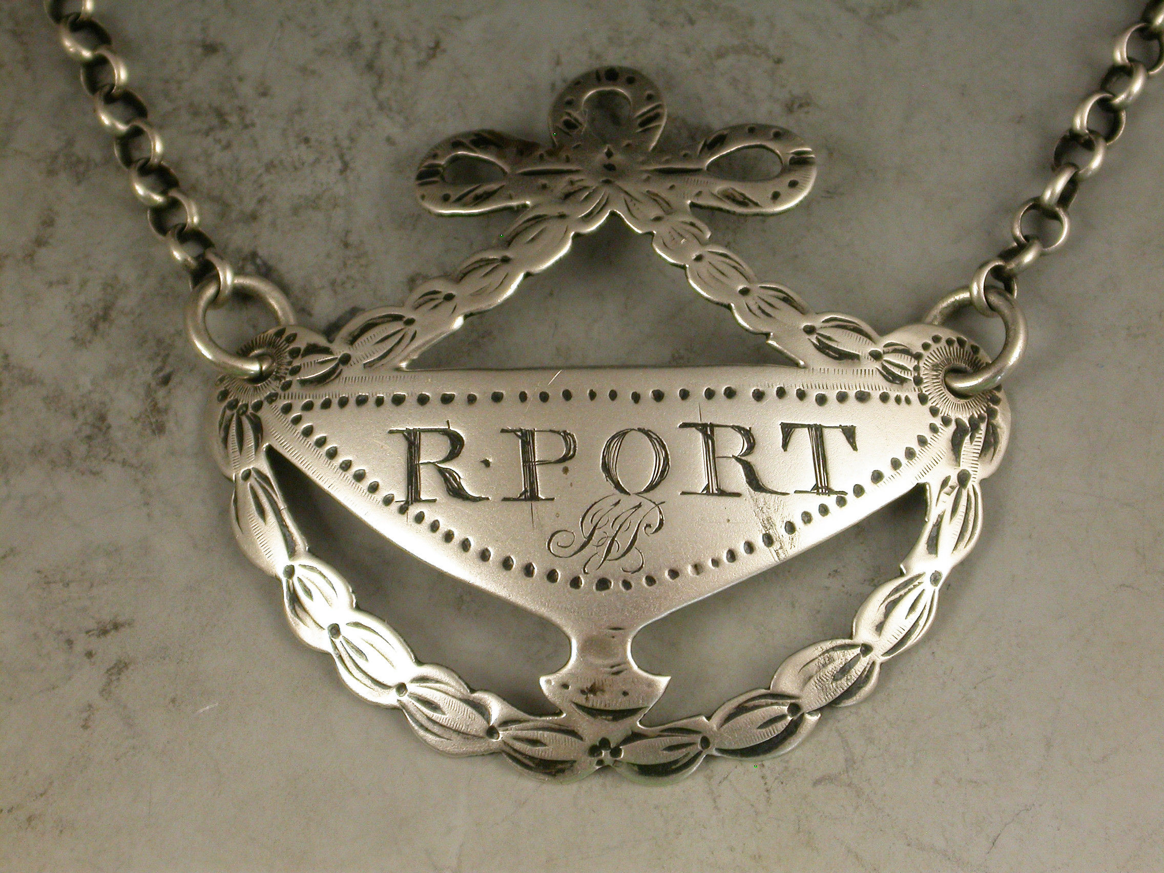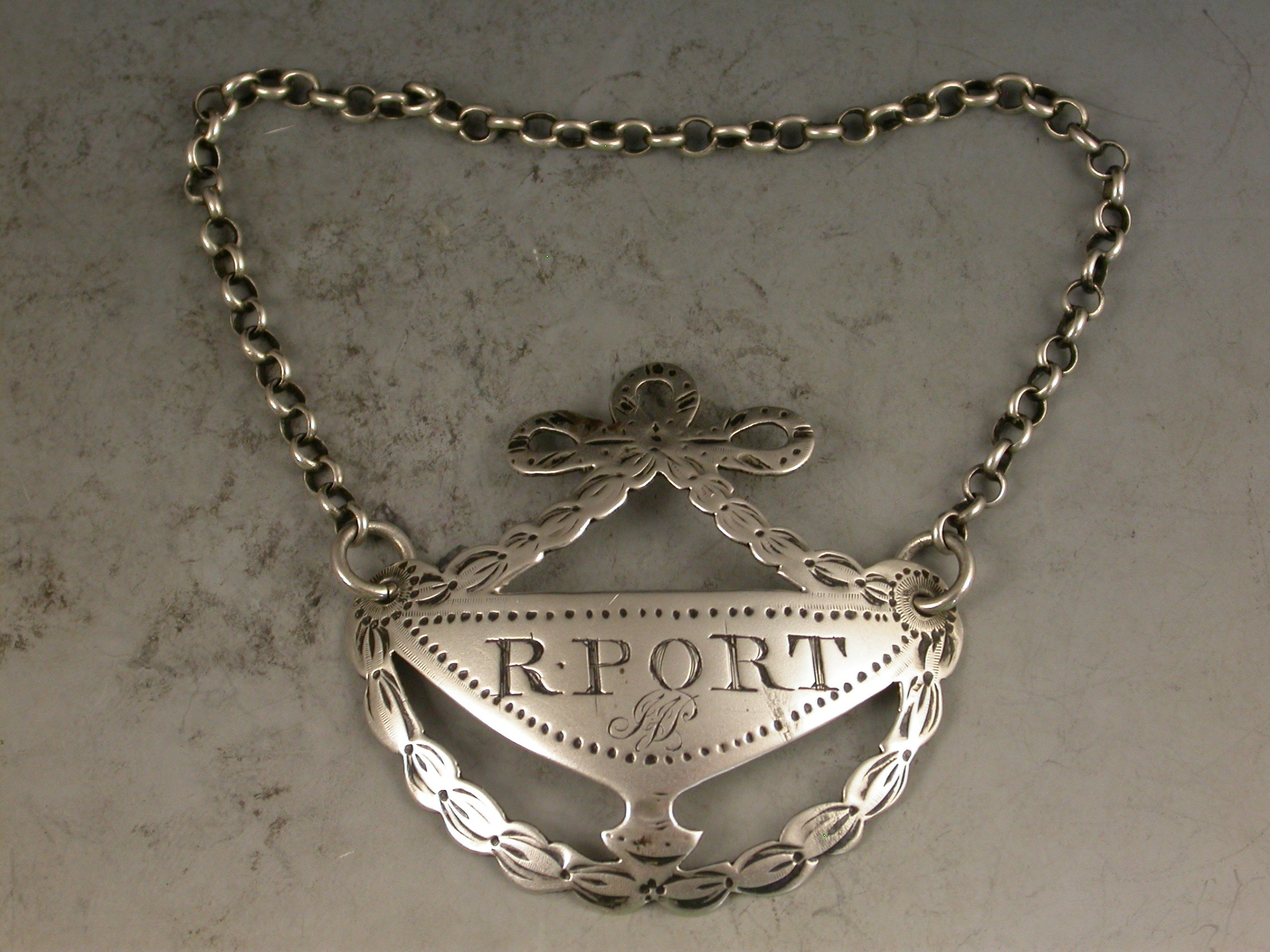 A fine George III 18th century silver Wine Label of goblet and festoon form with tied ribbon surmount, the festoons with bright-cut engraved decoration, incised for R.Port. Also engraved with contemporary initials below the title.