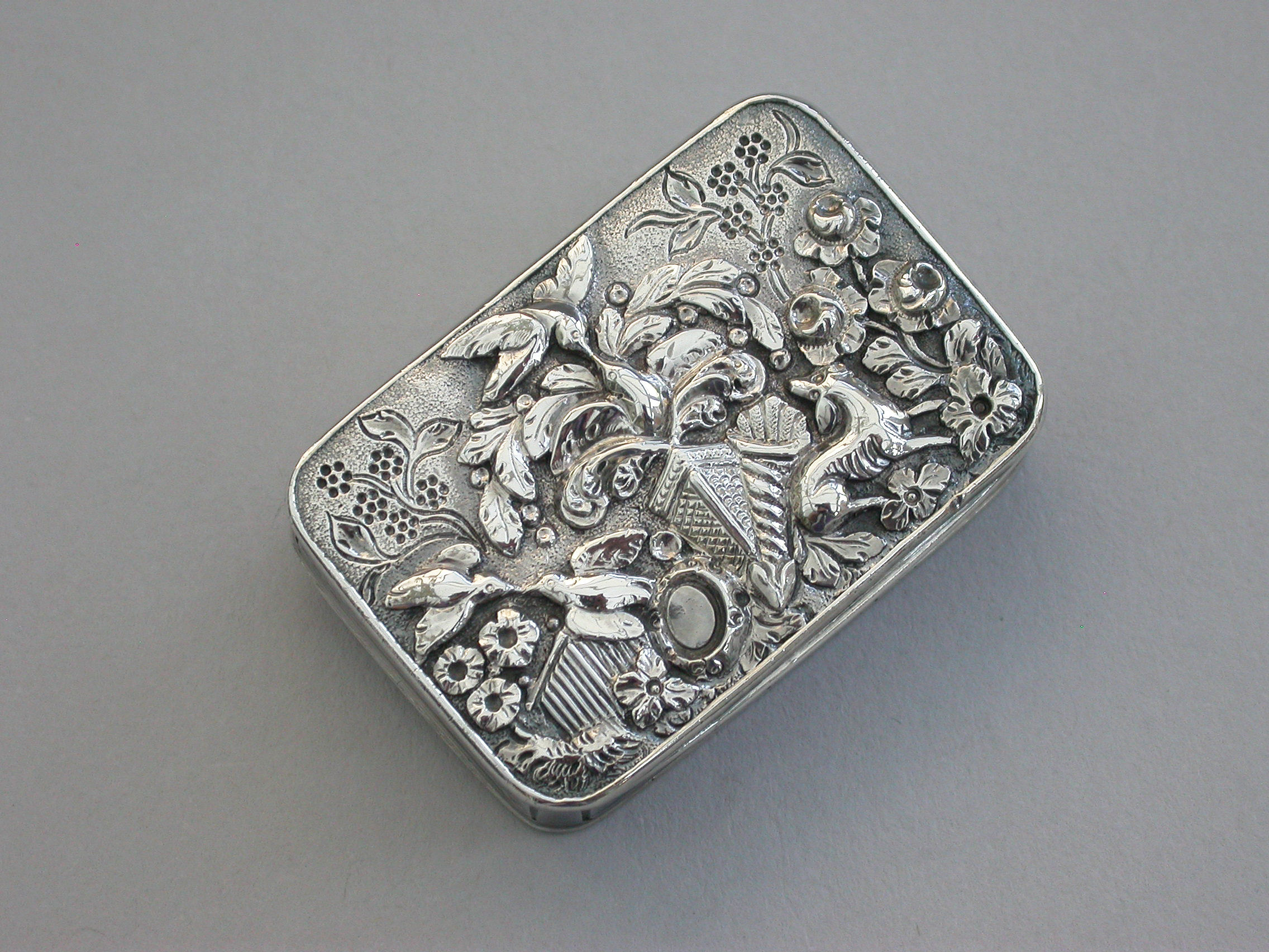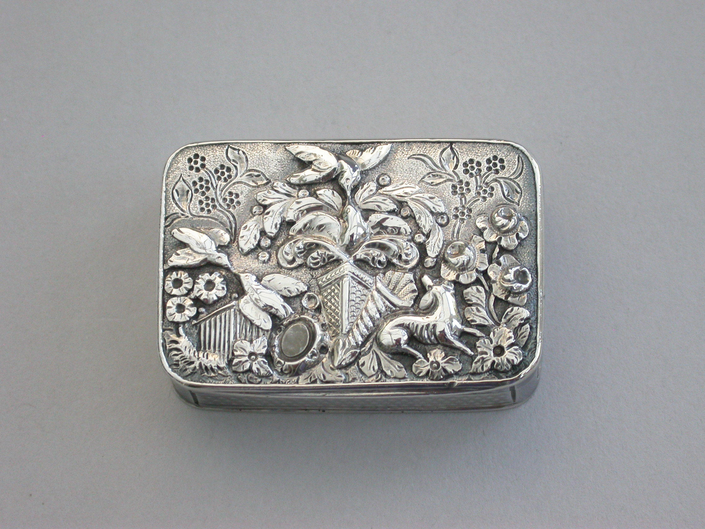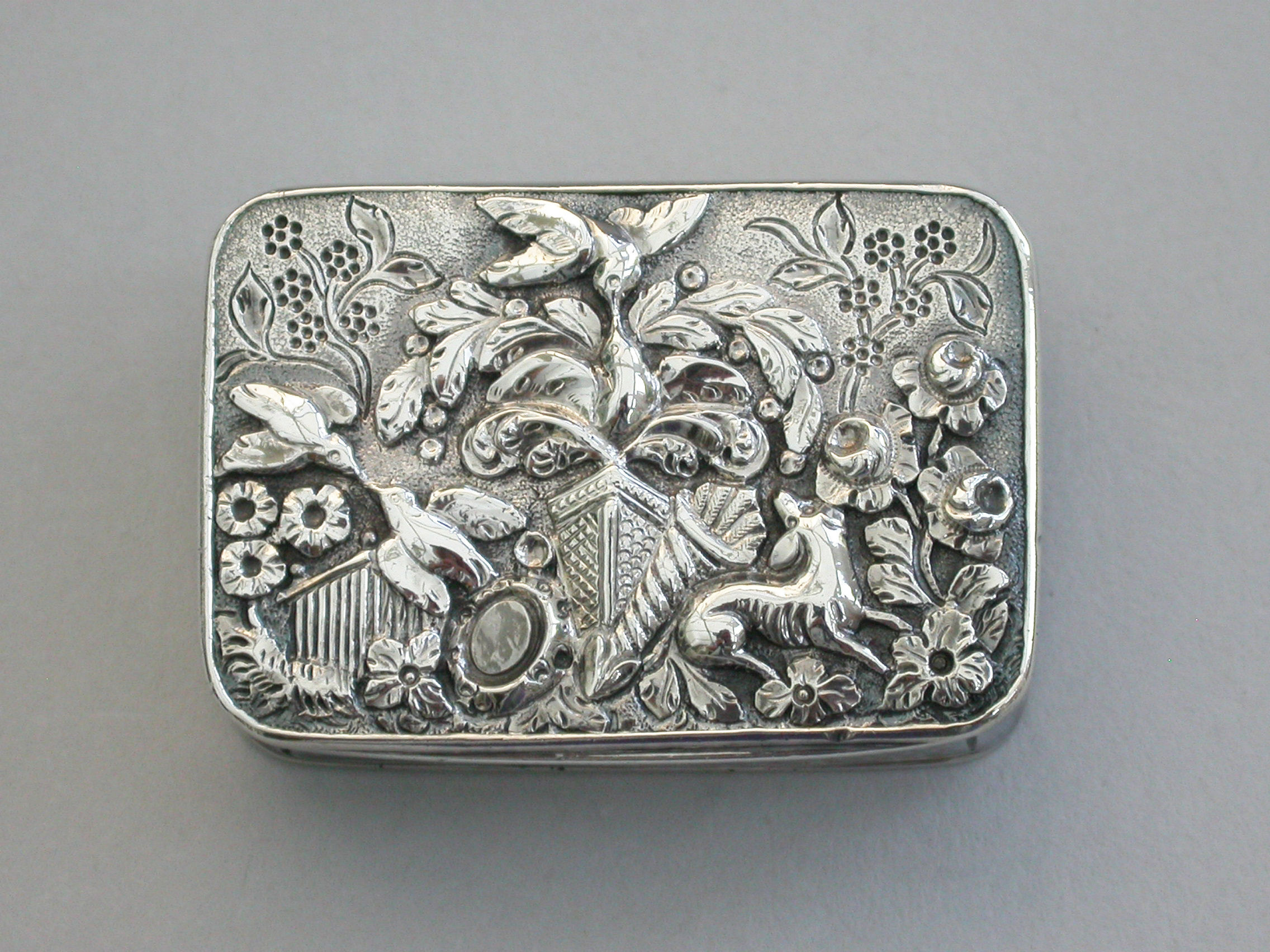 A fine and rare George III silver Vinaigrette of rectangular form with engine turned sides and base, the cast chased and engraved lid decorated with various symbols representing the Greek and Roman Goddesses, including; a mirror for Venus/Aphrodite, goddess of love and fertility, a hound for Artemis/Diana, goddess of chastity and the hunt, a cornucopia containing corn - representing Demeter/Ceres, goddess of the harvest and fertility, Forget Me Nots, representing Mnemosyne, goddess of memory and Mother of the Muses, Primroses, representing Persephone, goddess of Spring, Laurel, representing Daphne daughter of the river god Ladon who requested Zeus to change her into a laurel to escape the attentions of Apollo (representing the triumph of true love), a Temple, probably depicting the Parthenon which was the temple to all goddesses and two pairs of Kingfishers (Halcyon Birds) representing Alcyone and Ceyx and Halcyon Days.
