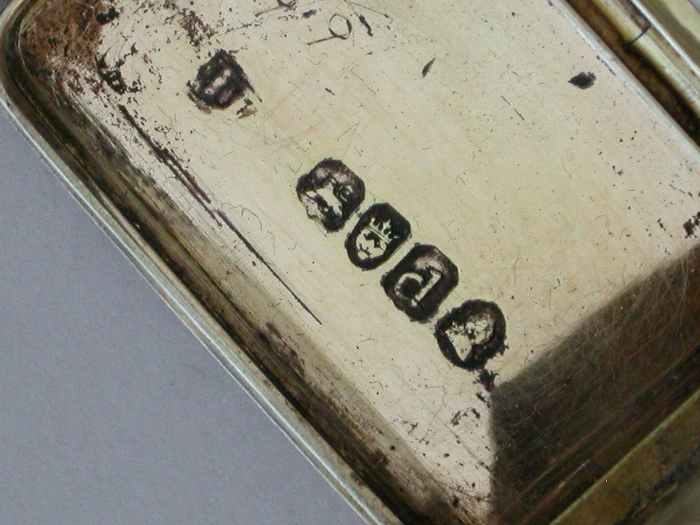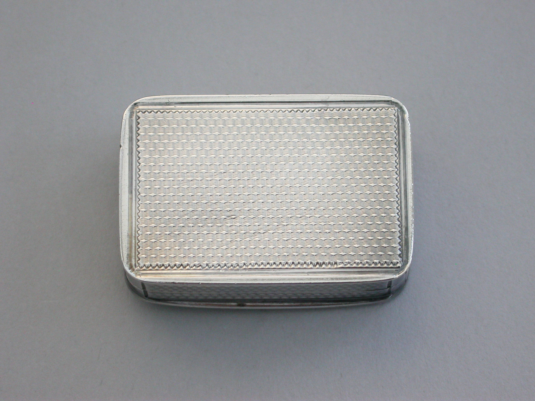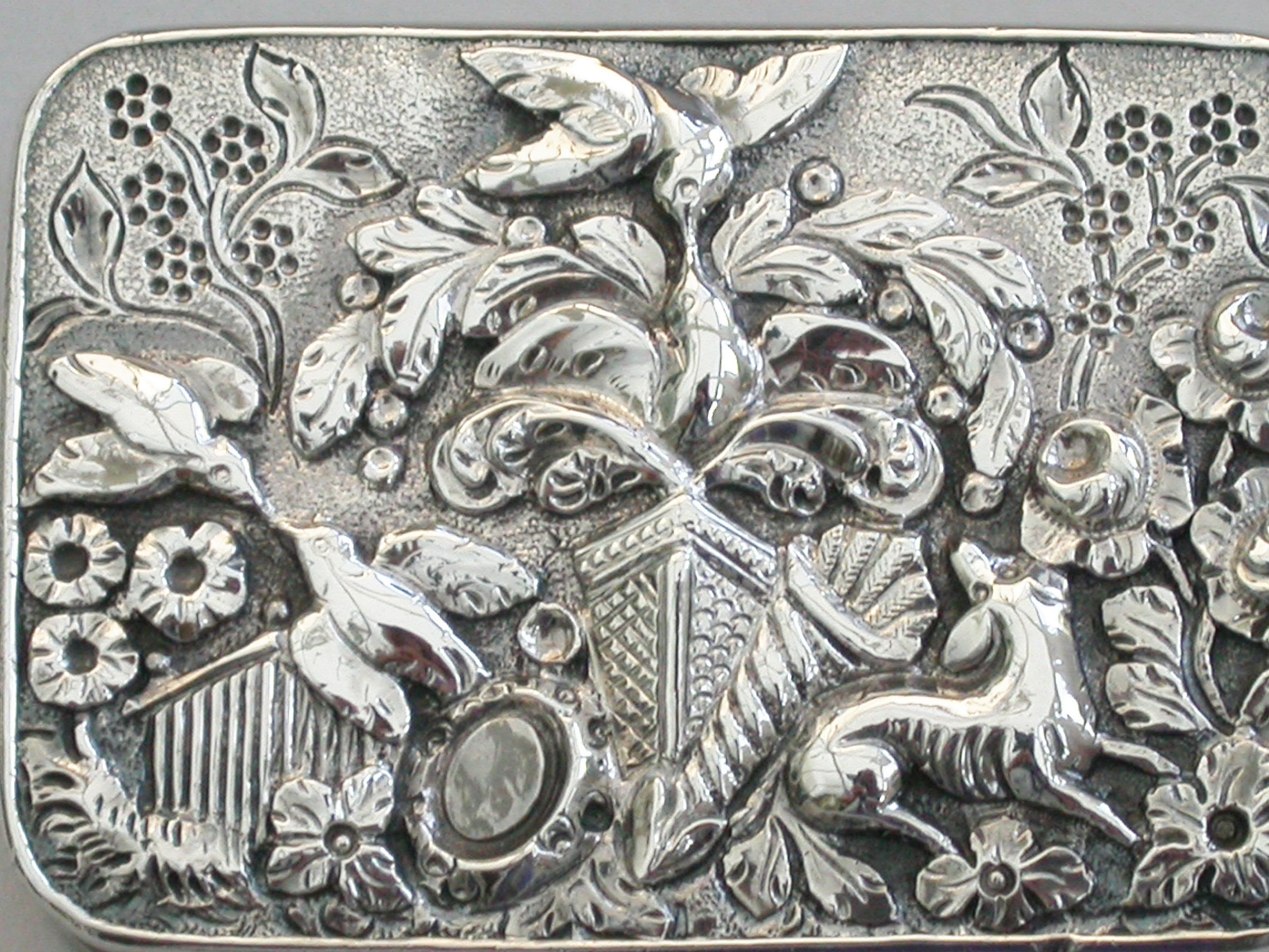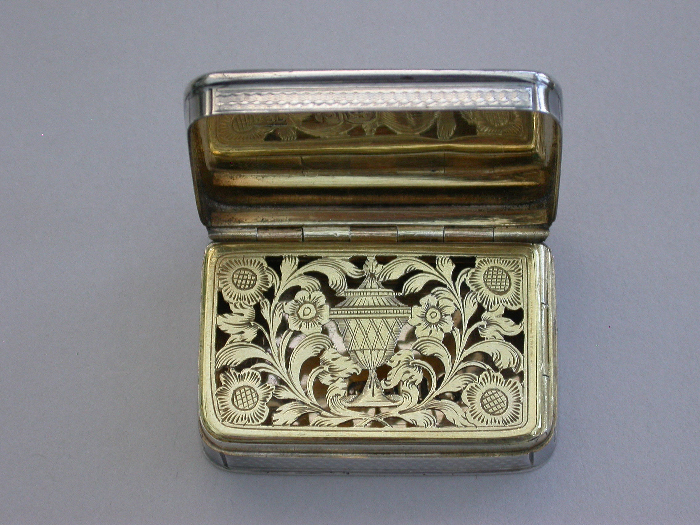 A fine and rare George III silver Vinaigrette of rectangular form with engine turned sides and base, the cast chased and engraved lid decorated with various symbols representing the Greek and Roman Goddesses, including; a mirror for Venus/Aphrodite, goddess of love and fertility, a hound for Artemis/Diana, goddess of chastity and the hunt, a cornucopia containing corn - representing Demeter/Ceres, goddess of the harvest and fertility, Forget Me Nots, representing Mnemosyne, goddess of memory and Mother of the Muses, Primroses, representing Persephone, goddess of Spring, Laurel, representing Daphne daughter of the river god Ladon who requested Zeus to change her into a laurel to escape the attentions of Apollo (representing the triumph of true love), a Temple, probably depicting the Parthenon which was the temple to all goddesses and two pairs of Kingfishers (Halcyon Birds) representing Alcyone and Ceyx and Halcyon Days.