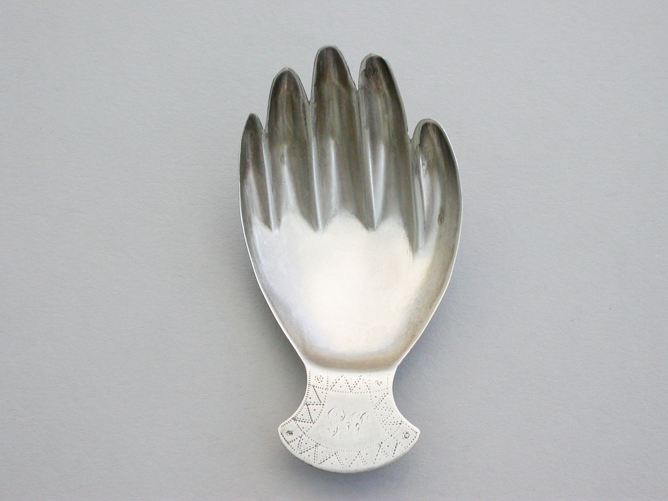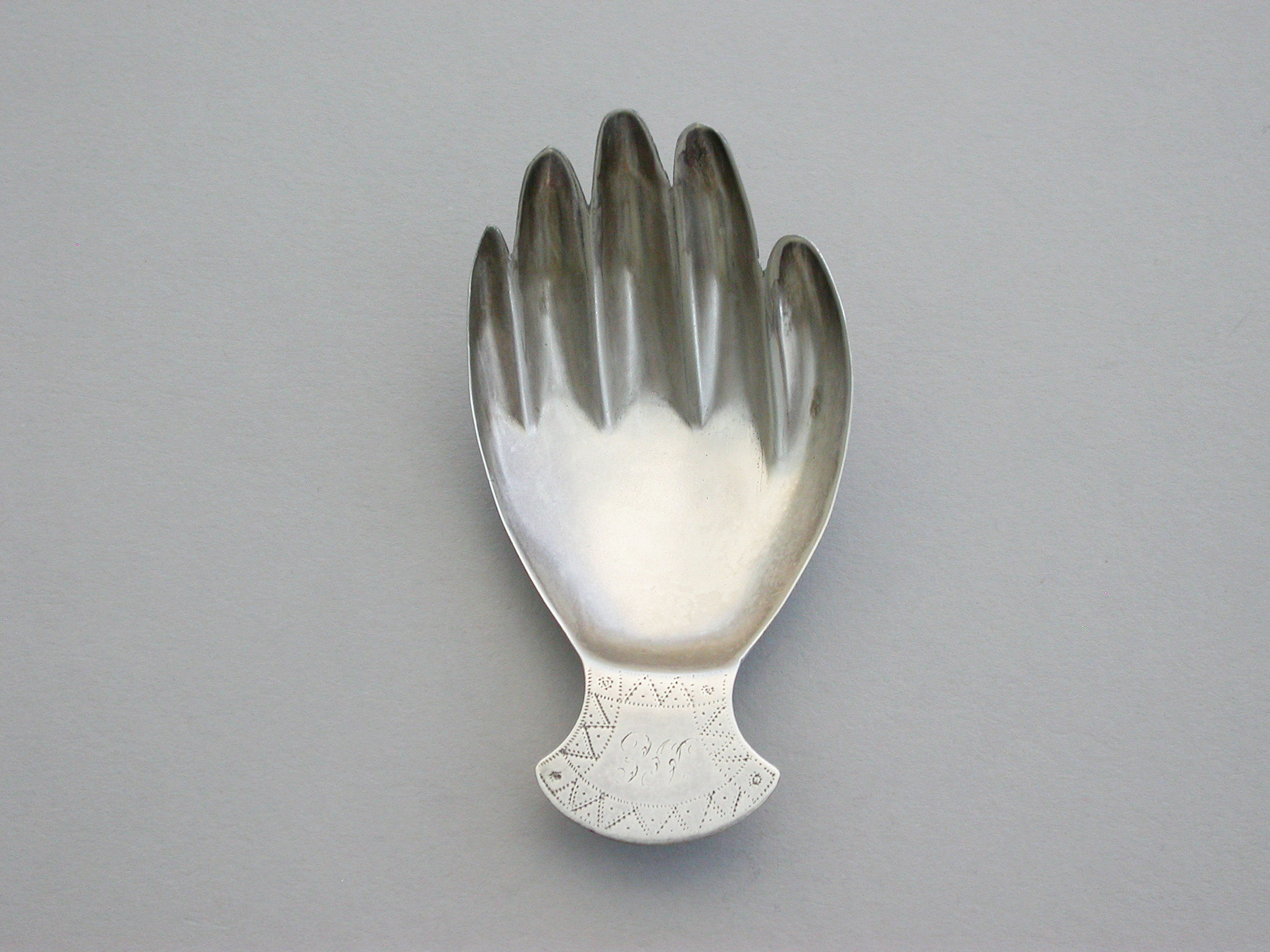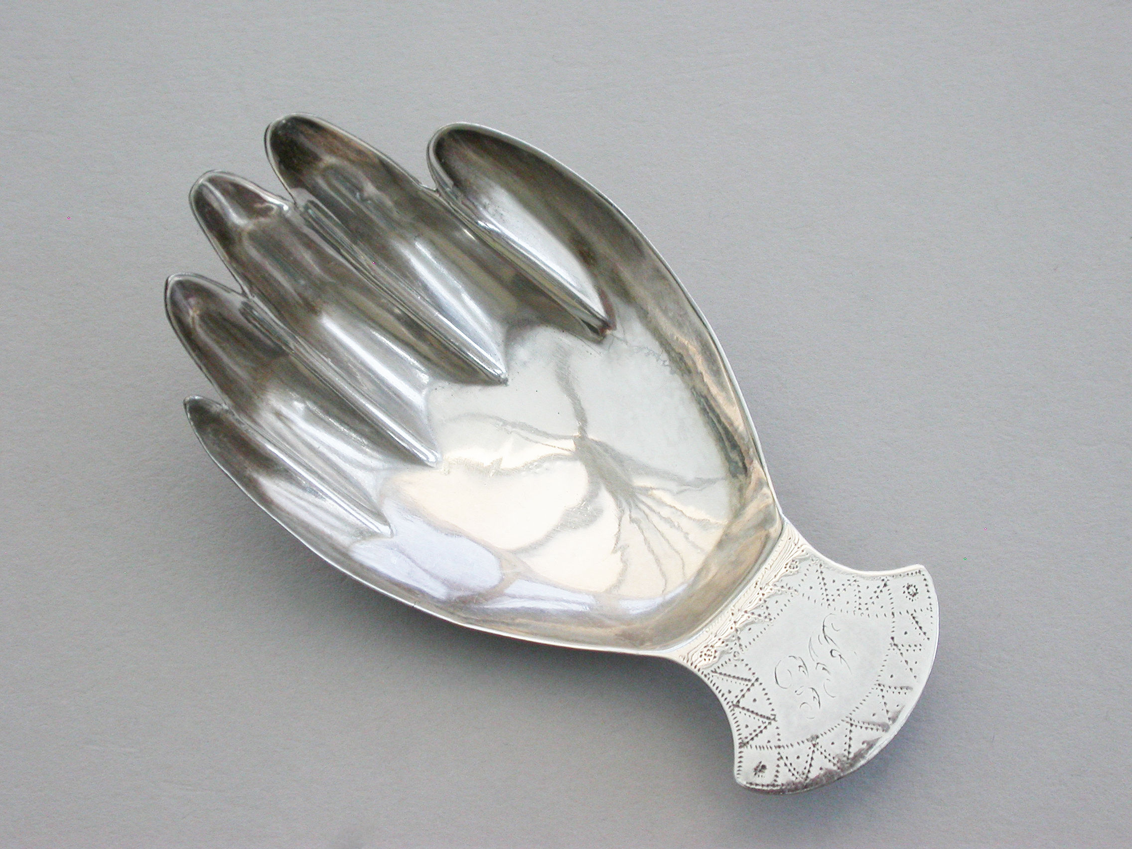 A rare George III silver Caddy Spoon, made in the form of a right hand, the cuff shaped handle with prick-dot engraved decoration and engraved with initials.
