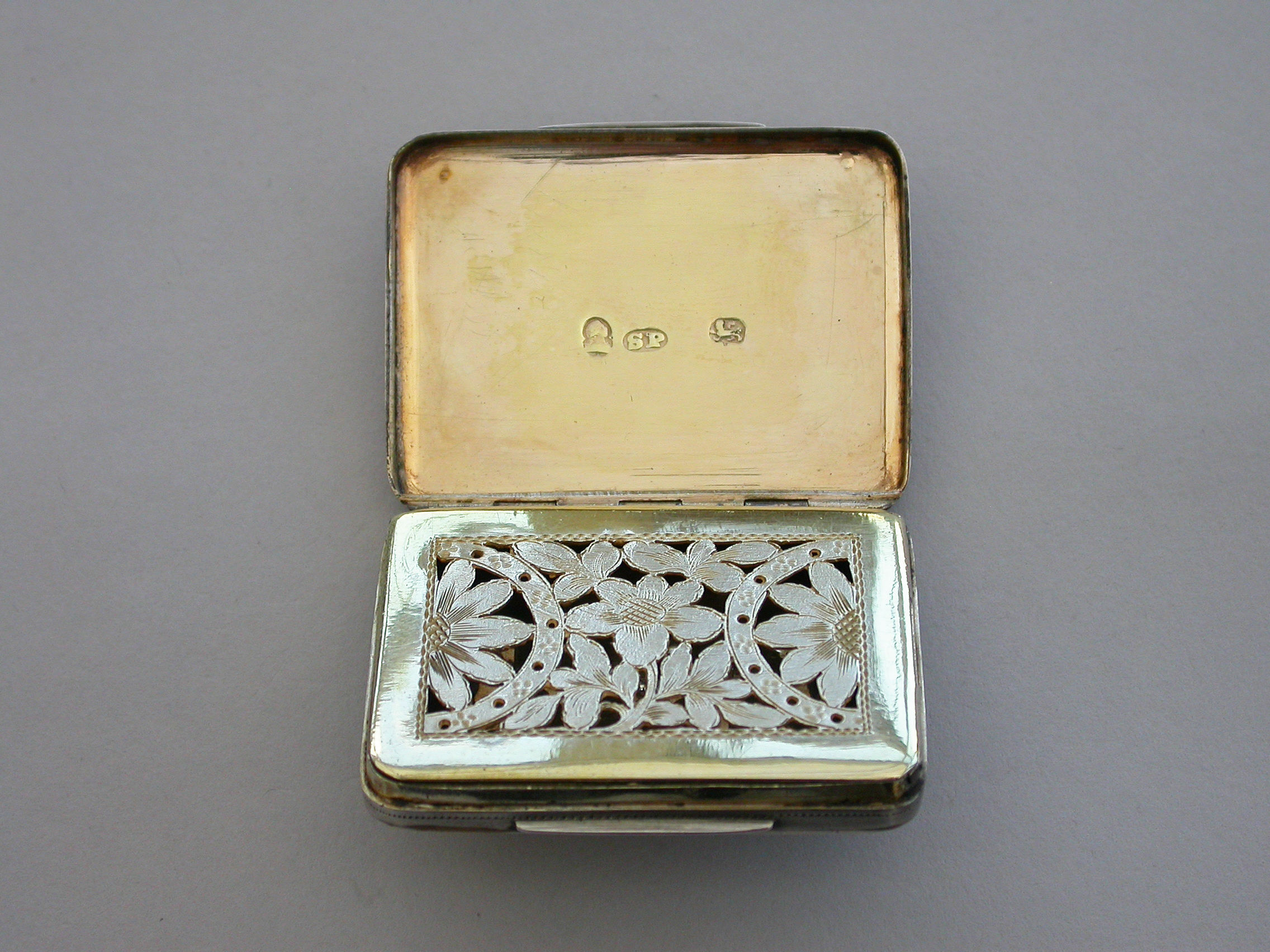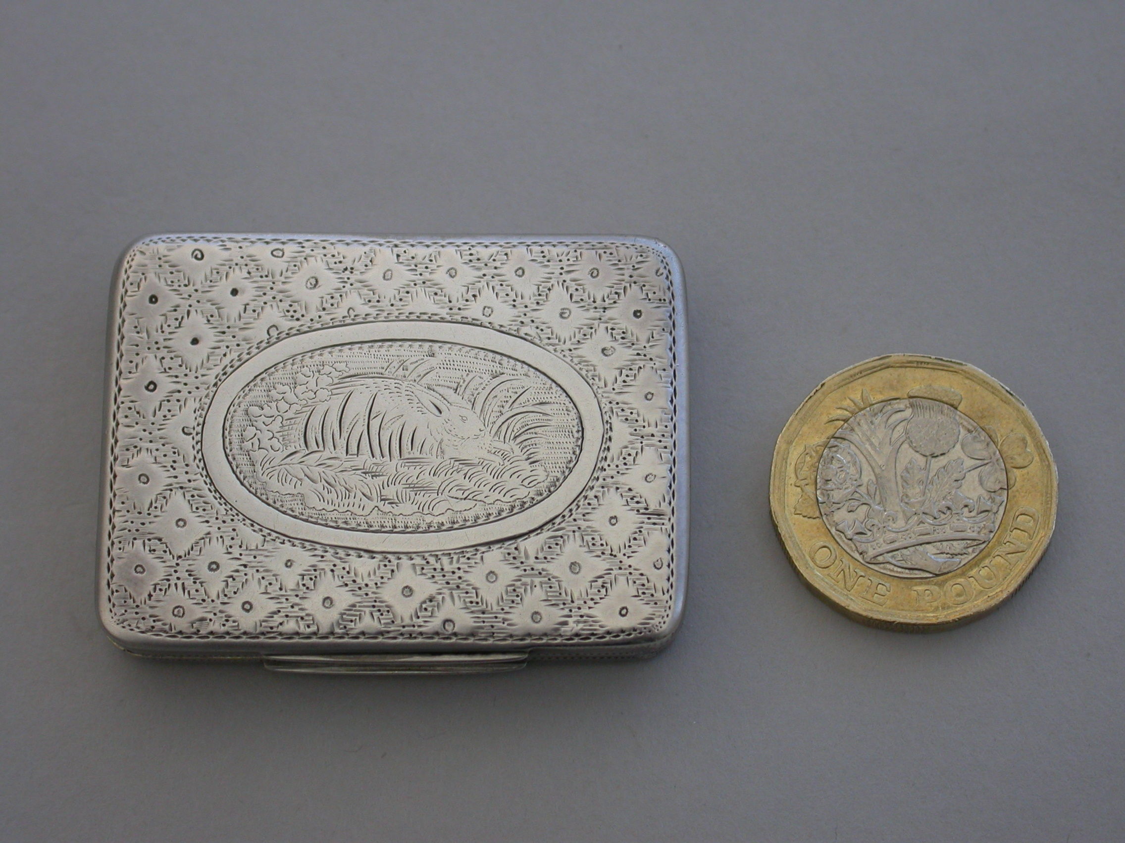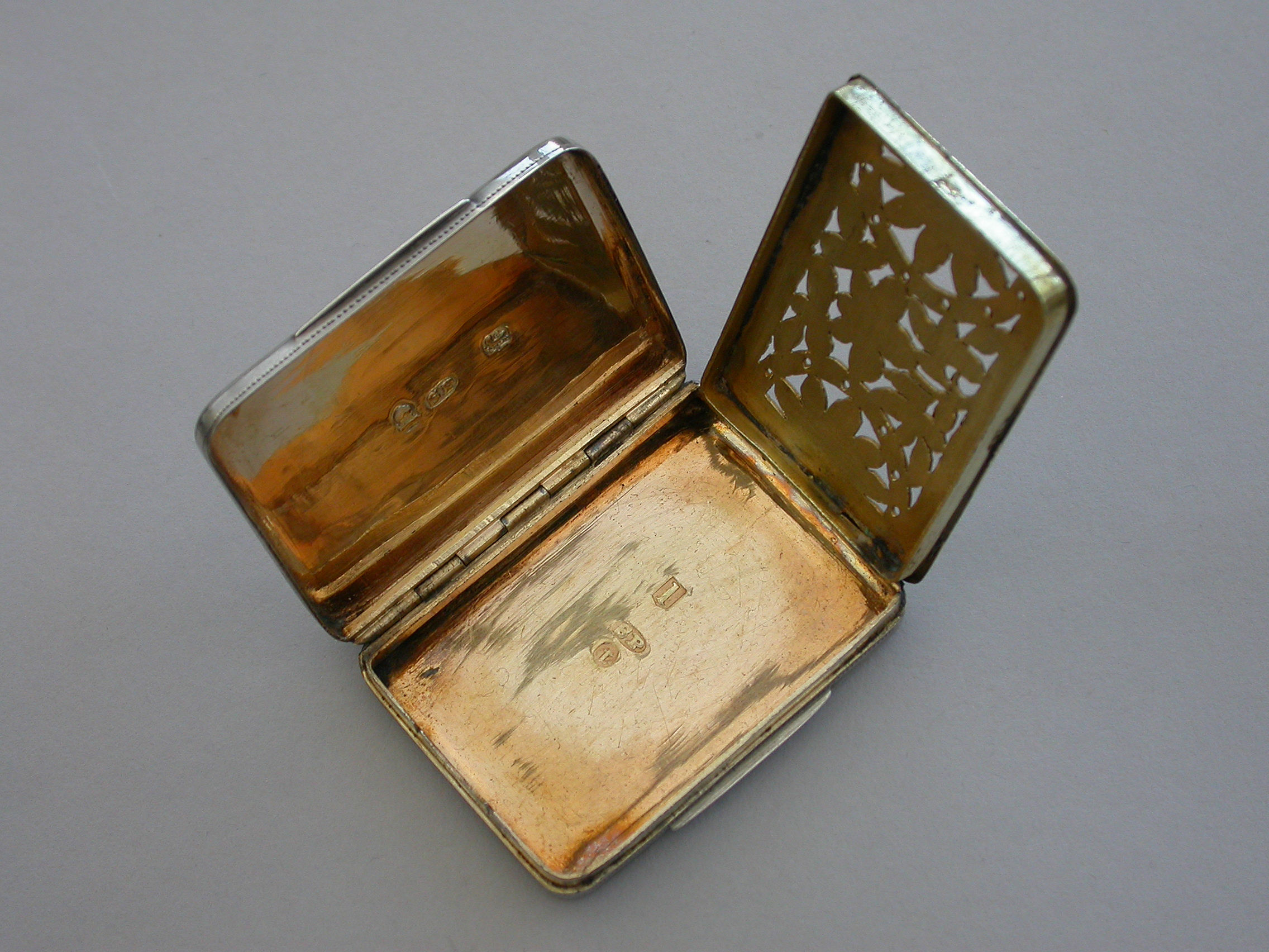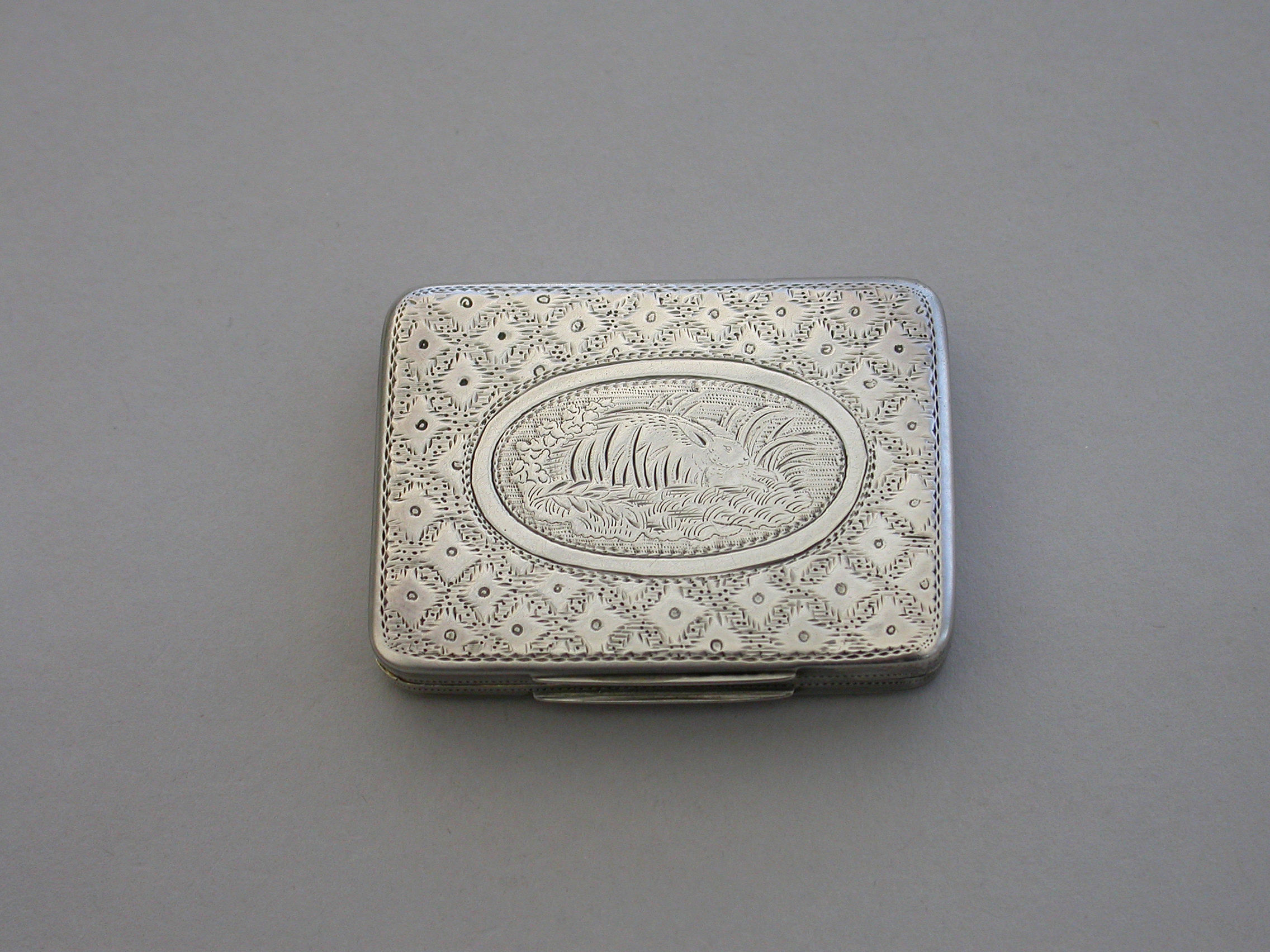 A rare large George III silver Vinaigrette of flat rectangular form, the lid with oval plaque hand engraved with the 'Hare in Reeds' (designed by Thomas Bewick), surrounded by paterae. The silver gilt grille pierced with central flower head and foliage.