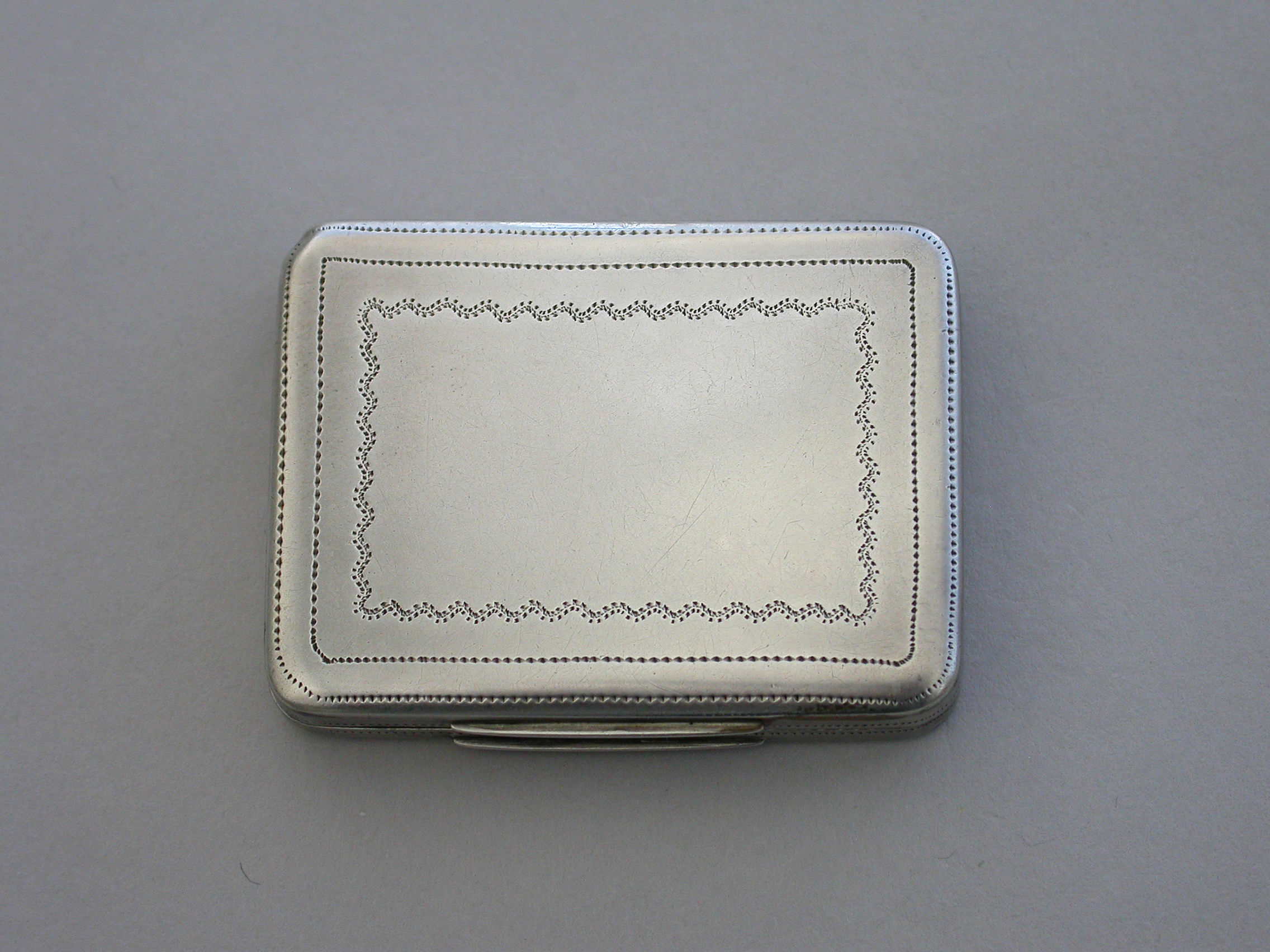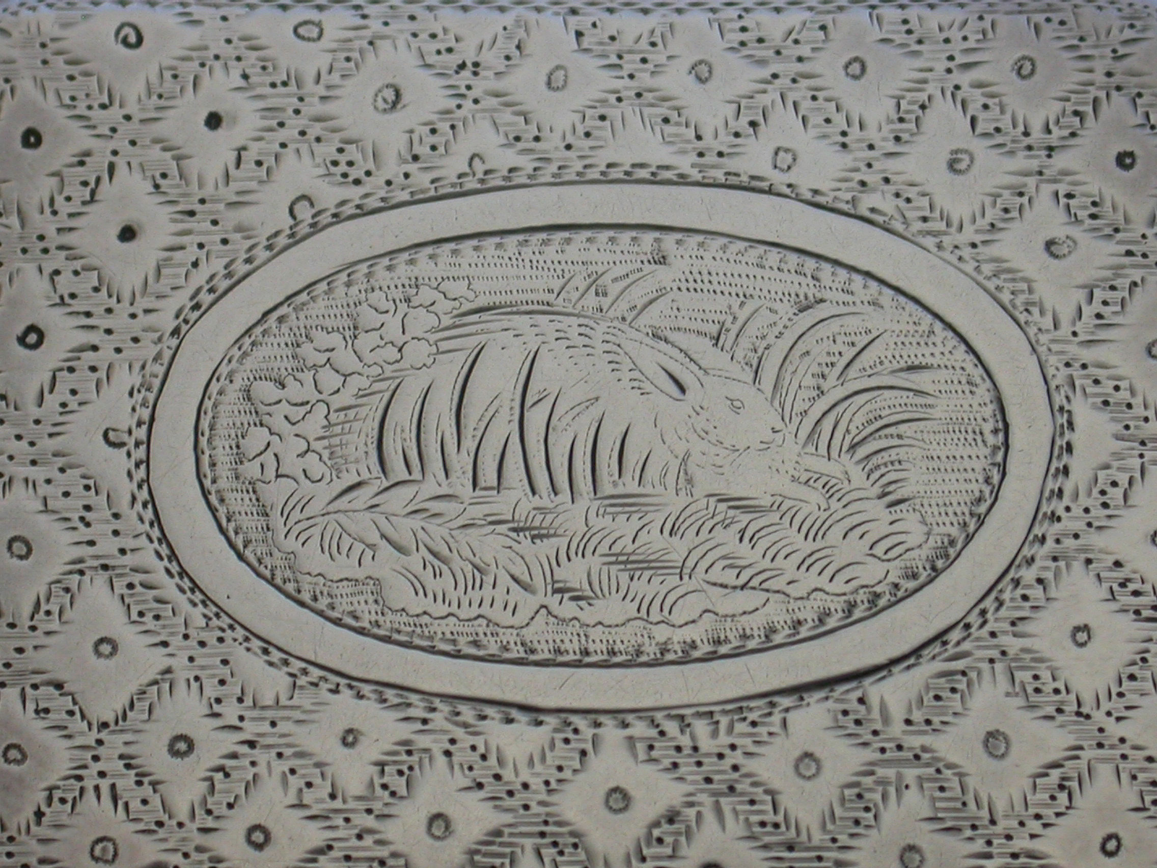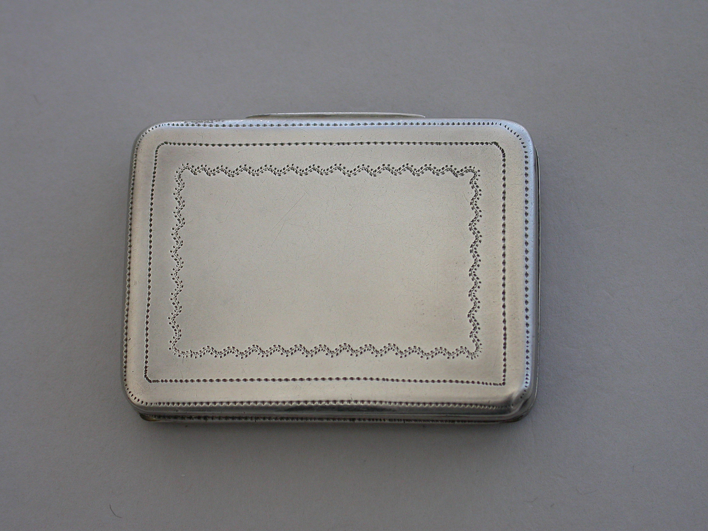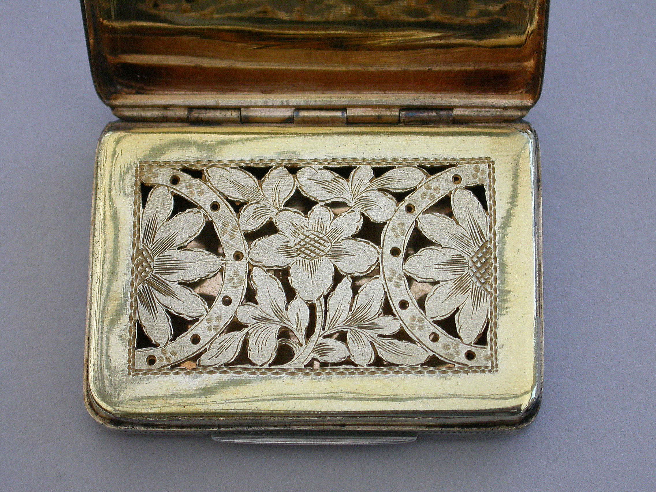 A rare large George III silver Vinaigrette of flat rectangular form, the lid with oval plaque hand engraved with the 'Hare in Reeds' (designed by Thomas Bewick), surrounded by paterae. The silver gilt grille pierced with central flower head and foliage.