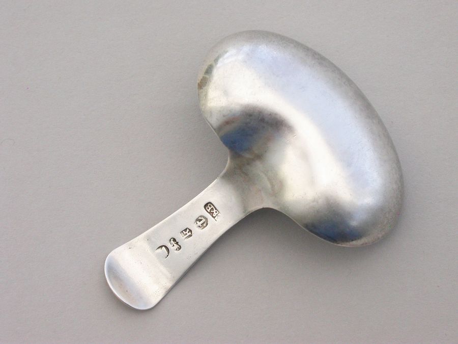 A rare George III silver Caddy Spoon, the kidney shaped bowl engraved with foliate sprigs and wriggle work borders, curved Old English handle.
