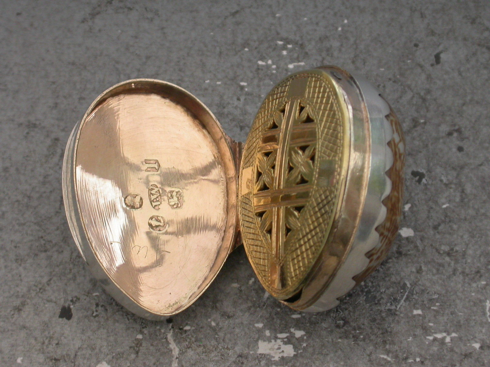 A fine and rare George III silver mounted cowrie shell Vinaigrette of the genus 'Cypraea Arabica', of shaped oval elliptical form, the silver gilt interior with finely pierced quatrefoil and diaper grille.