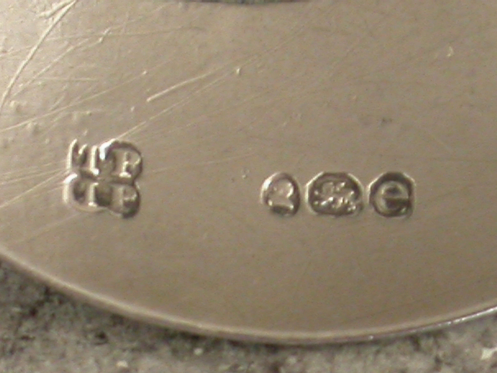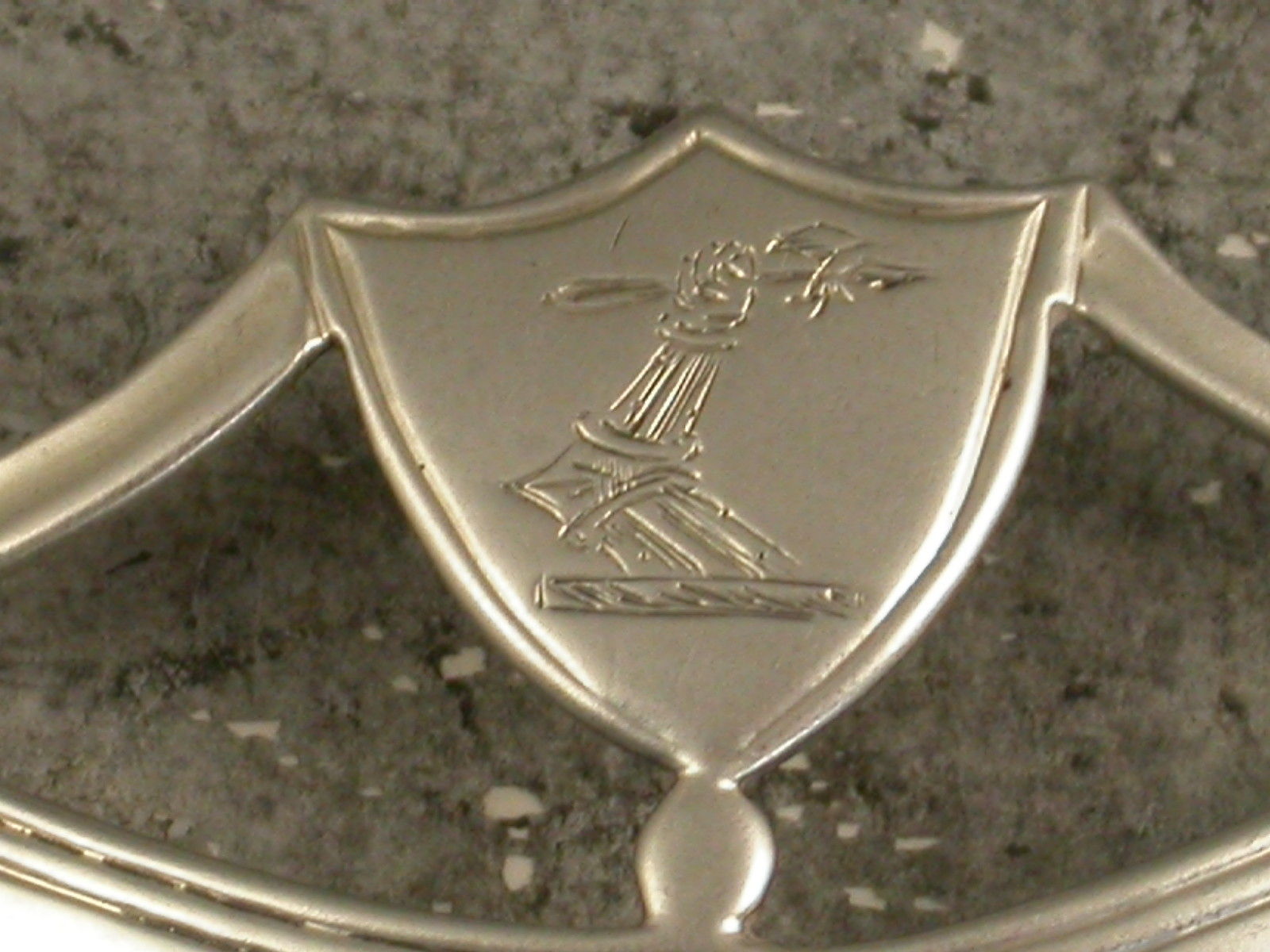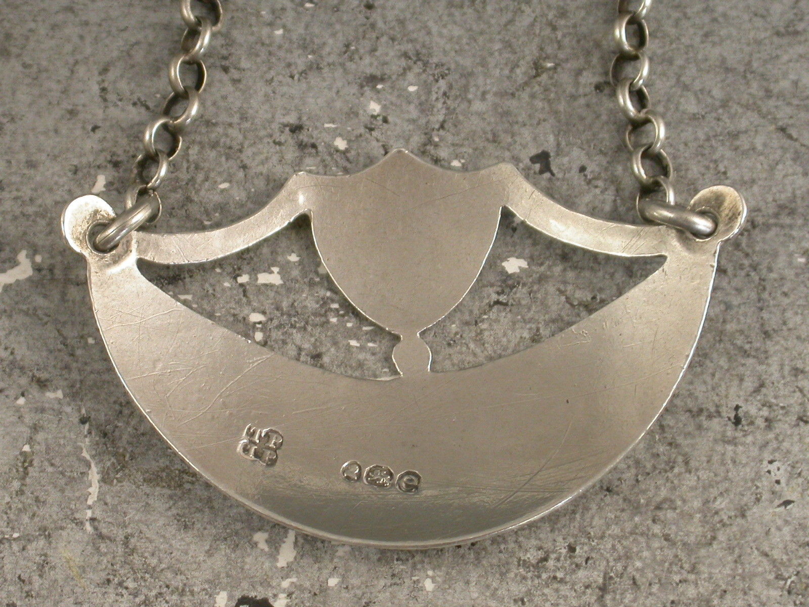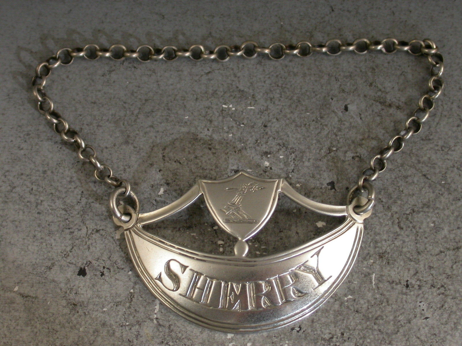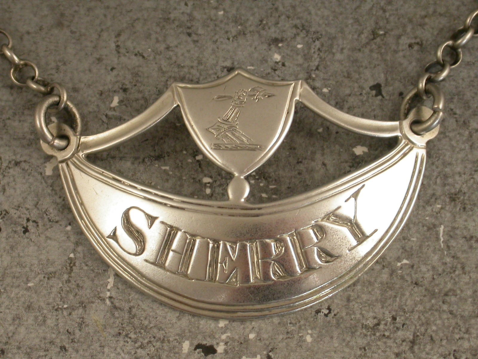 A fine and rare George III silver Wine Label of open crescent form with shield above, reeded border and supports, the shield engraved with a crest depicting an arm in armour holding a battle axe (that of many families), incised for Sherry.