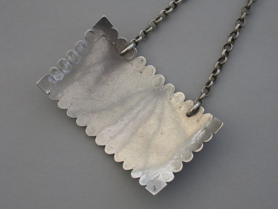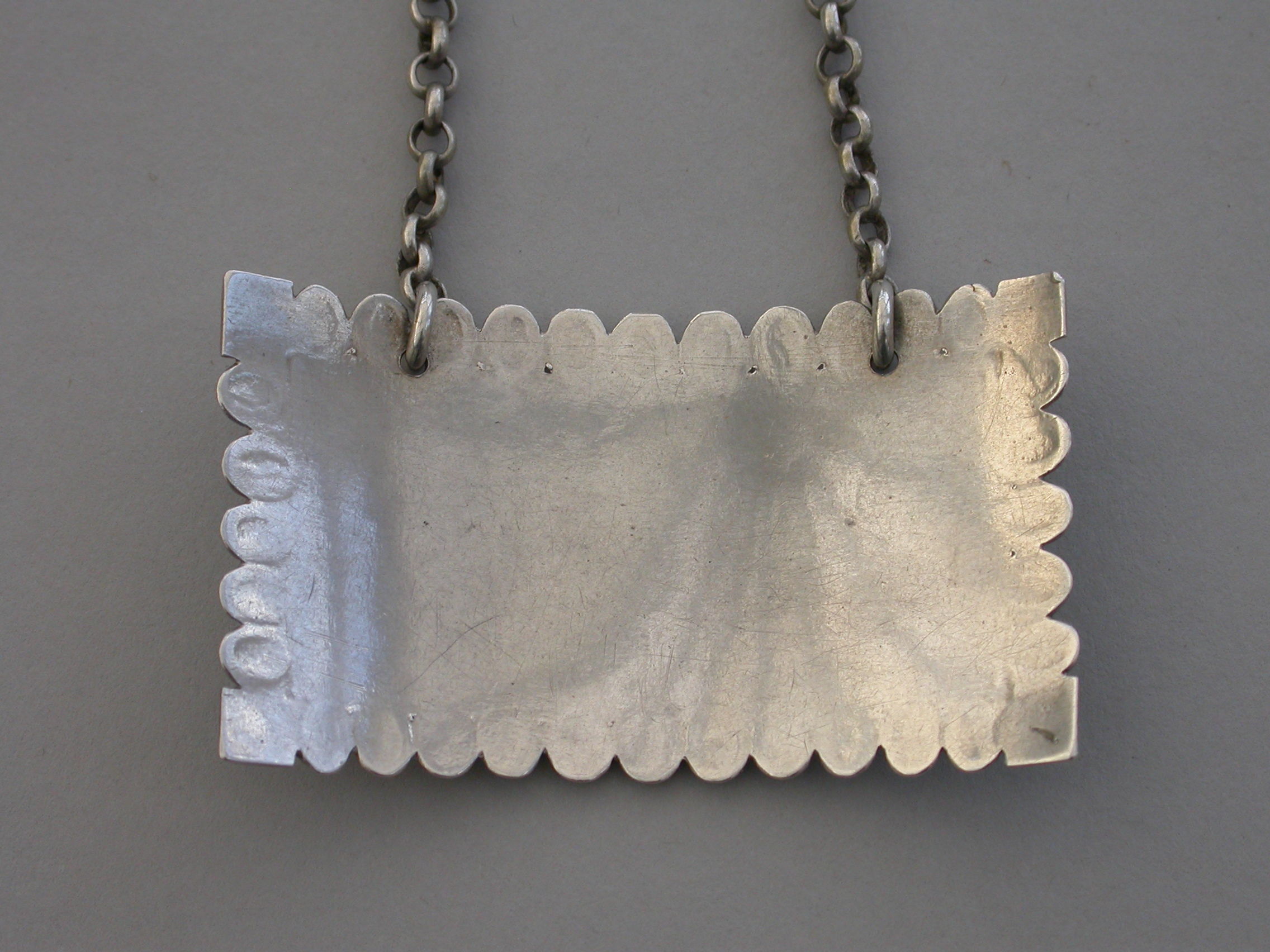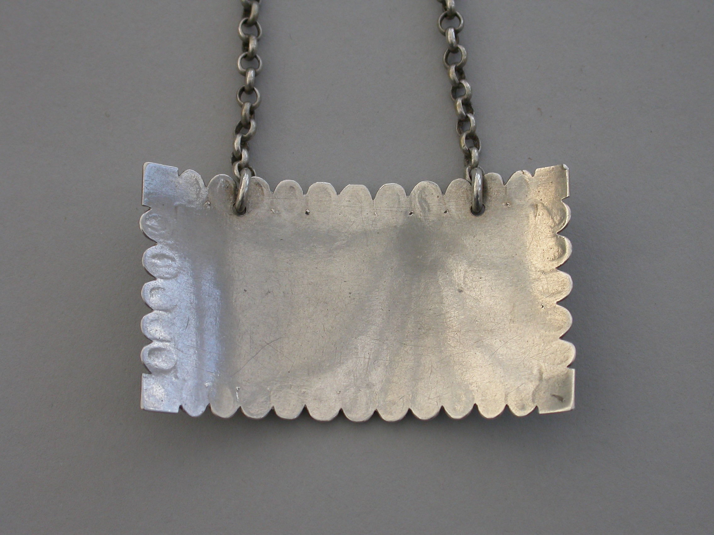 An extremely rare early George III silver Wine Label of large broad rectangular form with ovolo border (eleven eggs top and bottom and five each side), an engraved floral device to each corner, incised for Mountain.