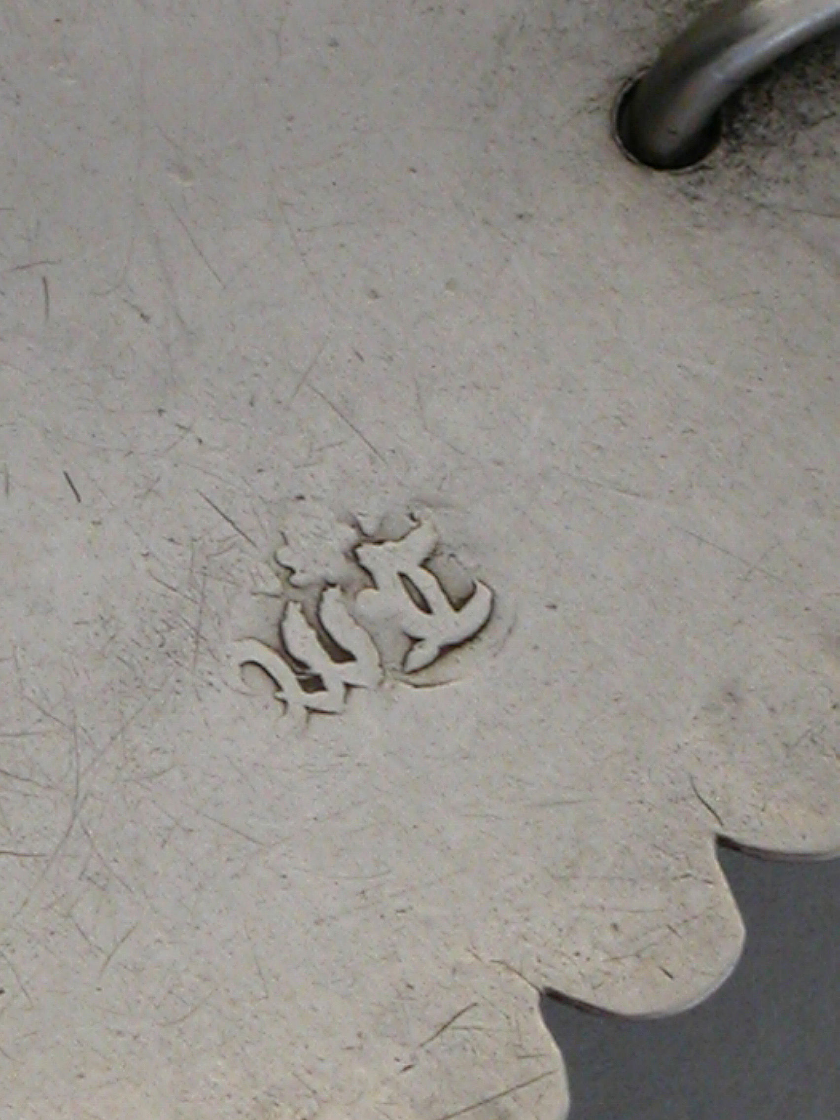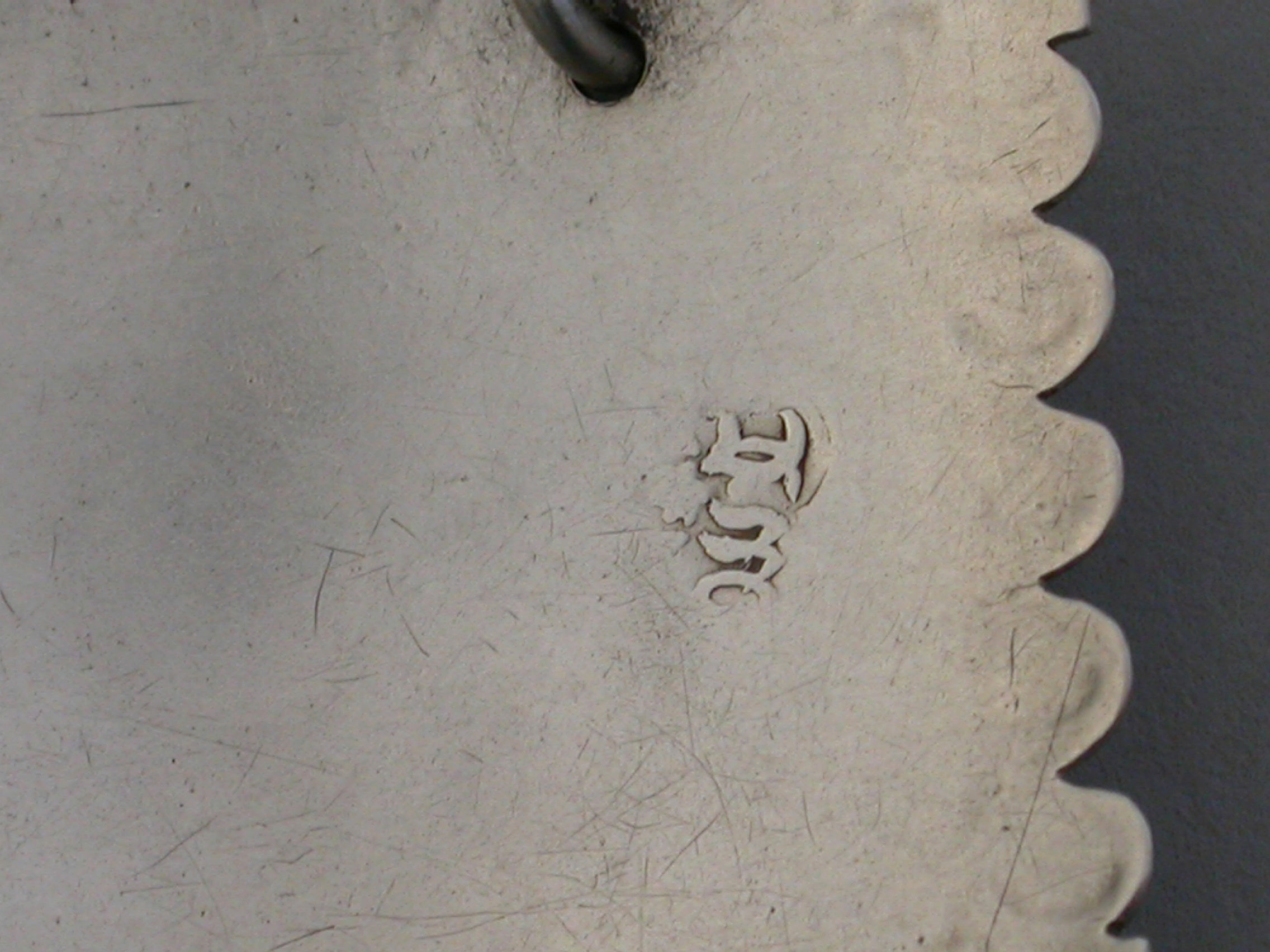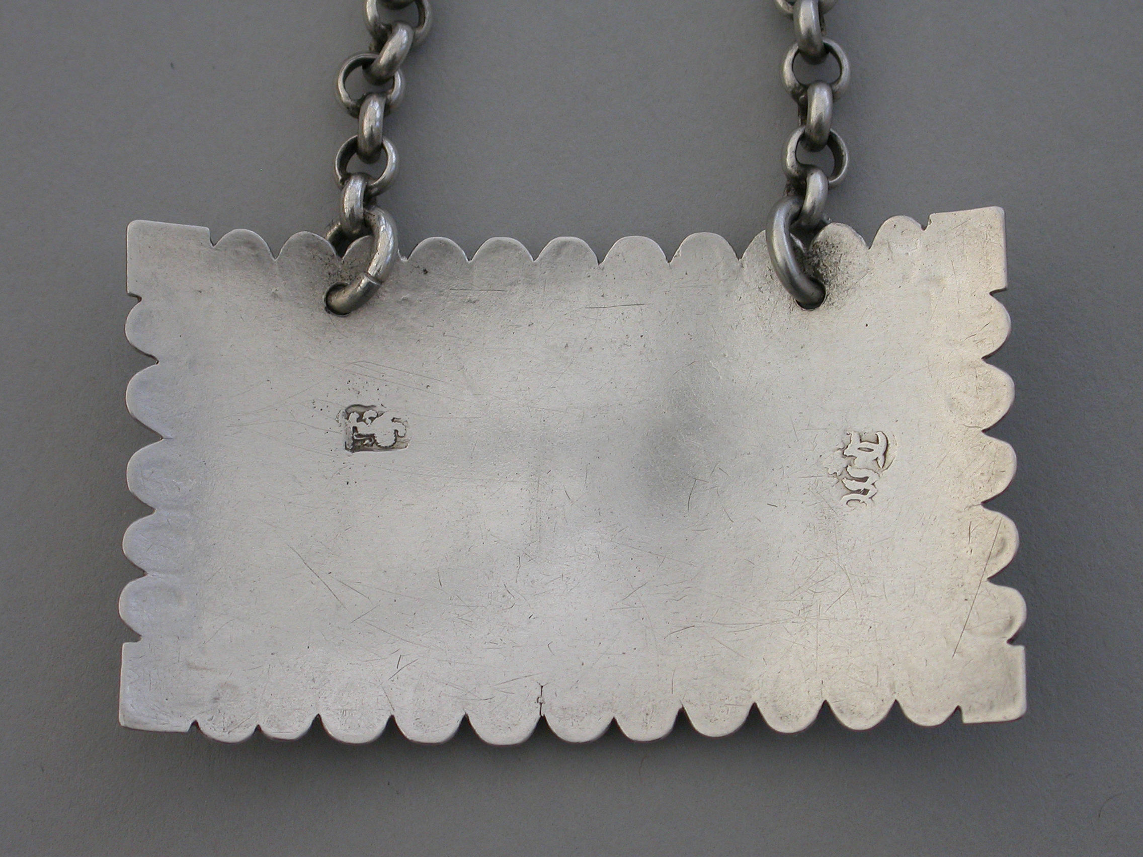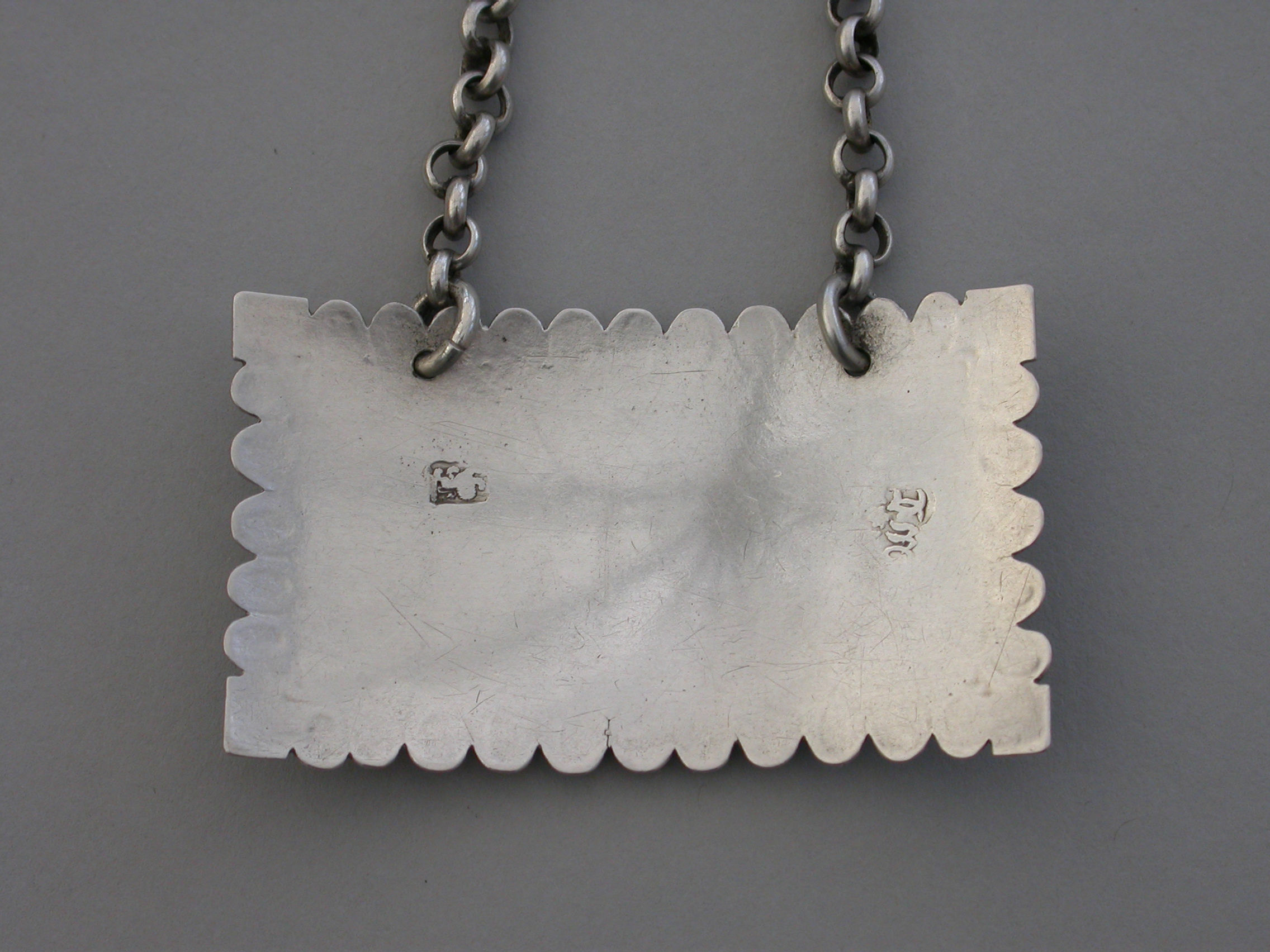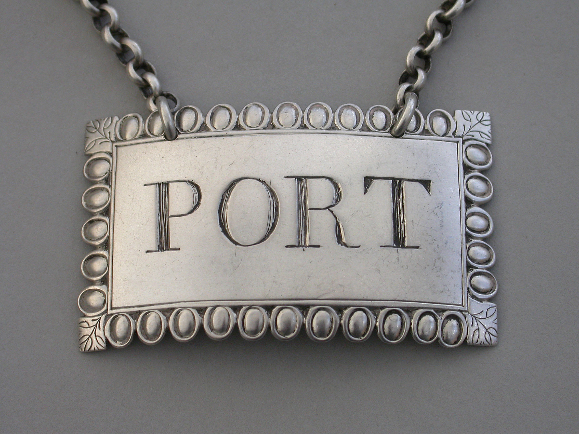 An extremely rare early George III silver Wine Label of large broad rectangular form with ovolo border (eleven eggs top and bottom and five each side), an engraved floral device to each corner, incised for Port.