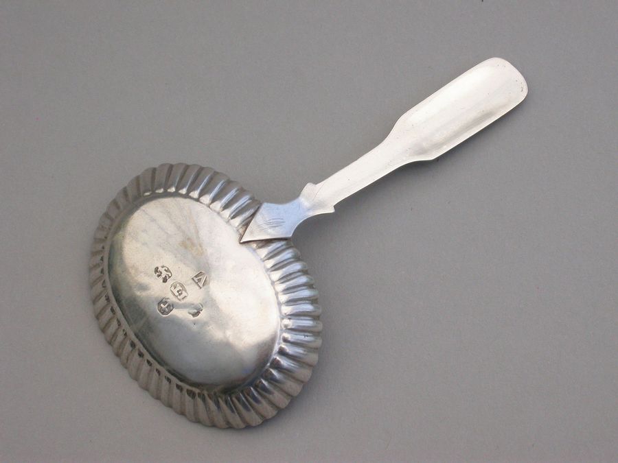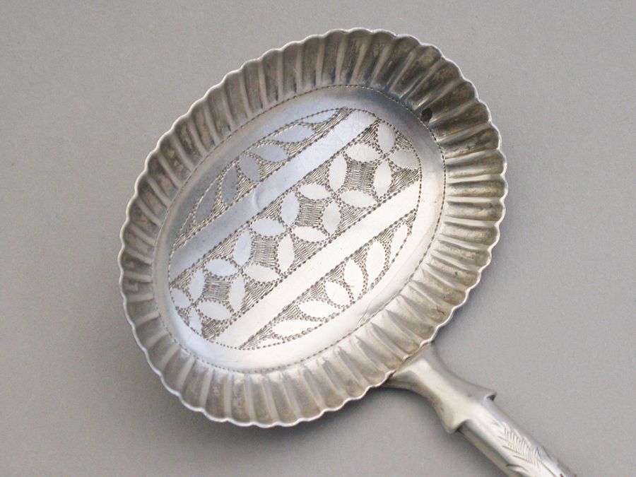 A good George III silver Caddy Spoon, the bright-cut engraved oval bowl with pie crust border, the hollow fiddle pattern handle with shoulders.