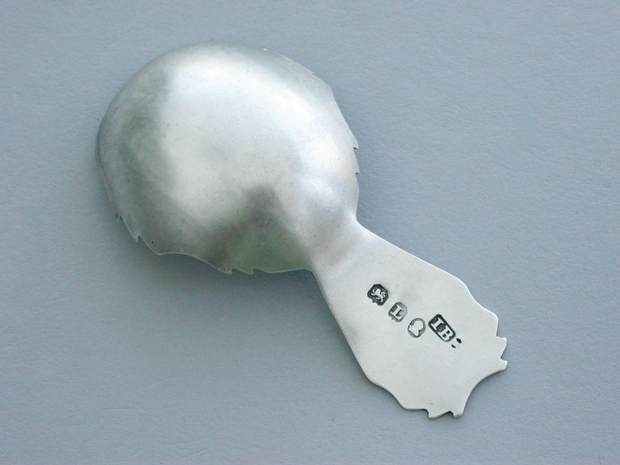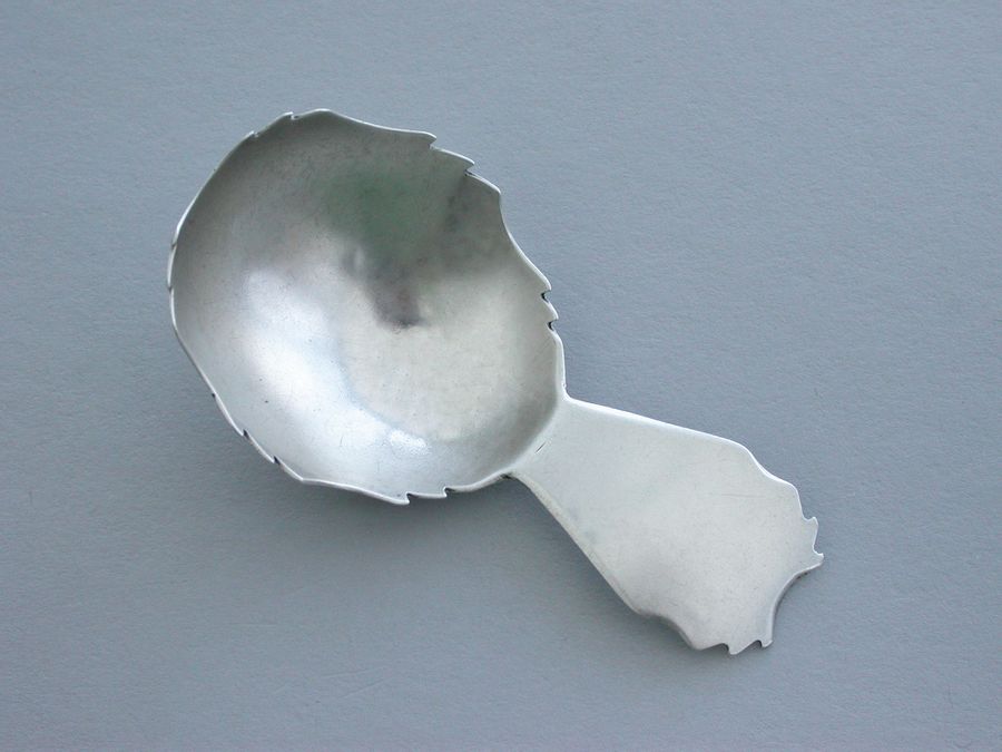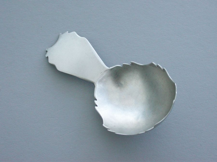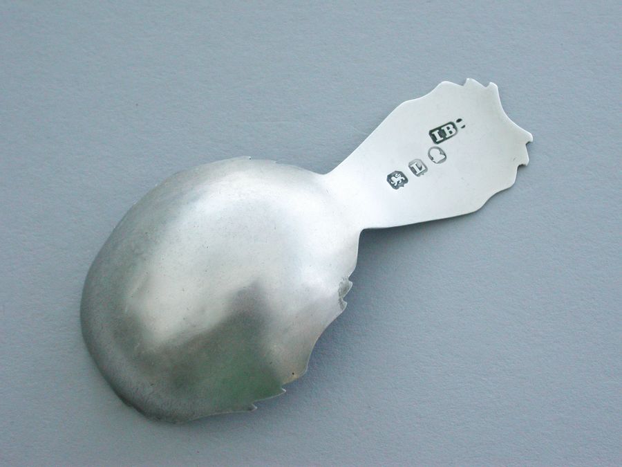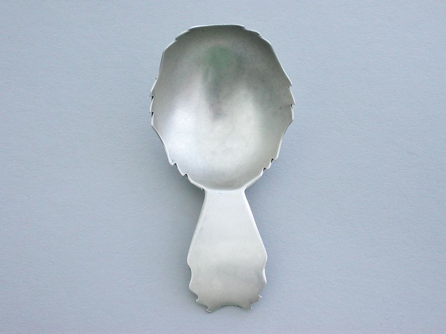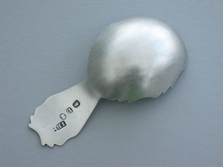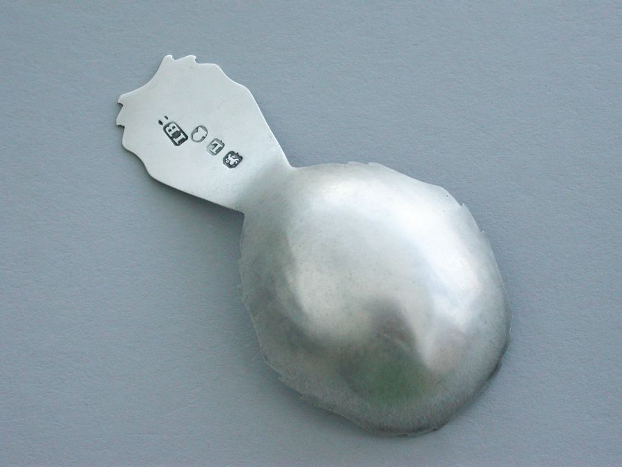 An unusual George III plain silver Caddy Spoon with deep oval bowl with cut-out rim, the handle with similar cut-out edge in the form of a pineapple.