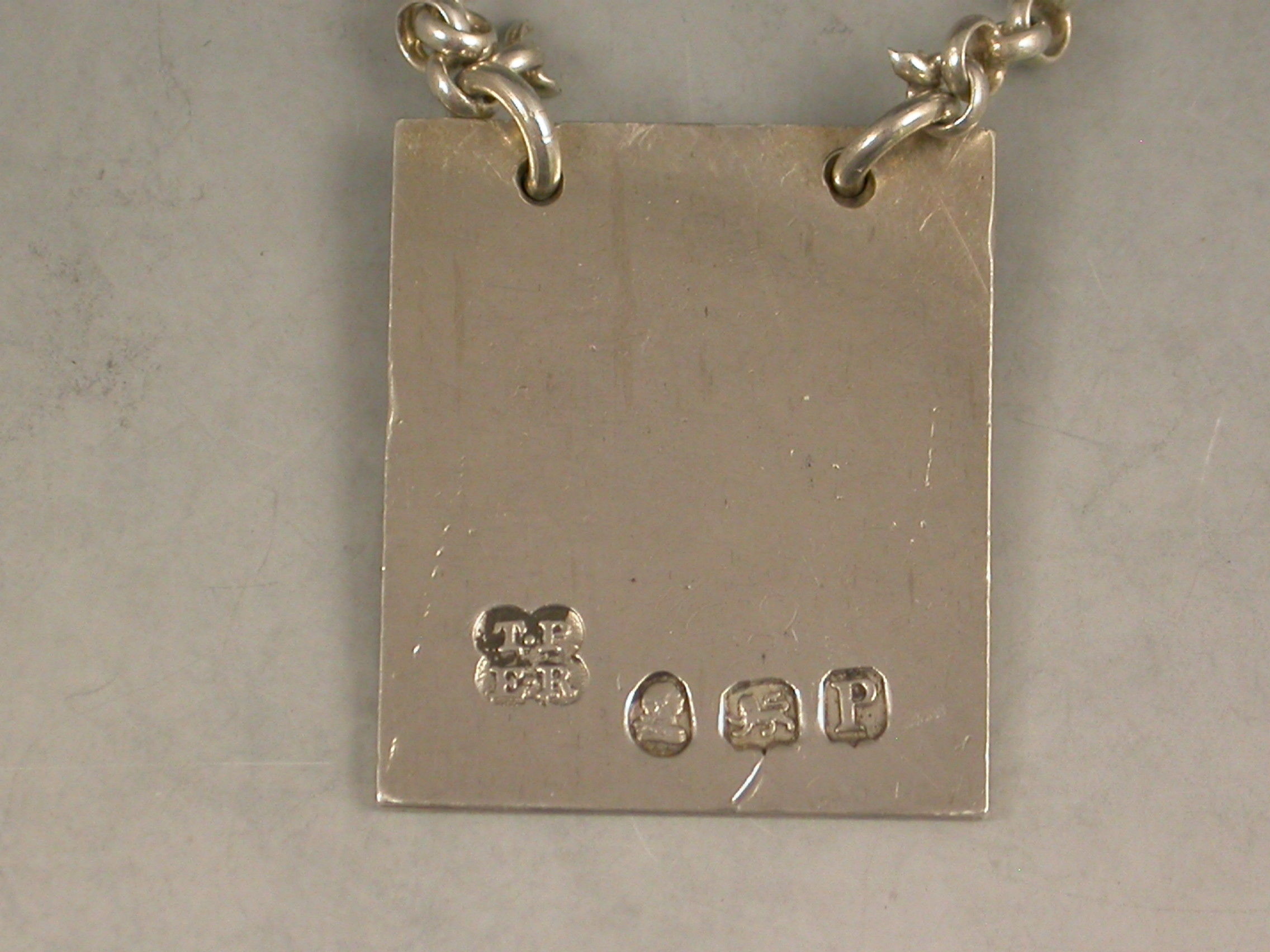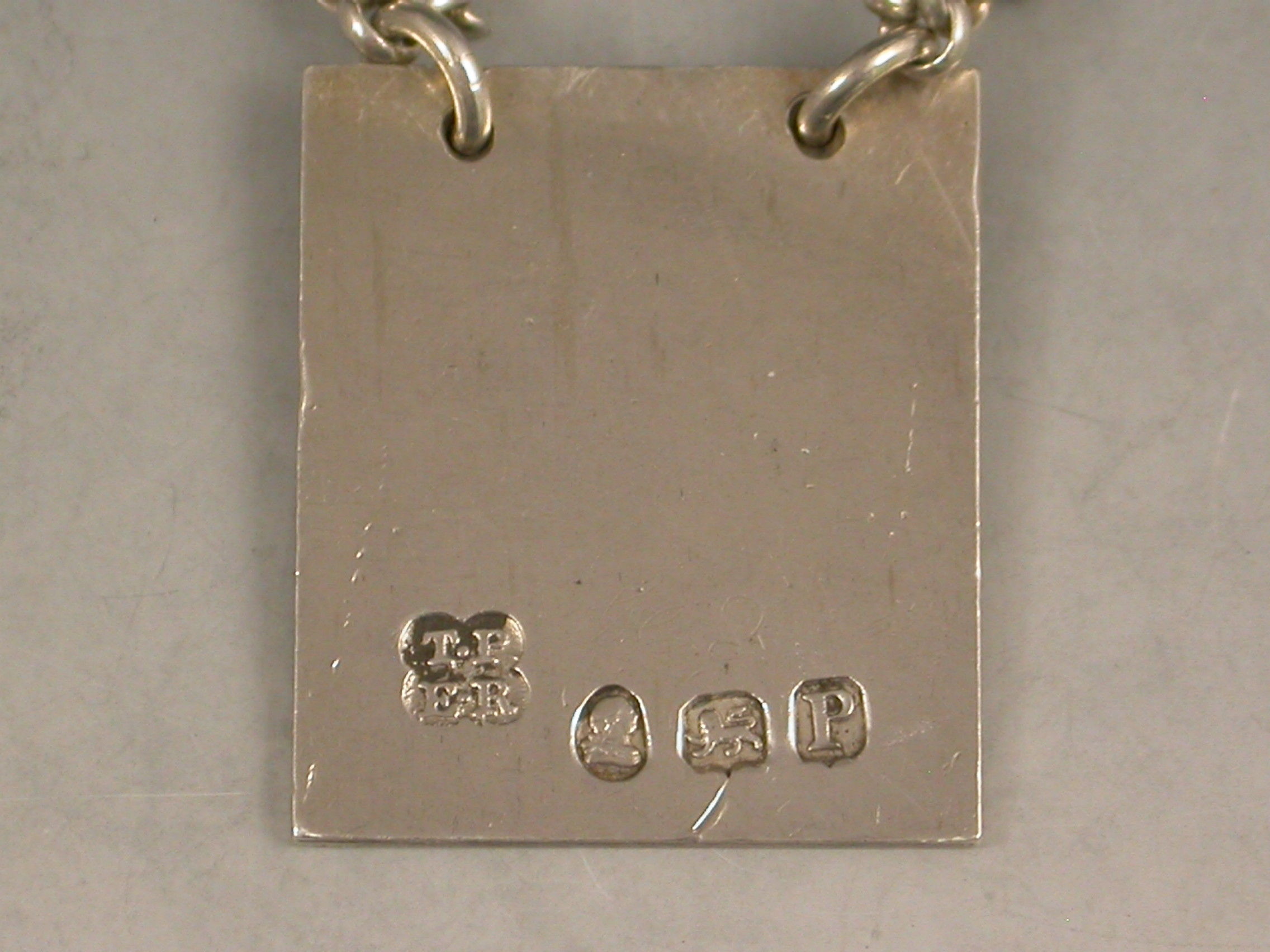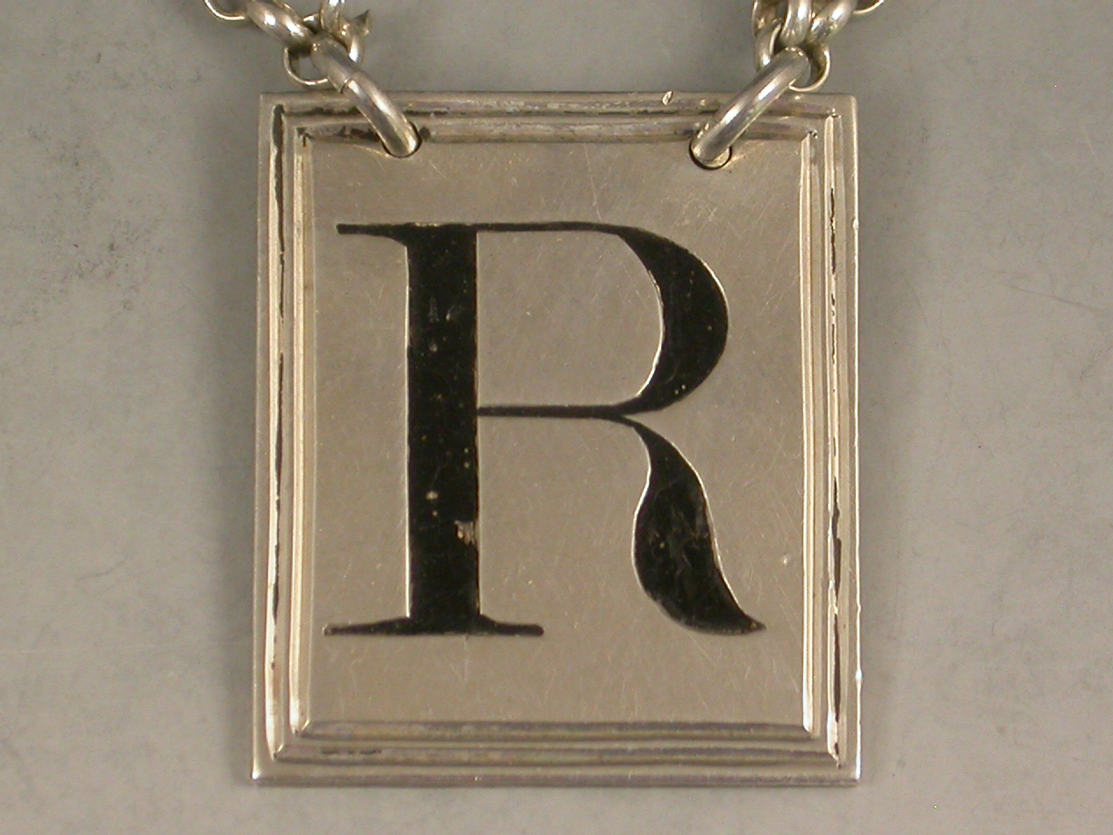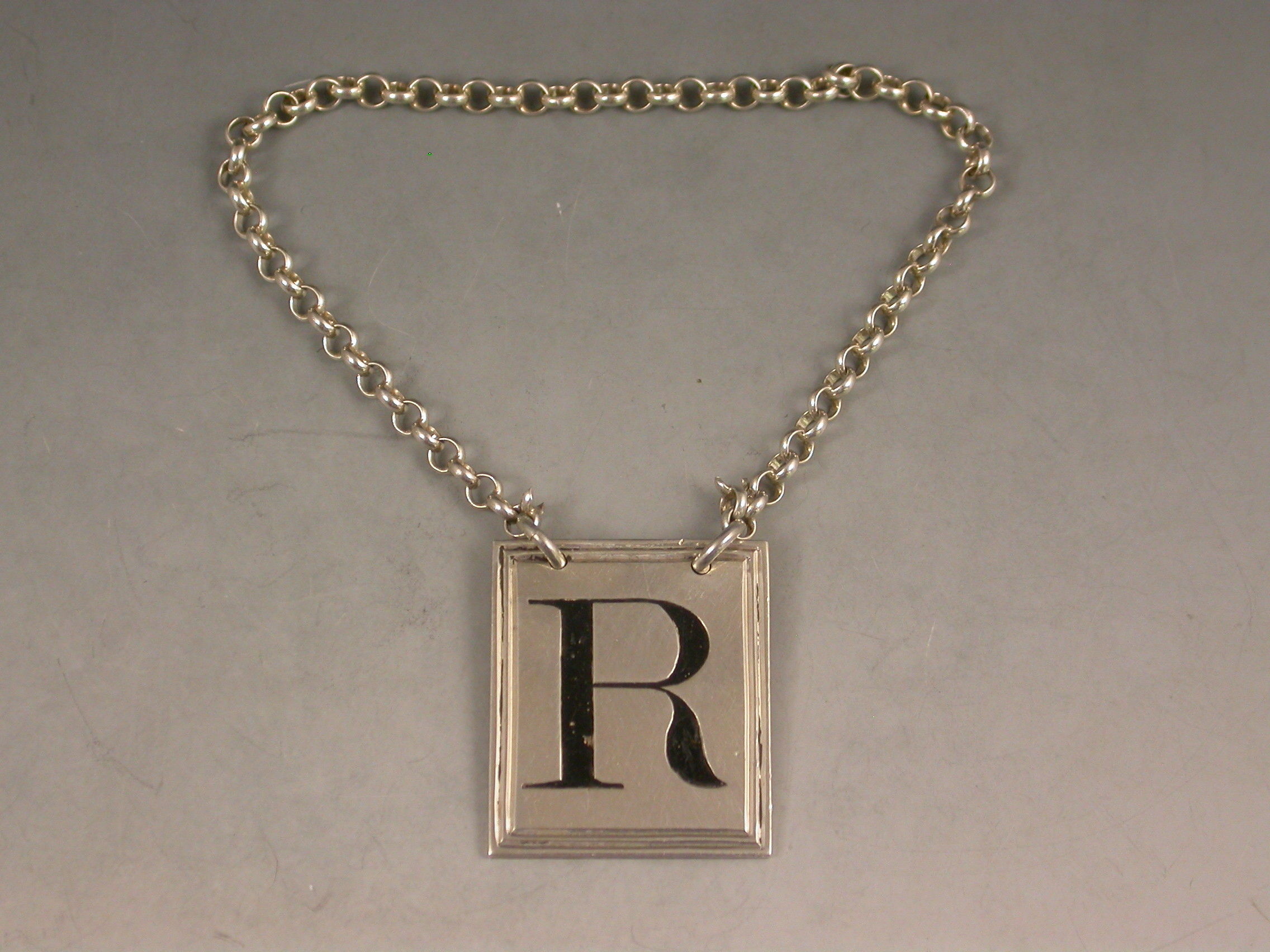 A good George III silver Wine Label of rectangular 'postage stamp' form, with double reeded border, incised and niello filled with a capital letter 'R' (for Rum).
