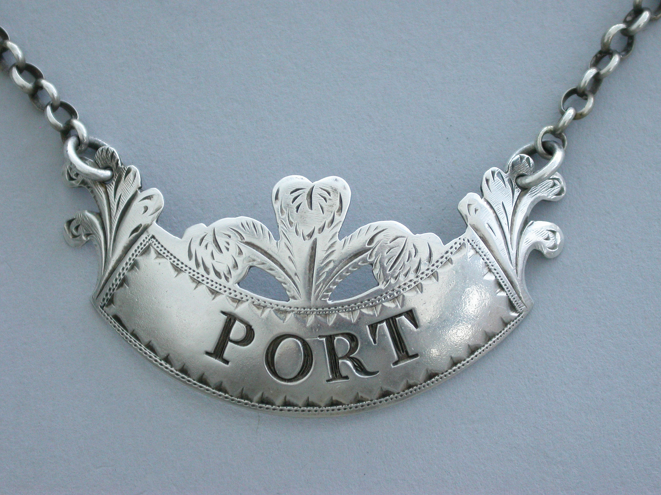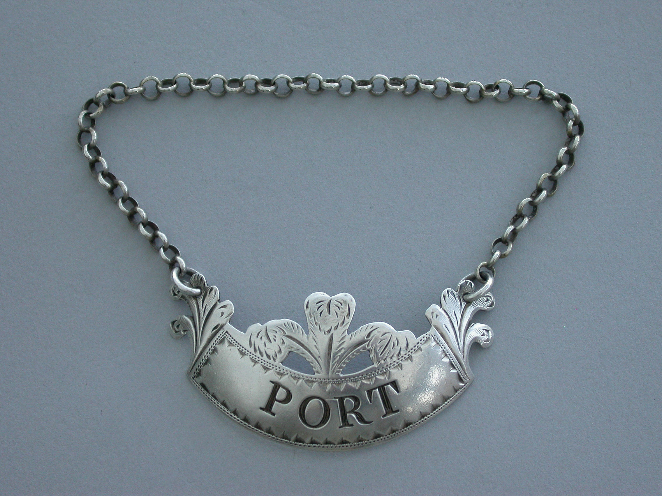 A good George III silver Wine Label of ""Prince of Wales Feathers"" form, featuring a plume of three ostrich feathers above a bright-cut engraved curved narrow rectangular label with engraved foliate feathered ends, incised for Port.