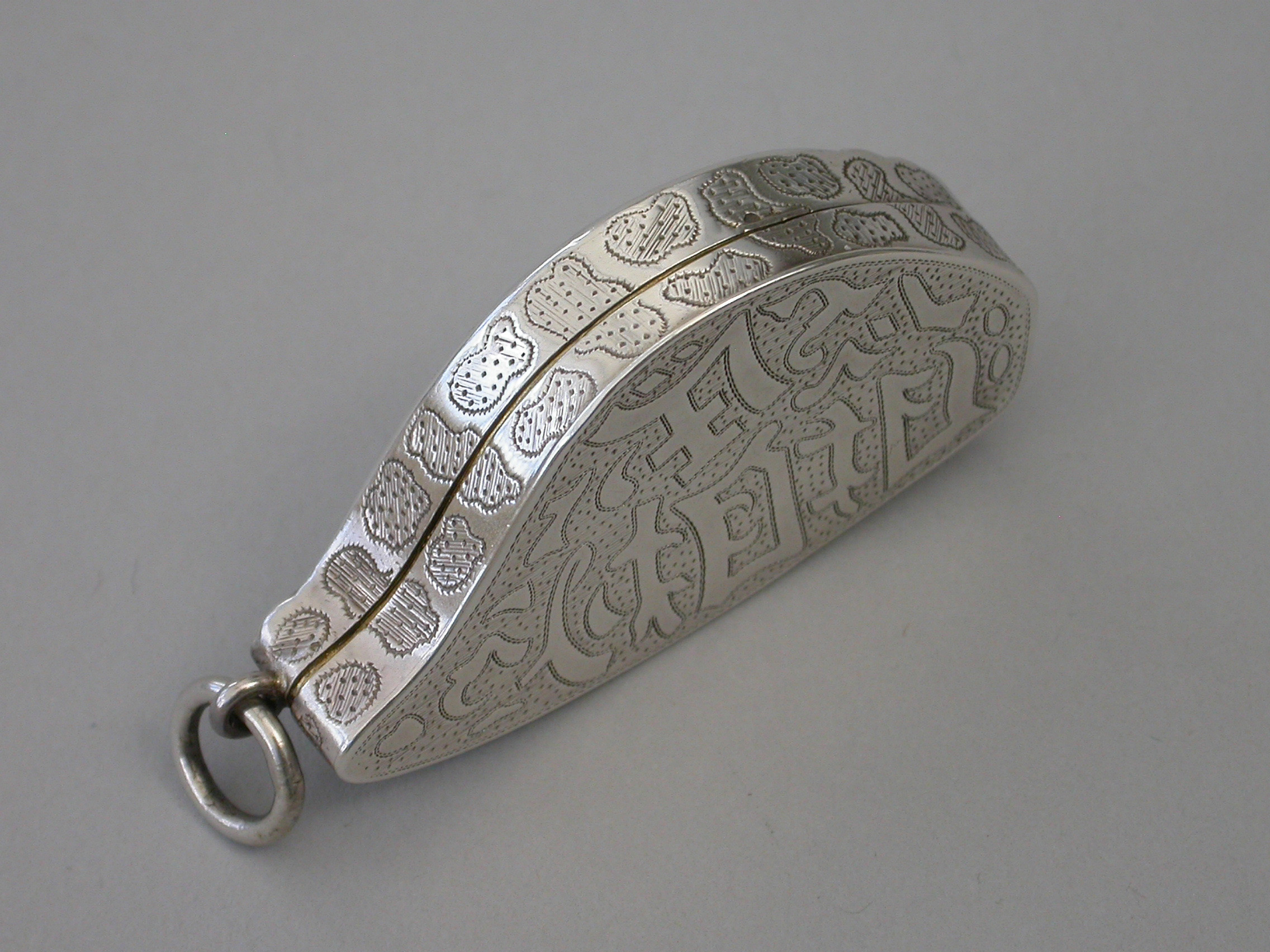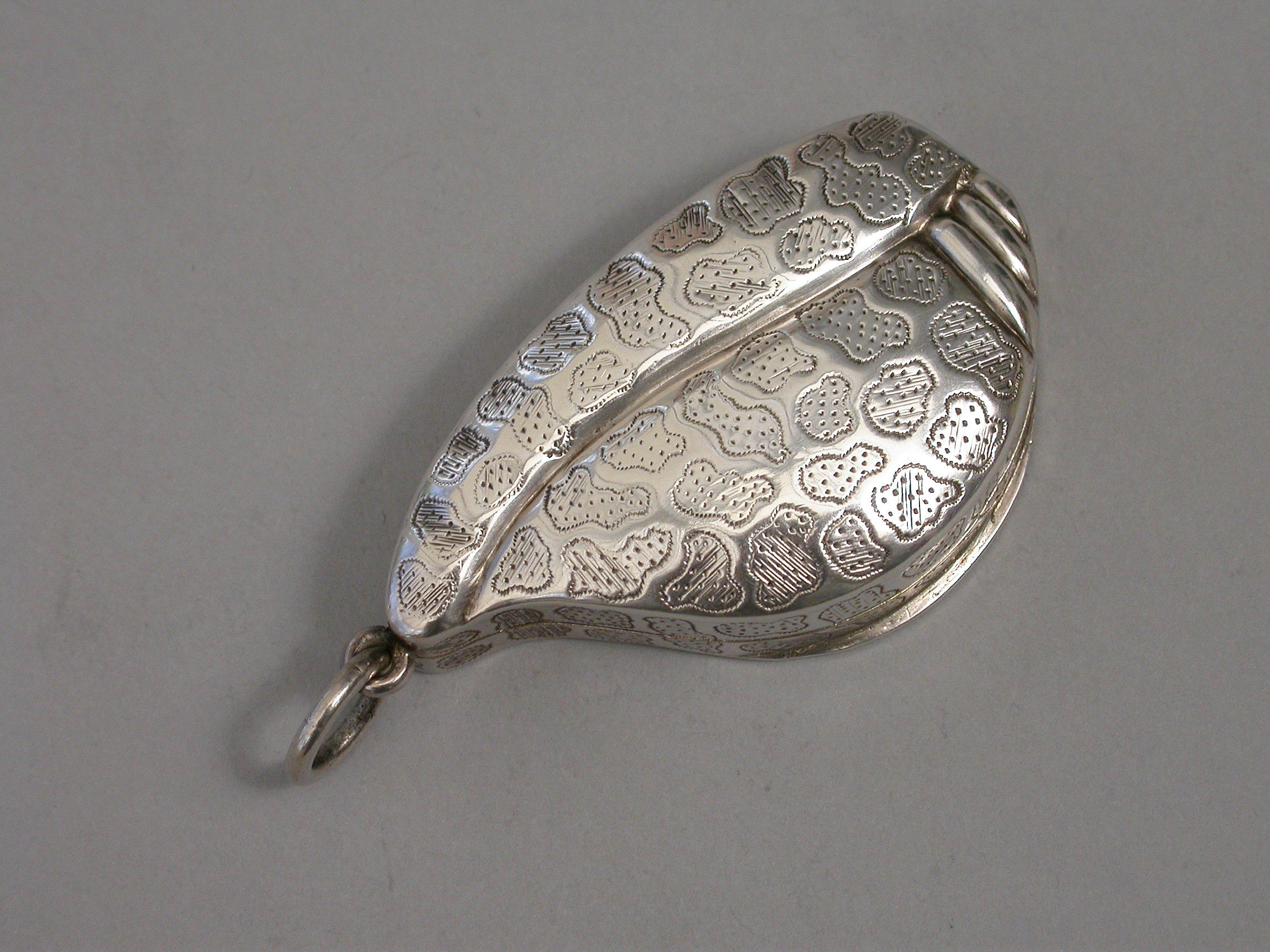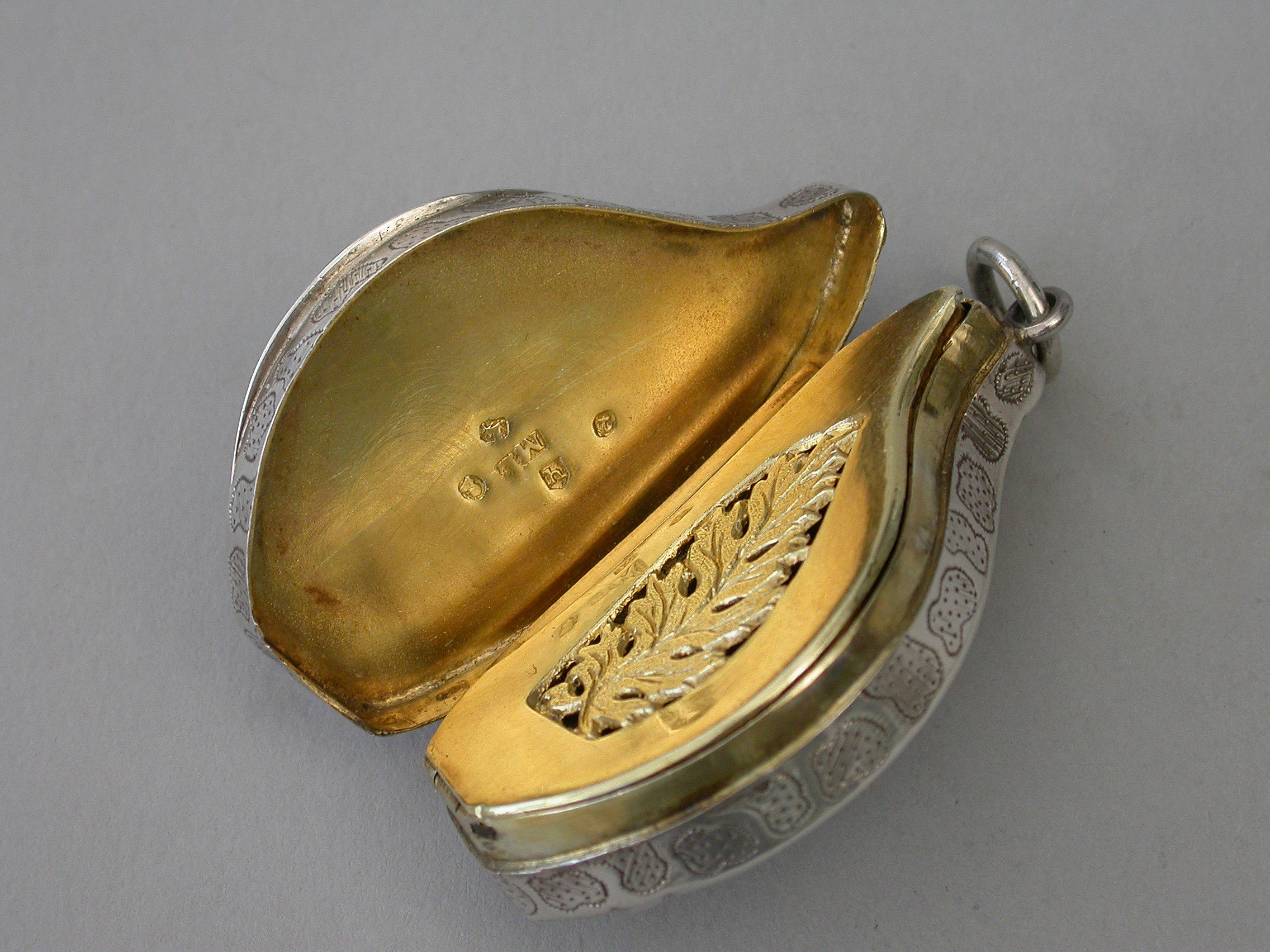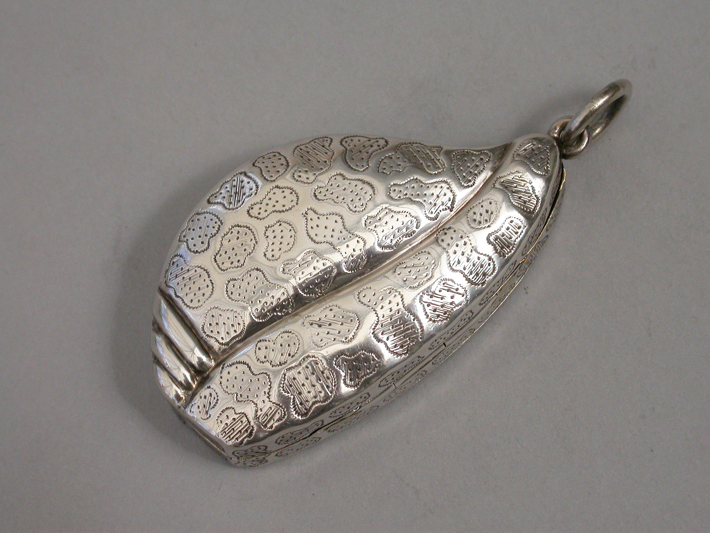 A fine and rare George III silver Vinaigrette made in the form of a Sea Snail Shell,with attached suspension ring, the top and sides with bright-cut engraved seaweed or amoeba type decoration, the base with simulated Chinese characters on a prick-dot ground. The silver gilt grille pierced with a single fern leaf.