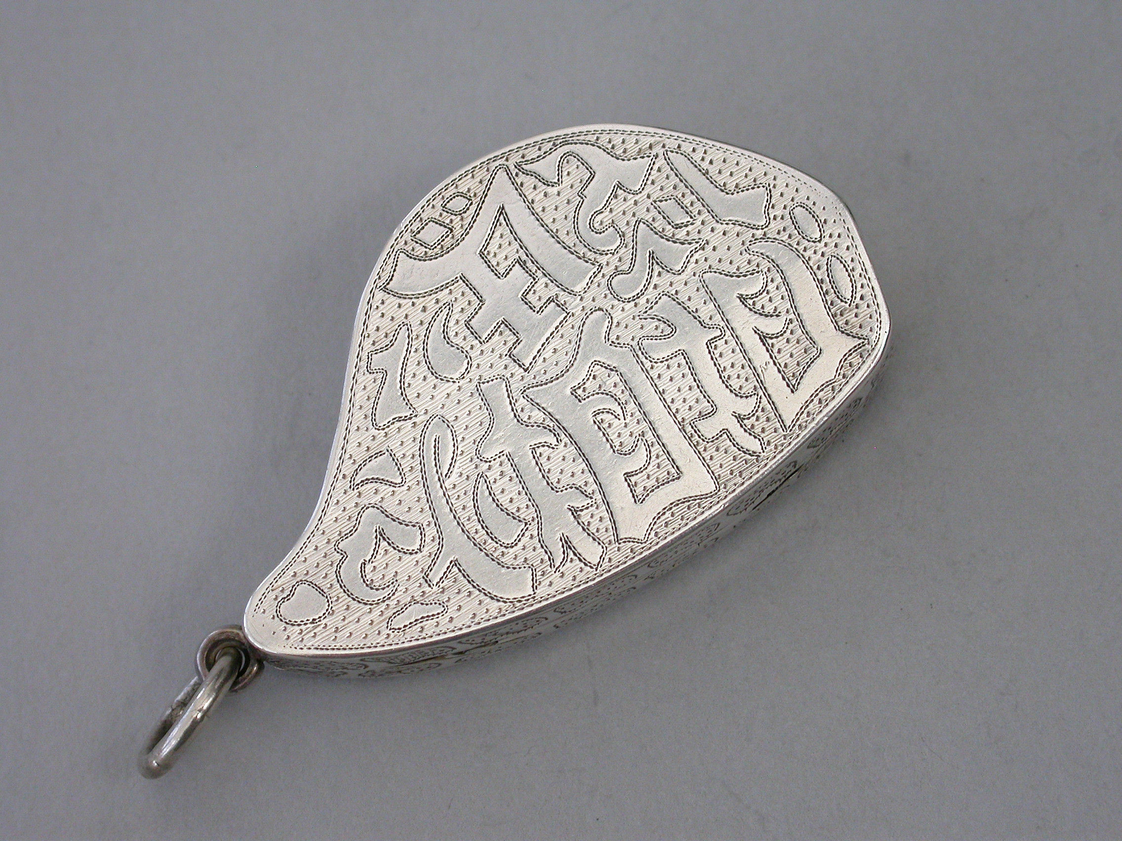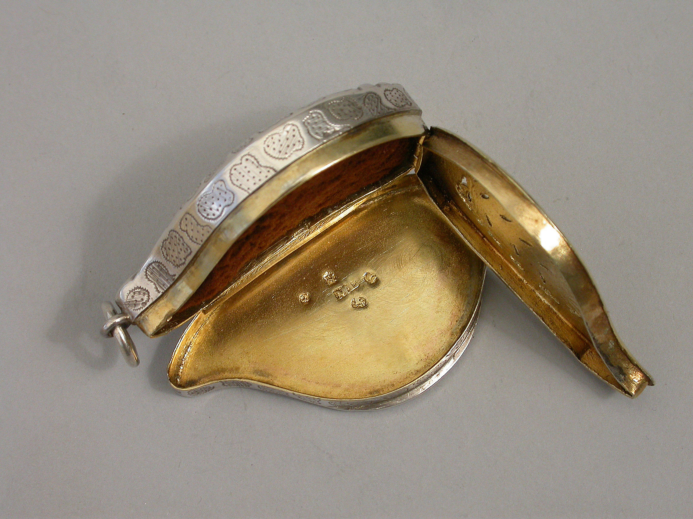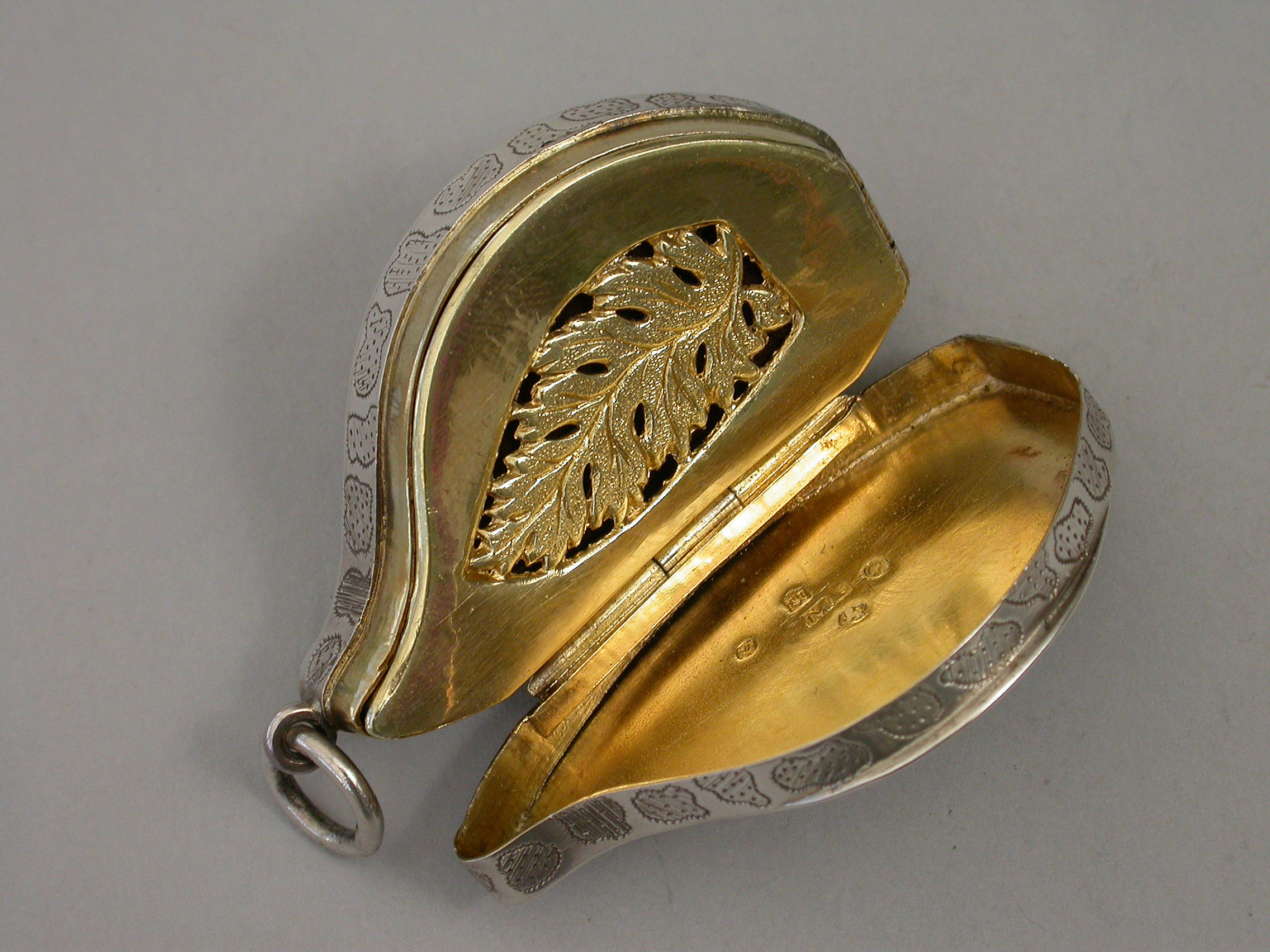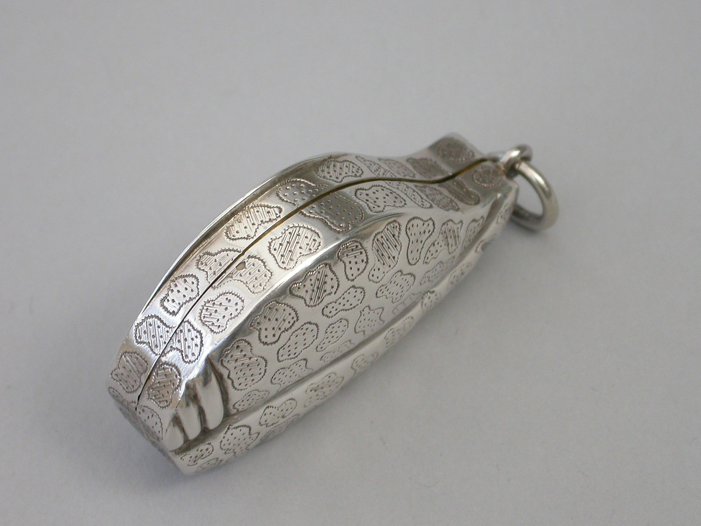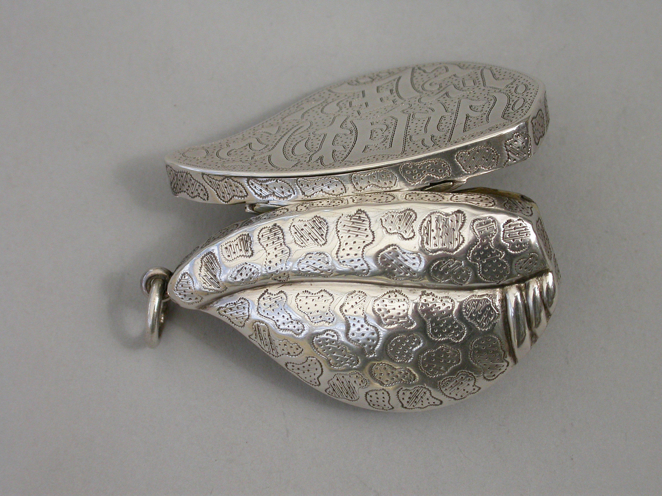 A fine and rare George III silver Vinaigrette made in the form of a Sea Snail Shell,with attached suspension ring, the top and sides with bright-cut engraved seaweed or amoeba type decoration, the base with simulated Chinese characters on a prick-dot ground. The silver gilt grille pierced with a single fern leaf.
