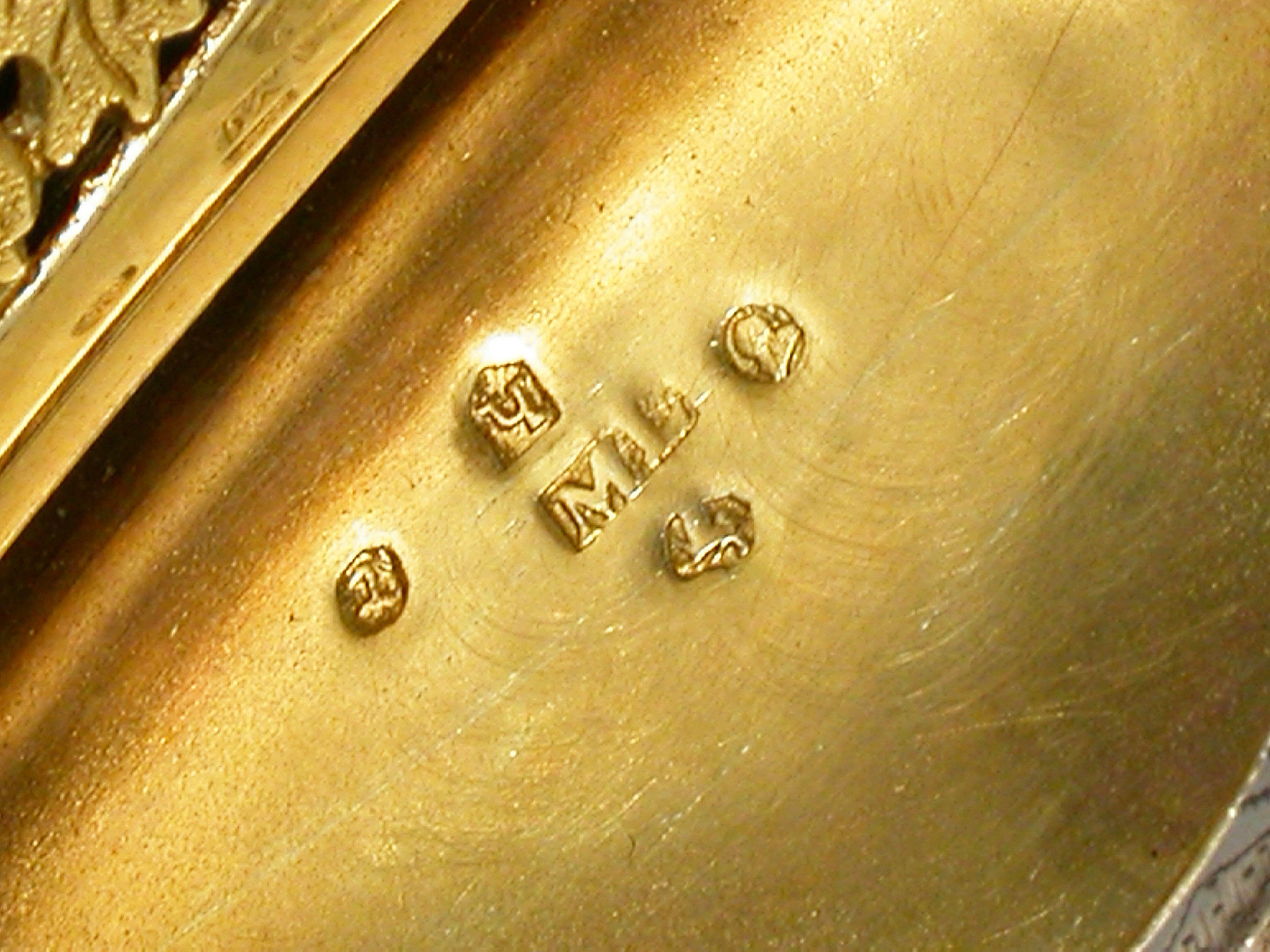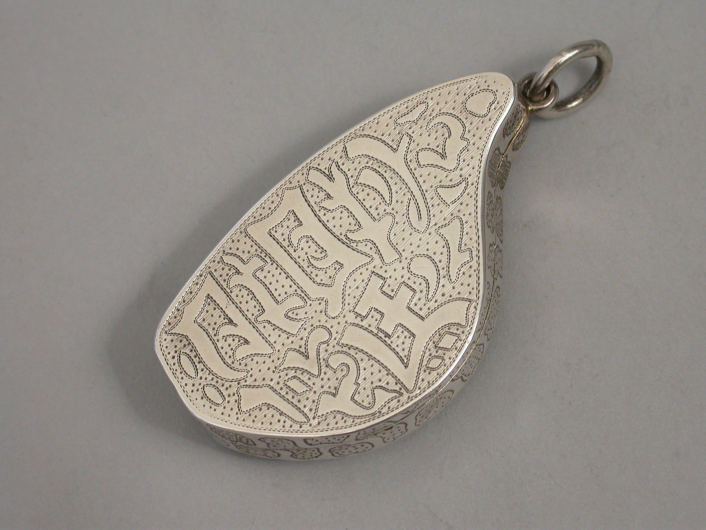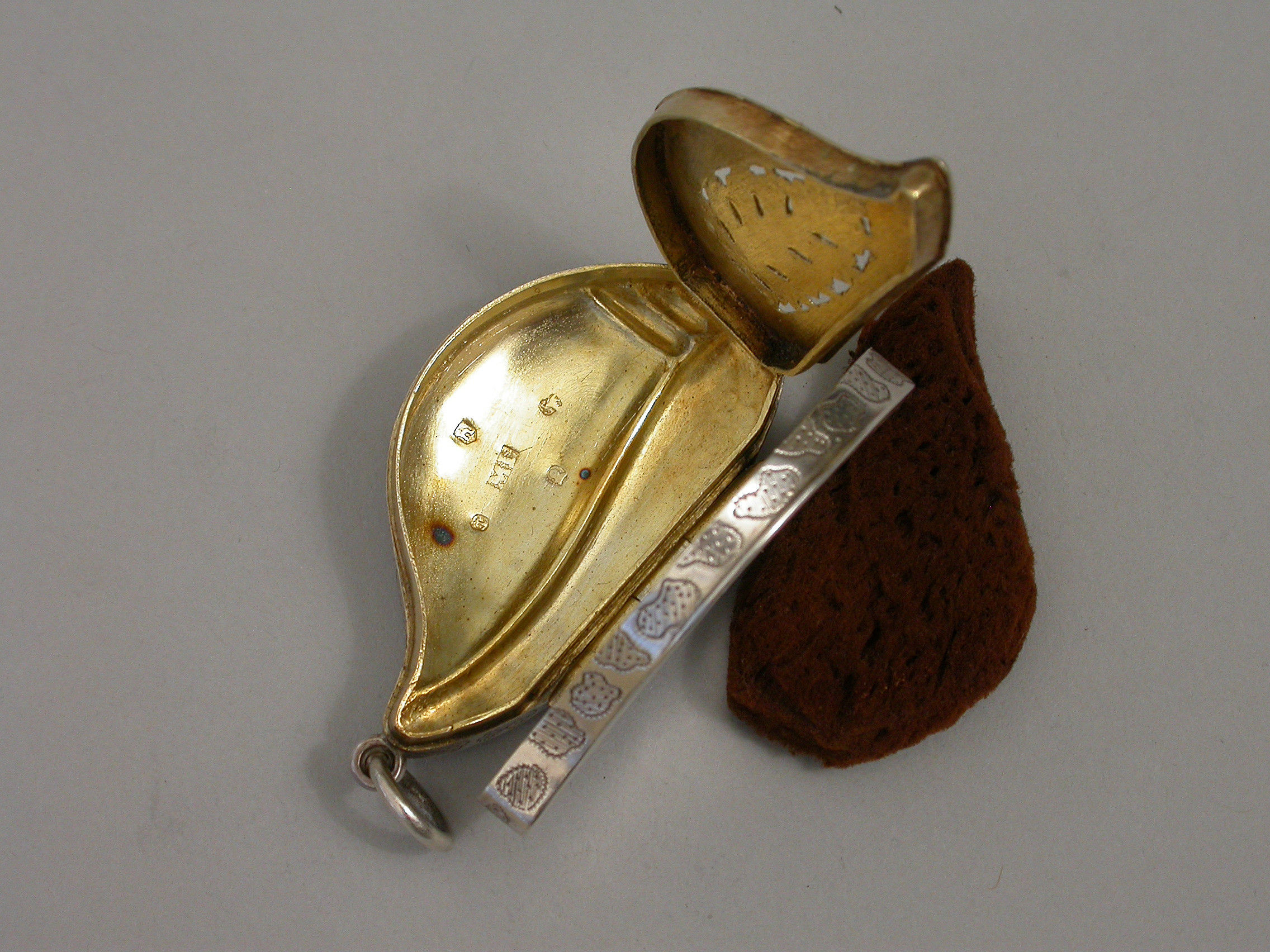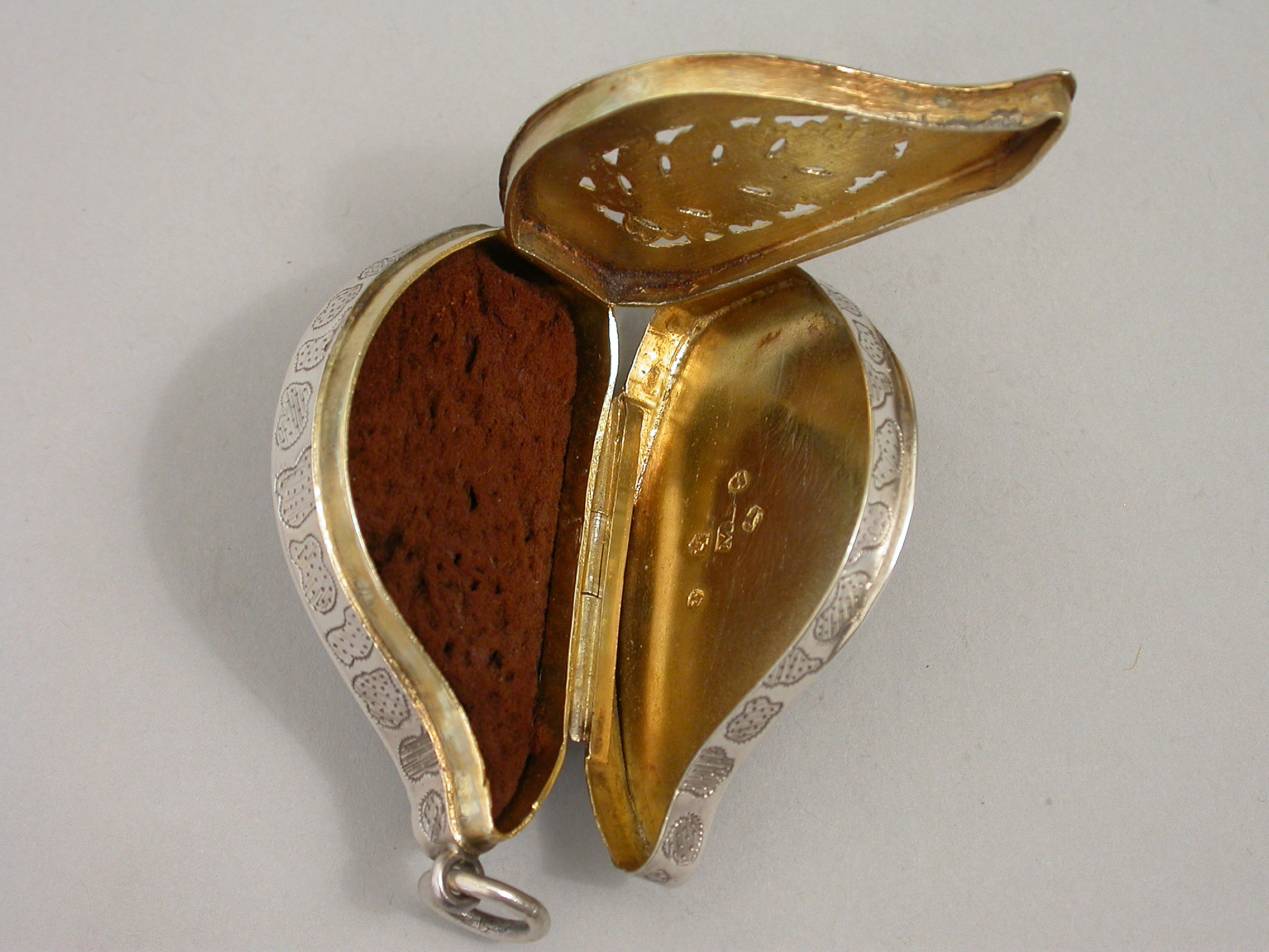 A fine and rare George III silver Vinaigrette made in the form of a Sea Snail Shell,with attached suspension ring, the top and sides with bright-cut engraved seaweed or amoeba type decoration, the base with simulated Chinese characters on a prick-dot ground. The silver gilt grille pierced with a single fern leaf.