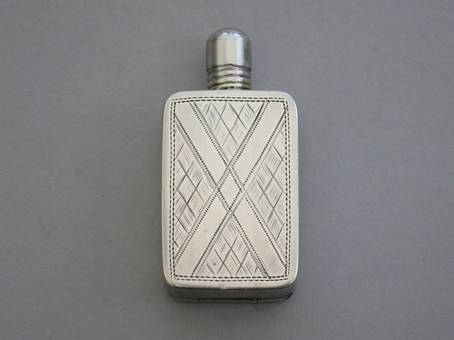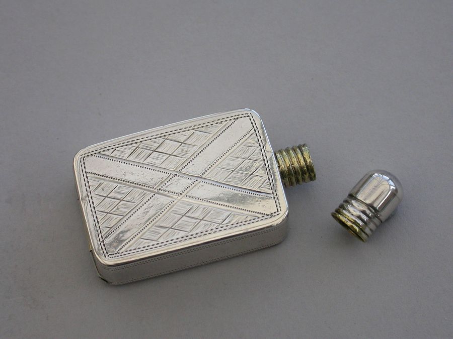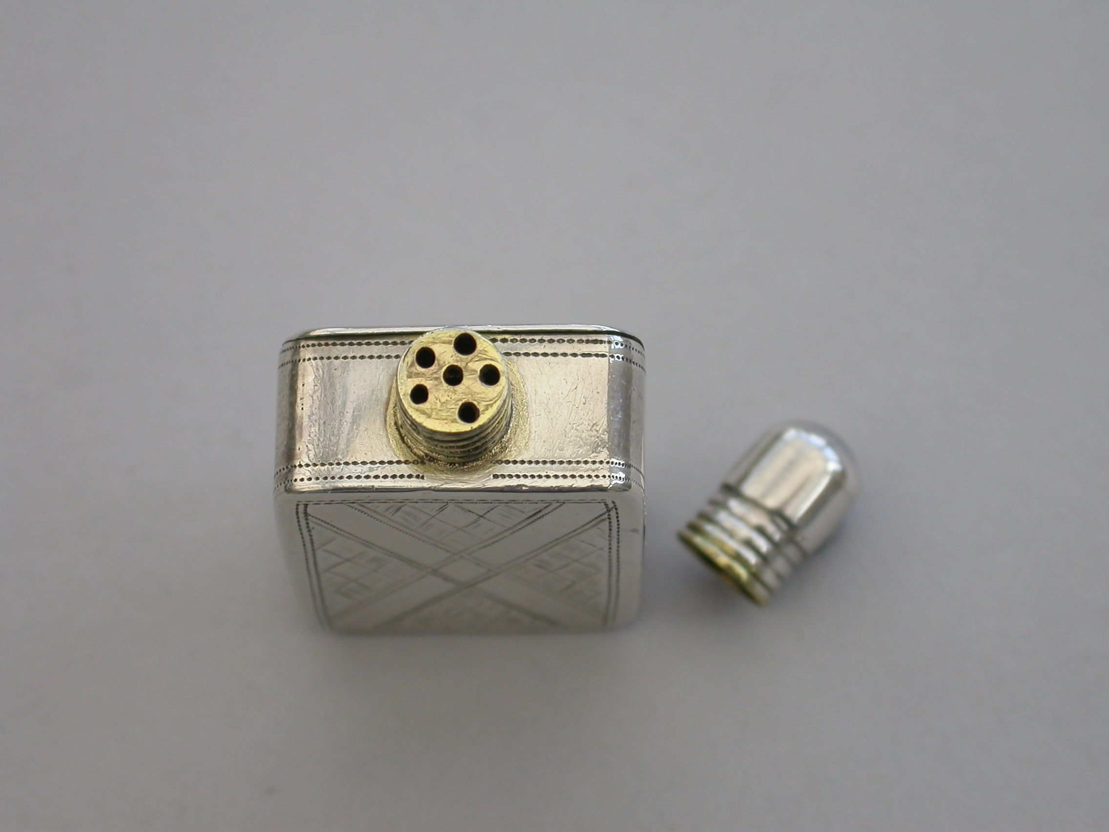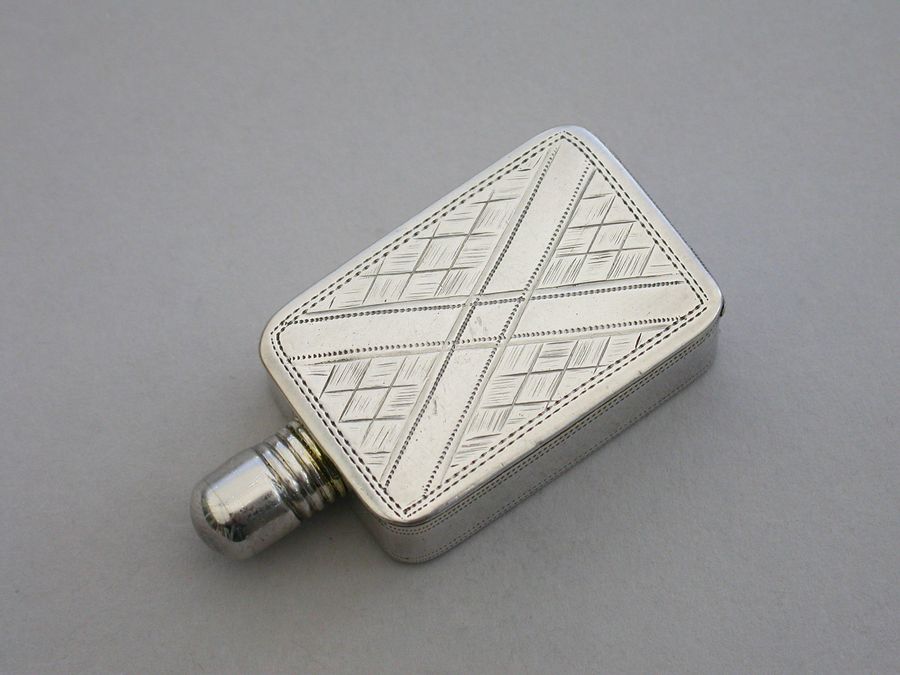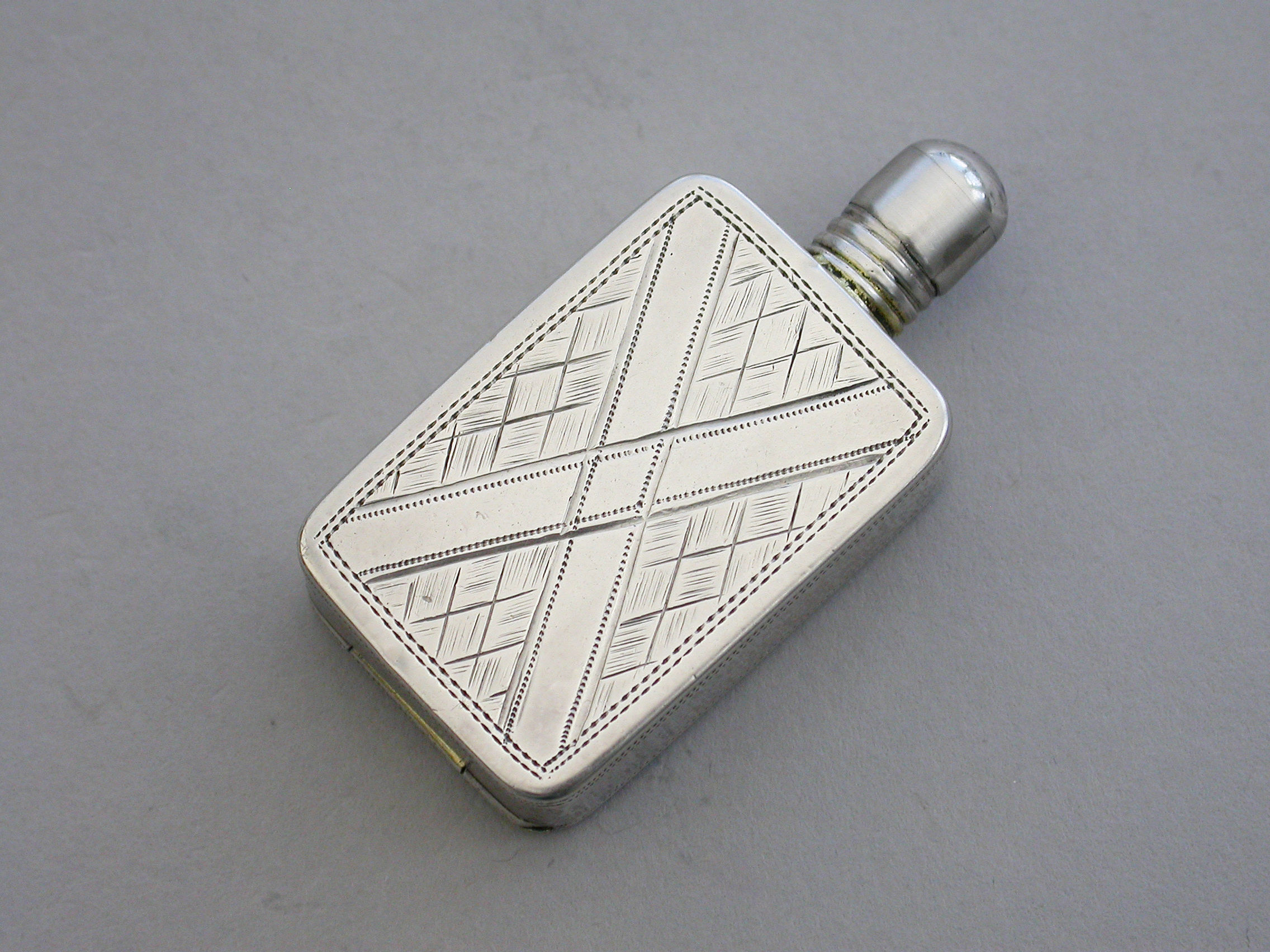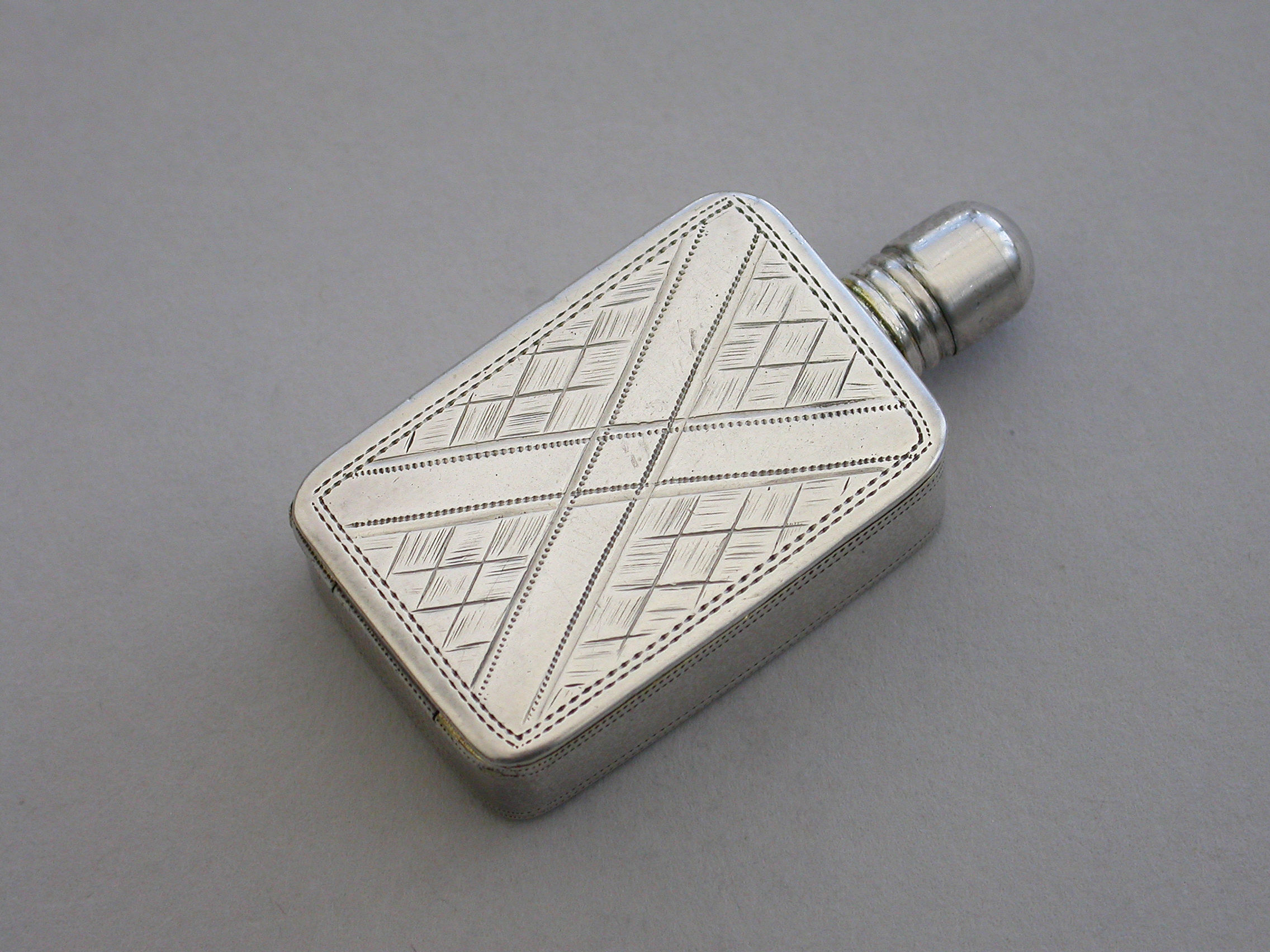 A rare George III silver Vinaigrette formed as a Snuff Bottle, the hinged body engraved with a St.Andrew's Cross with cross hatched diaper work between the arms. The pierced neck with screw on cap.