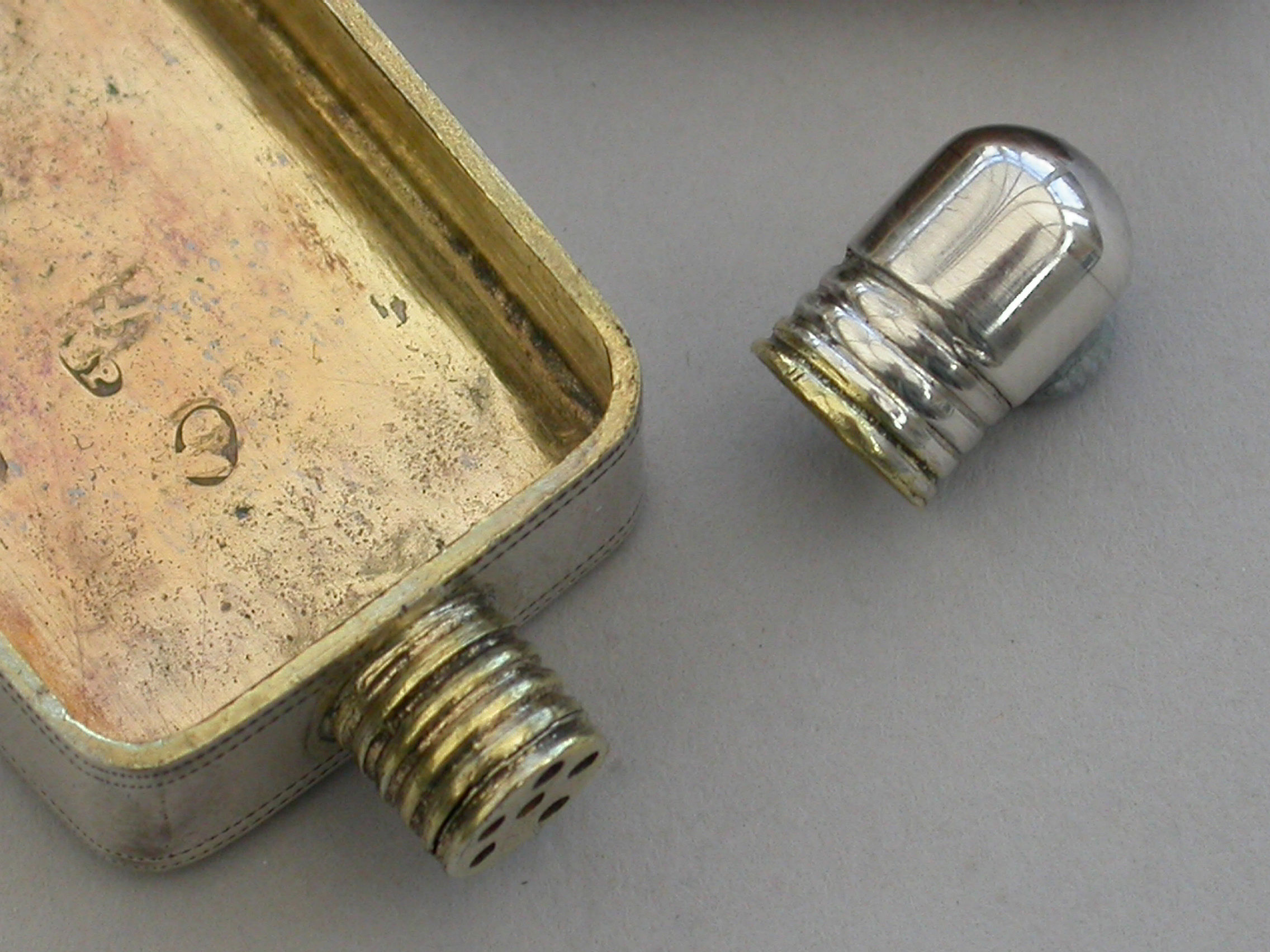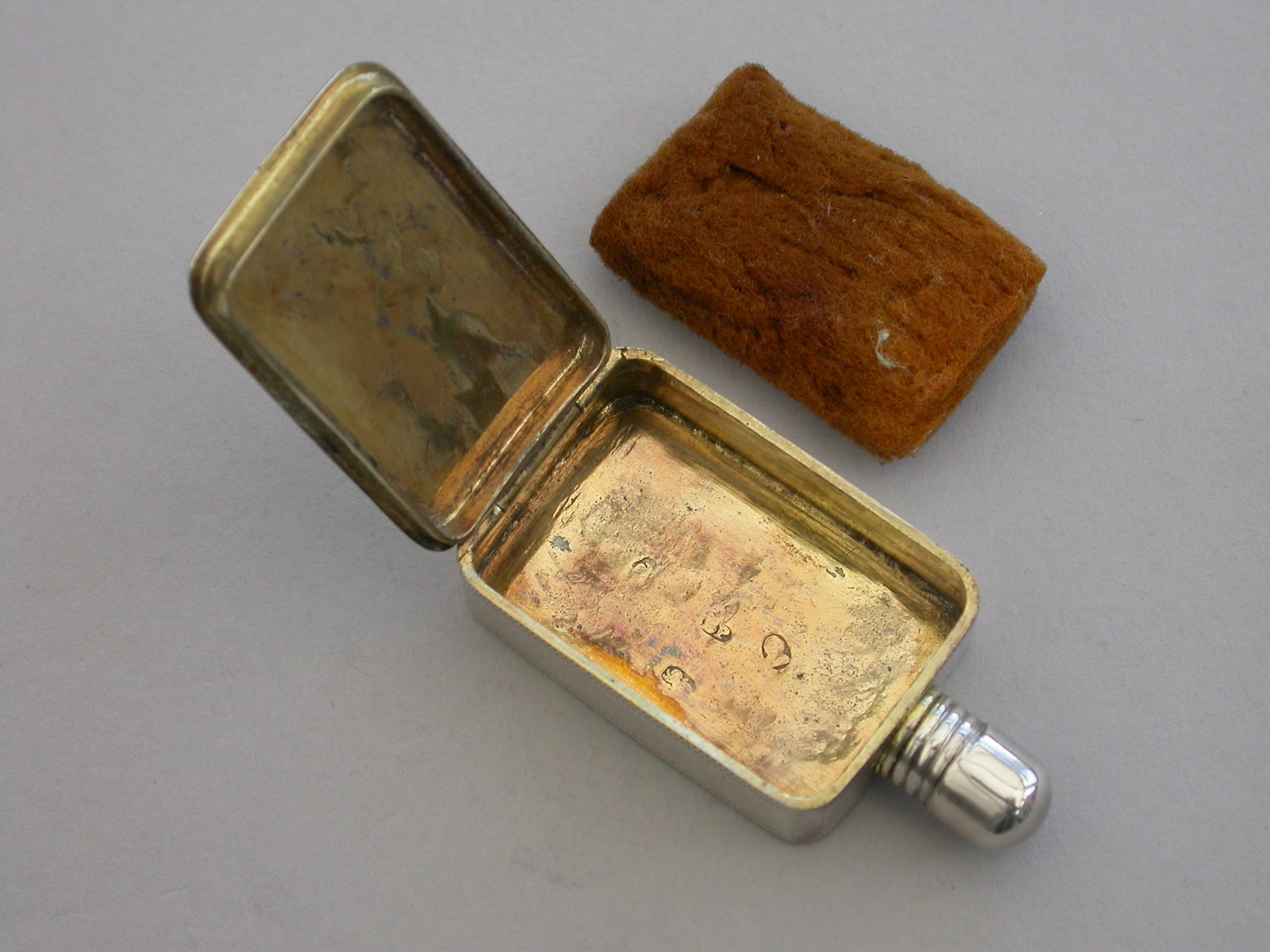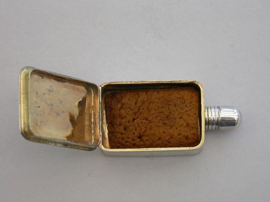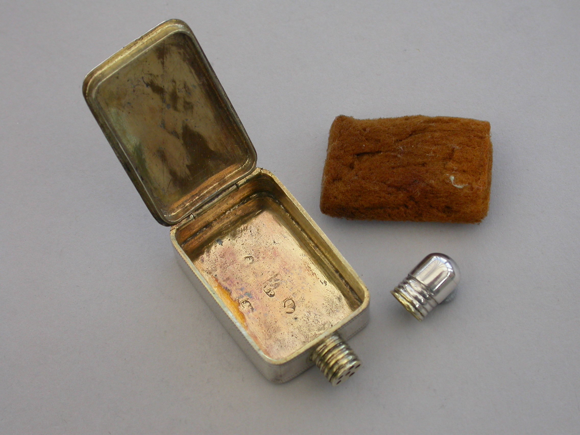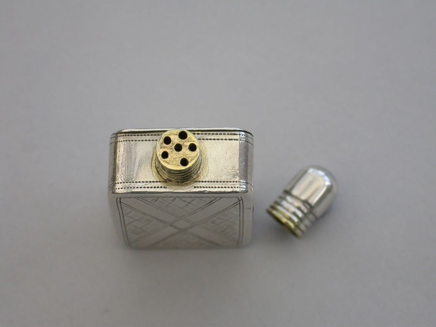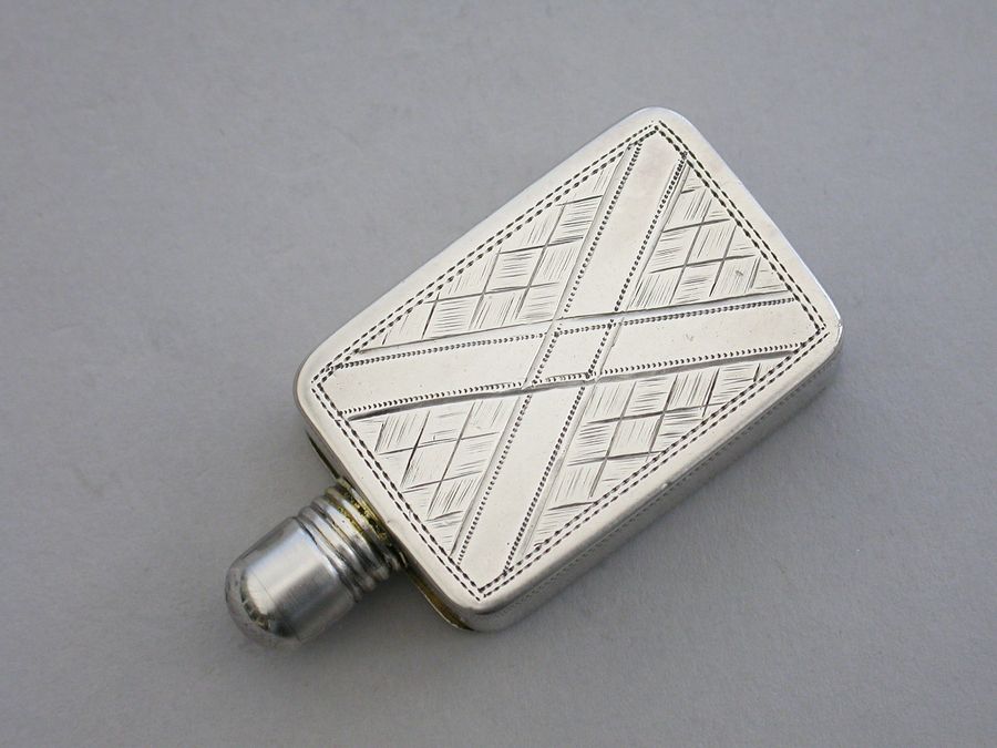 A rare George III silver Vinaigrette formed as a Snuff Bottle, the hinged body engraved with a St.Andrew's Cross with cross hatched diaper work between the arms. The pierced neck with screw on cap.