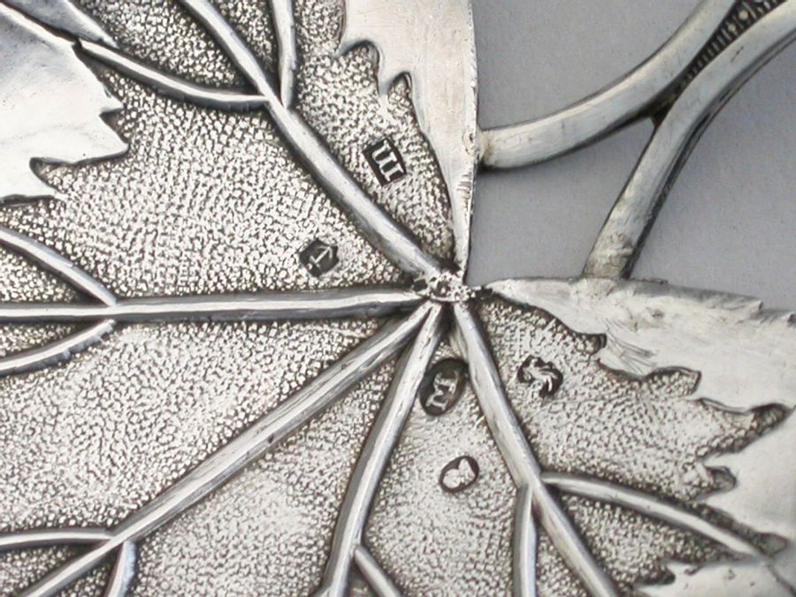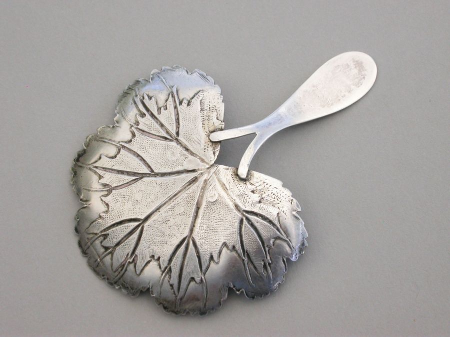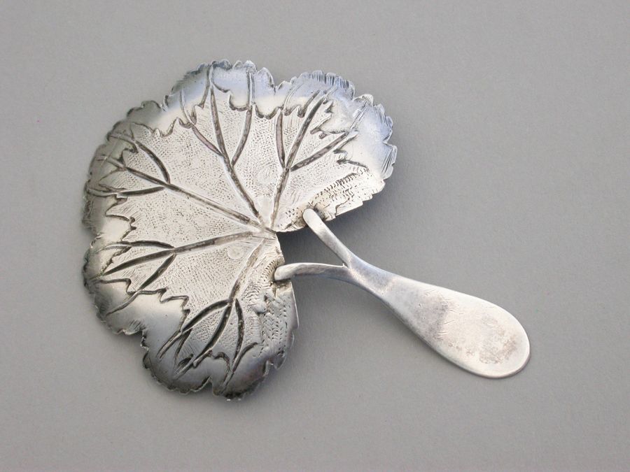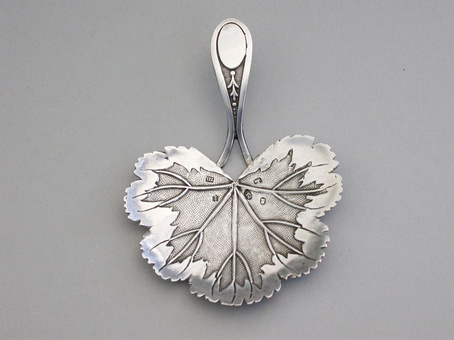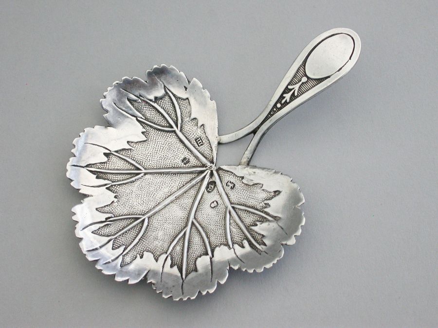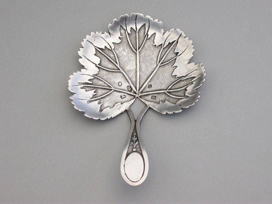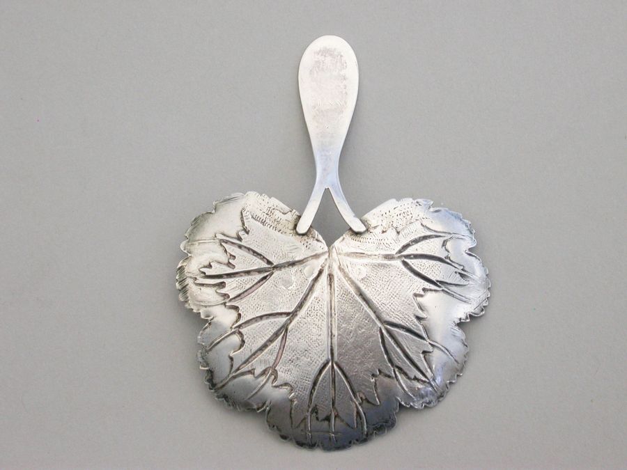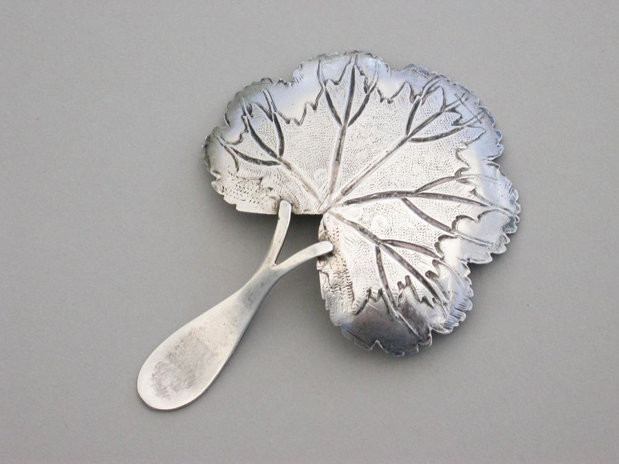 A rare George III silver Caddy Spoon, the bowl formed as a strawberry leaf with veins on a matted background and with serrated rim, the bifurcated handle with vacant oval cartouche.