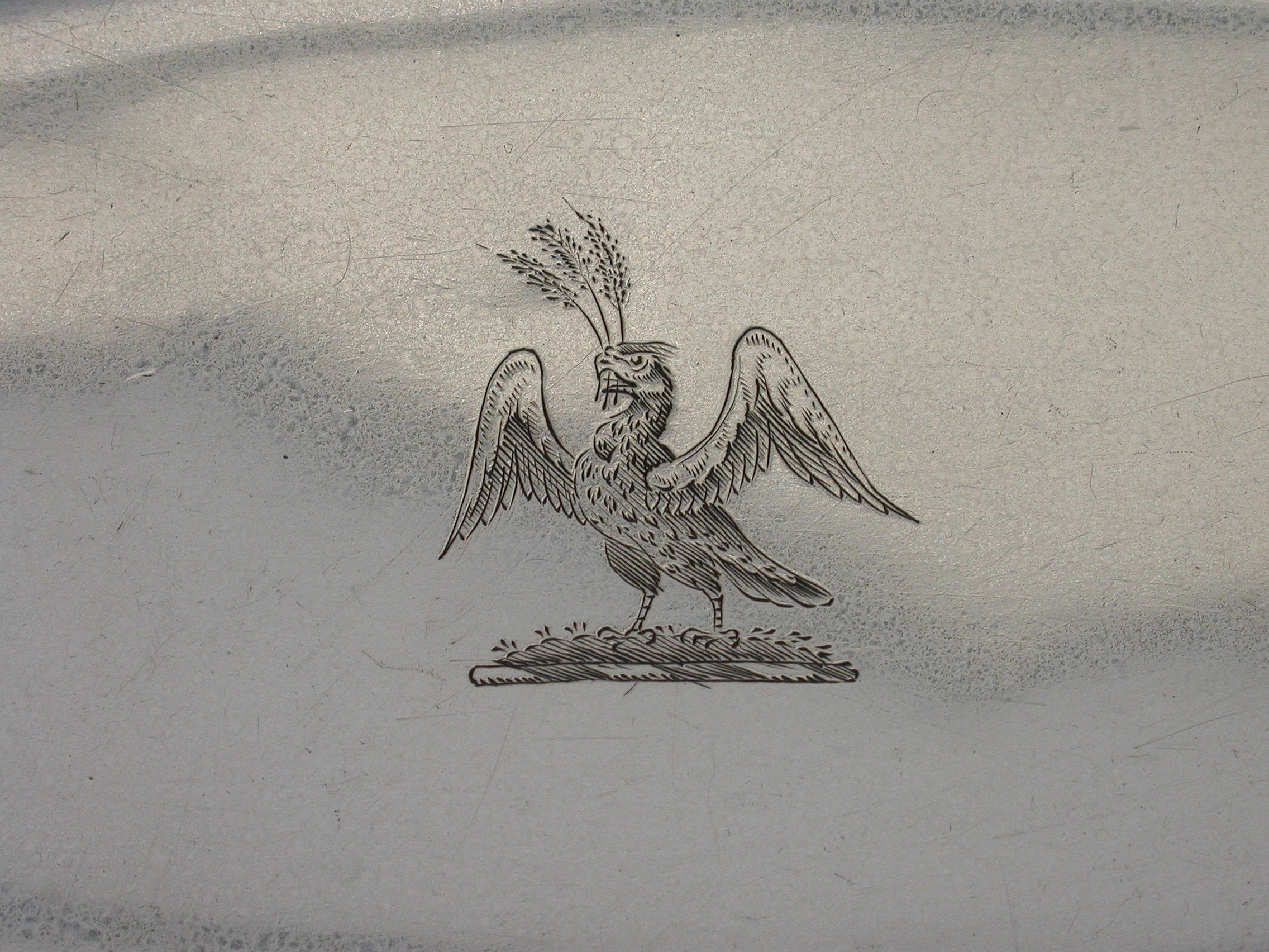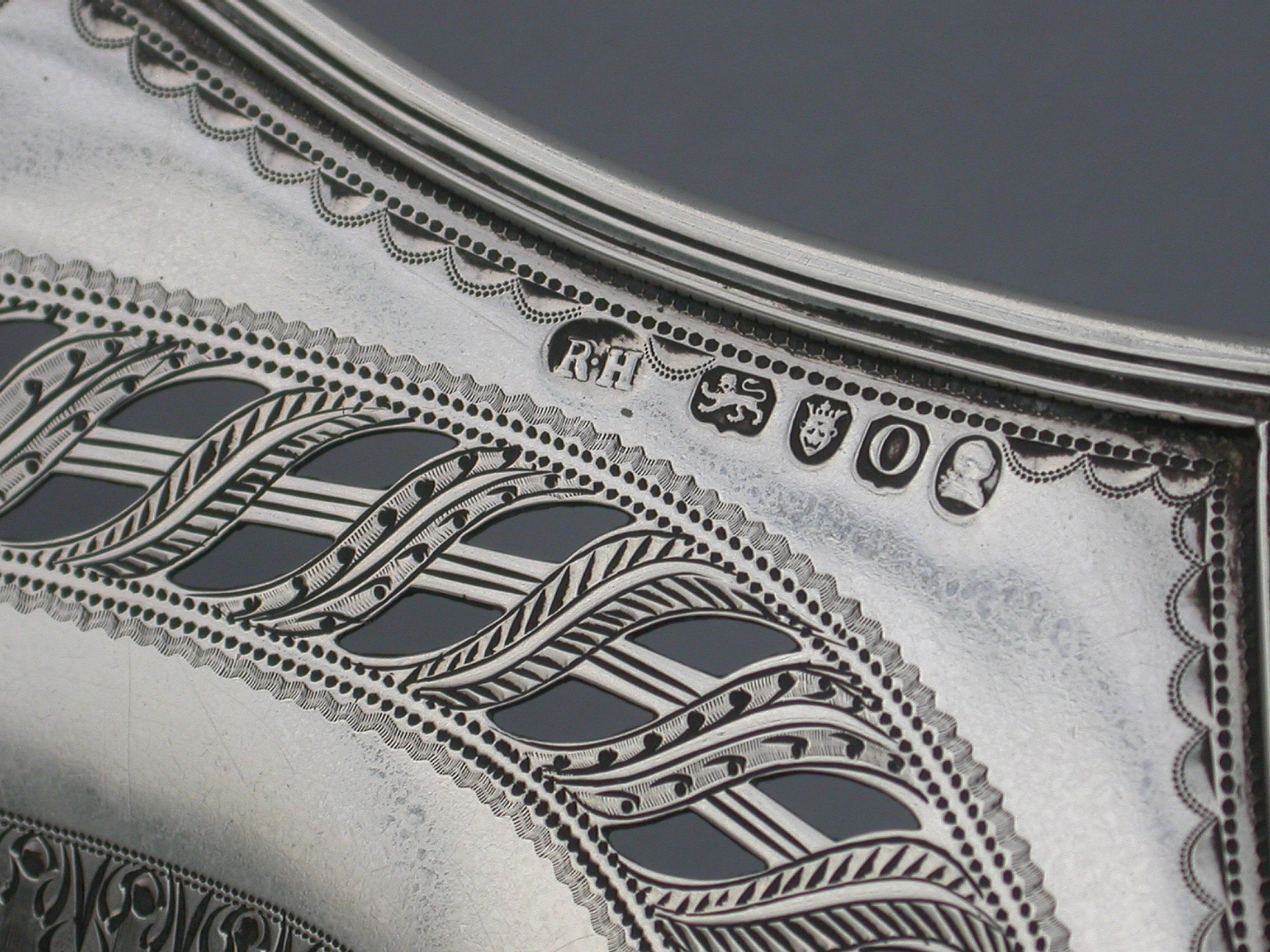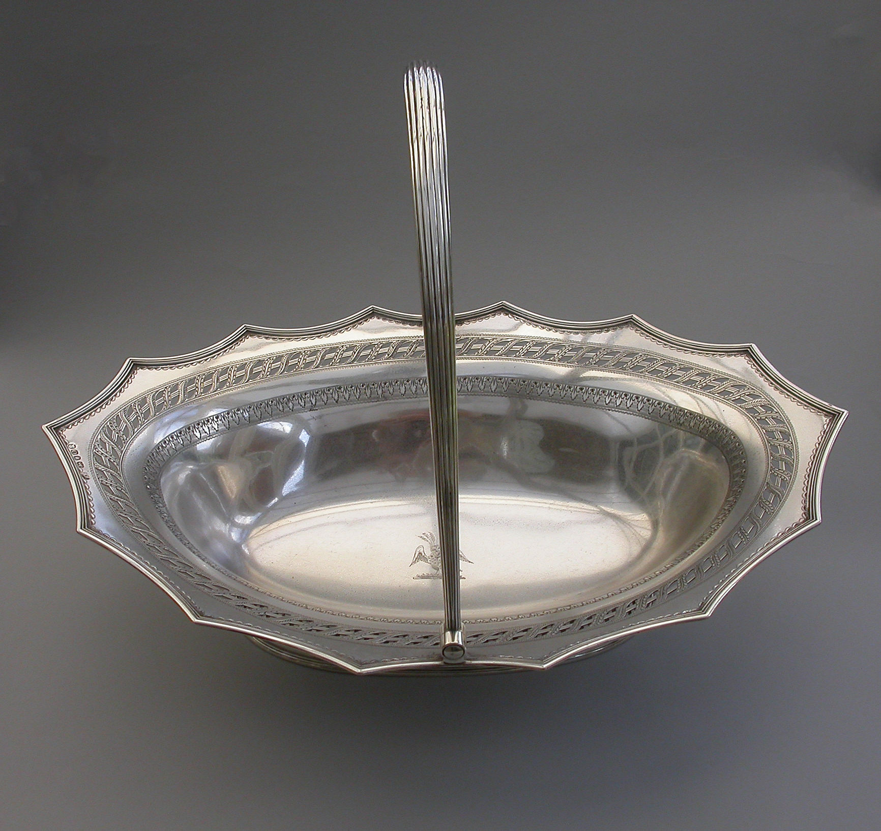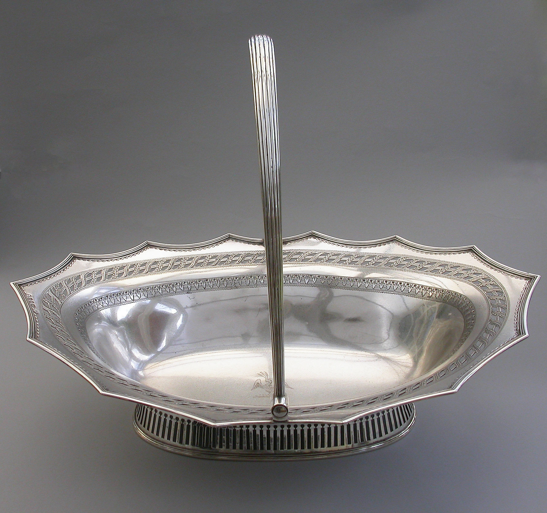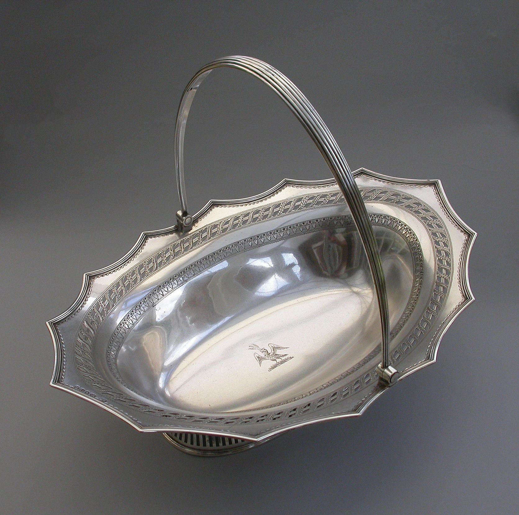A very fine quality George III silver Cake Basket of oval form with pierced collet foot and reeded swing handle, the shaped scalloped rim with applied reeded border and decorated with bands of pierced and bright-cut engraved leaves and scrolls, the centre engraved with a crest of an eagle holding three ears of corn.