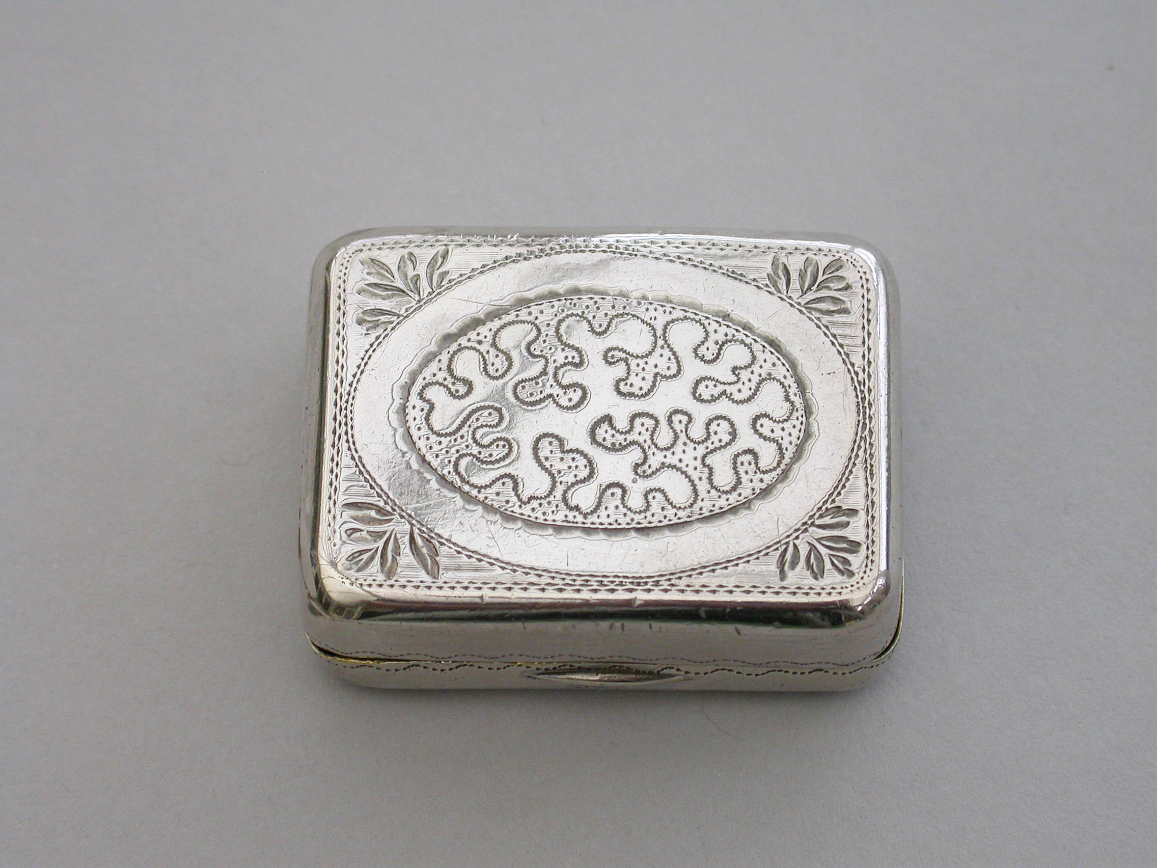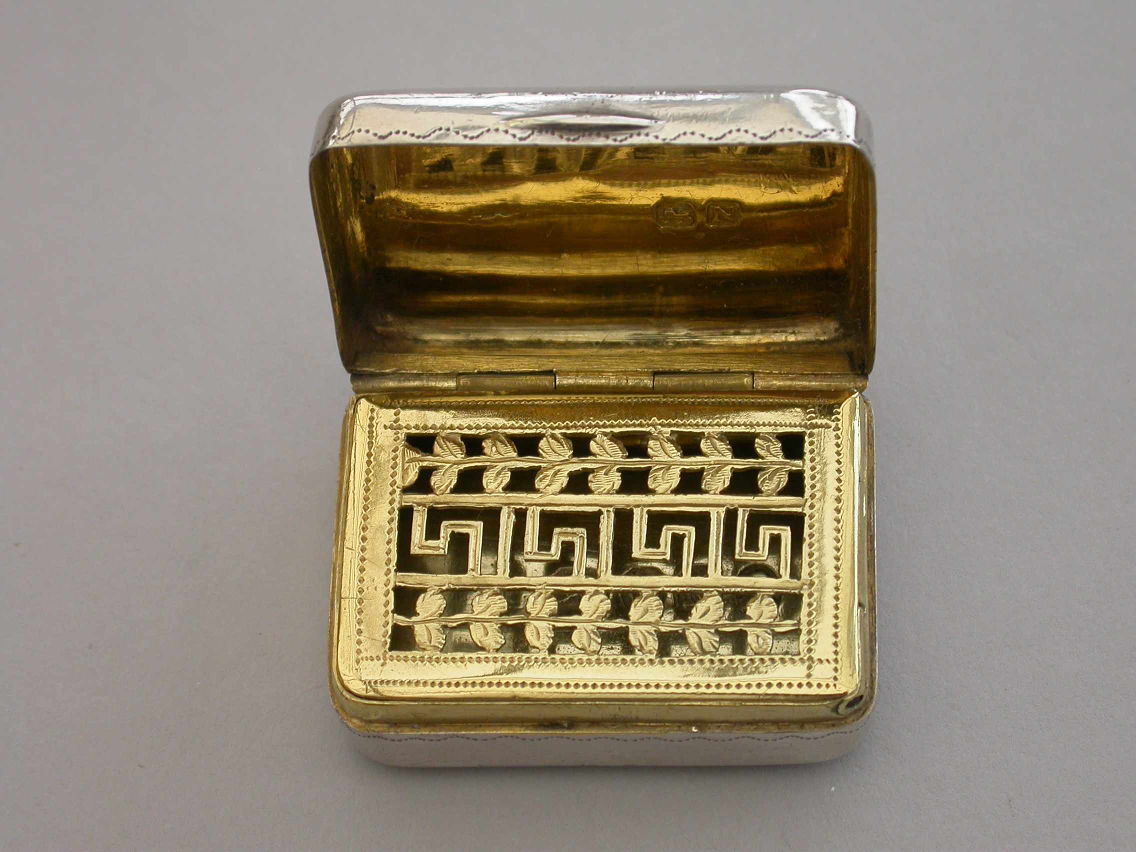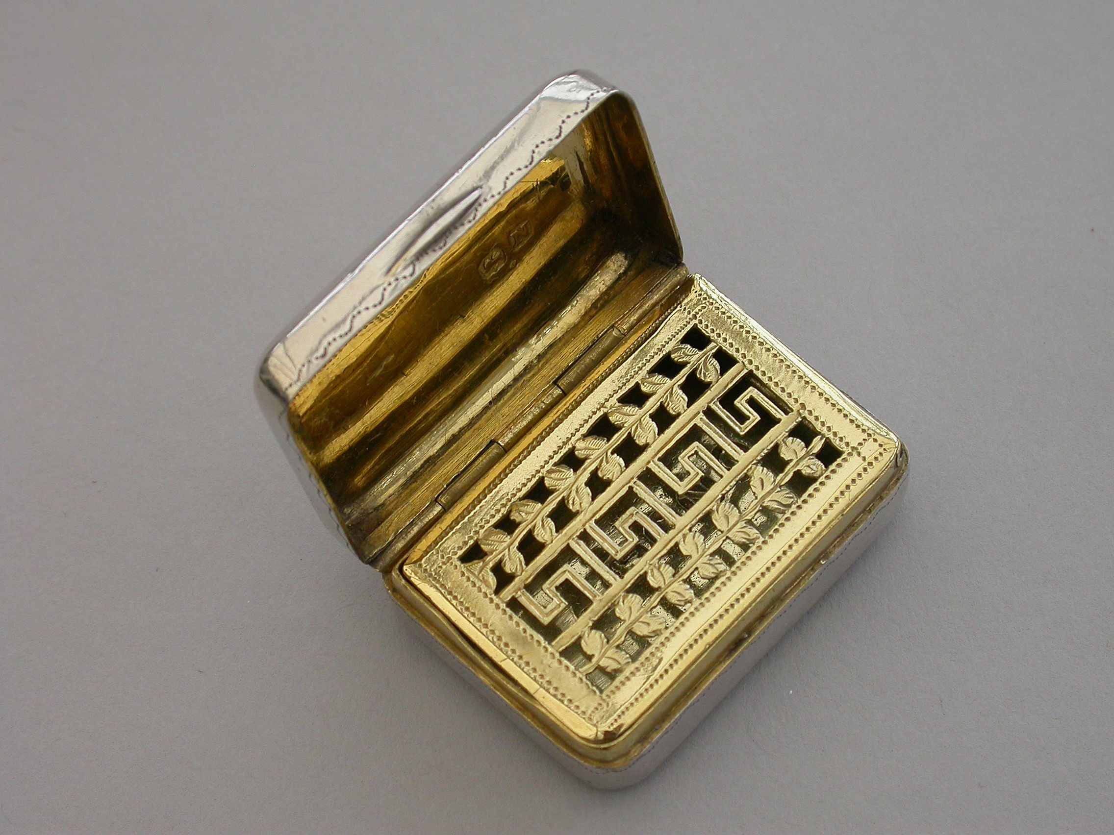 A good quality George III silver Vinaigrette of deep rounded rectangular form, the lid and base bright-cut engraved with an oval panel of vermecelli marked out by prick-dots within a plain frame and with a floret to each corner. The silver gilt grille unusually pierced with rows of leaves and Greek key motifs.