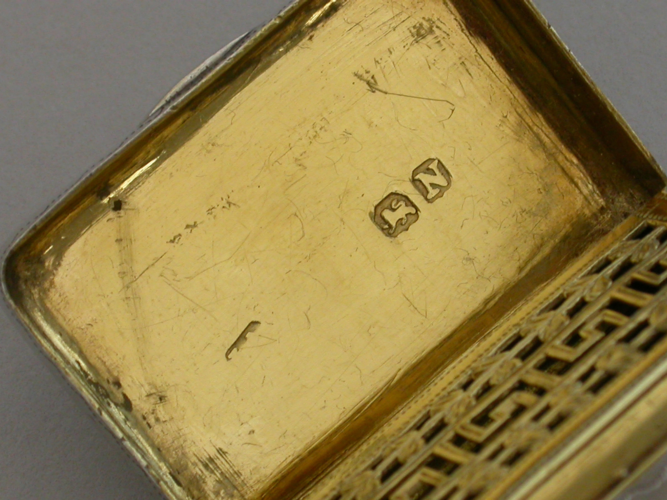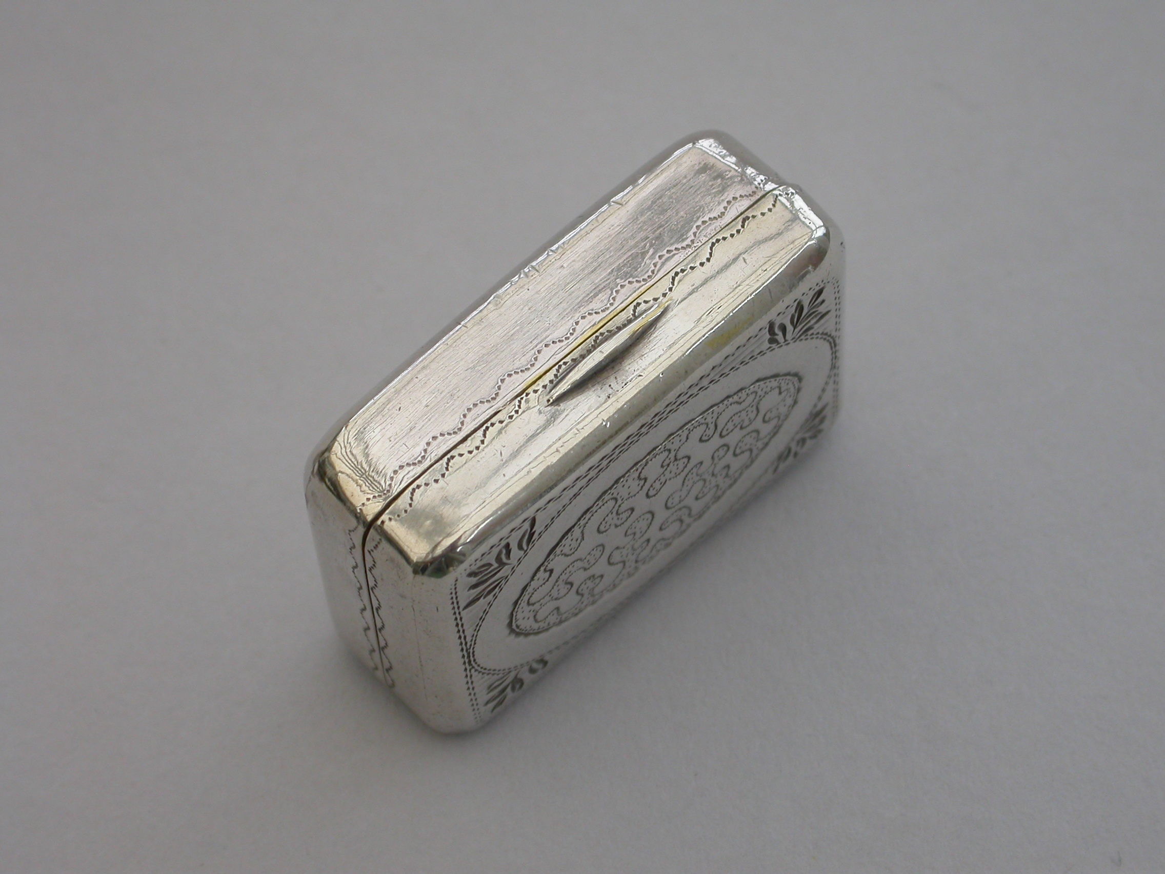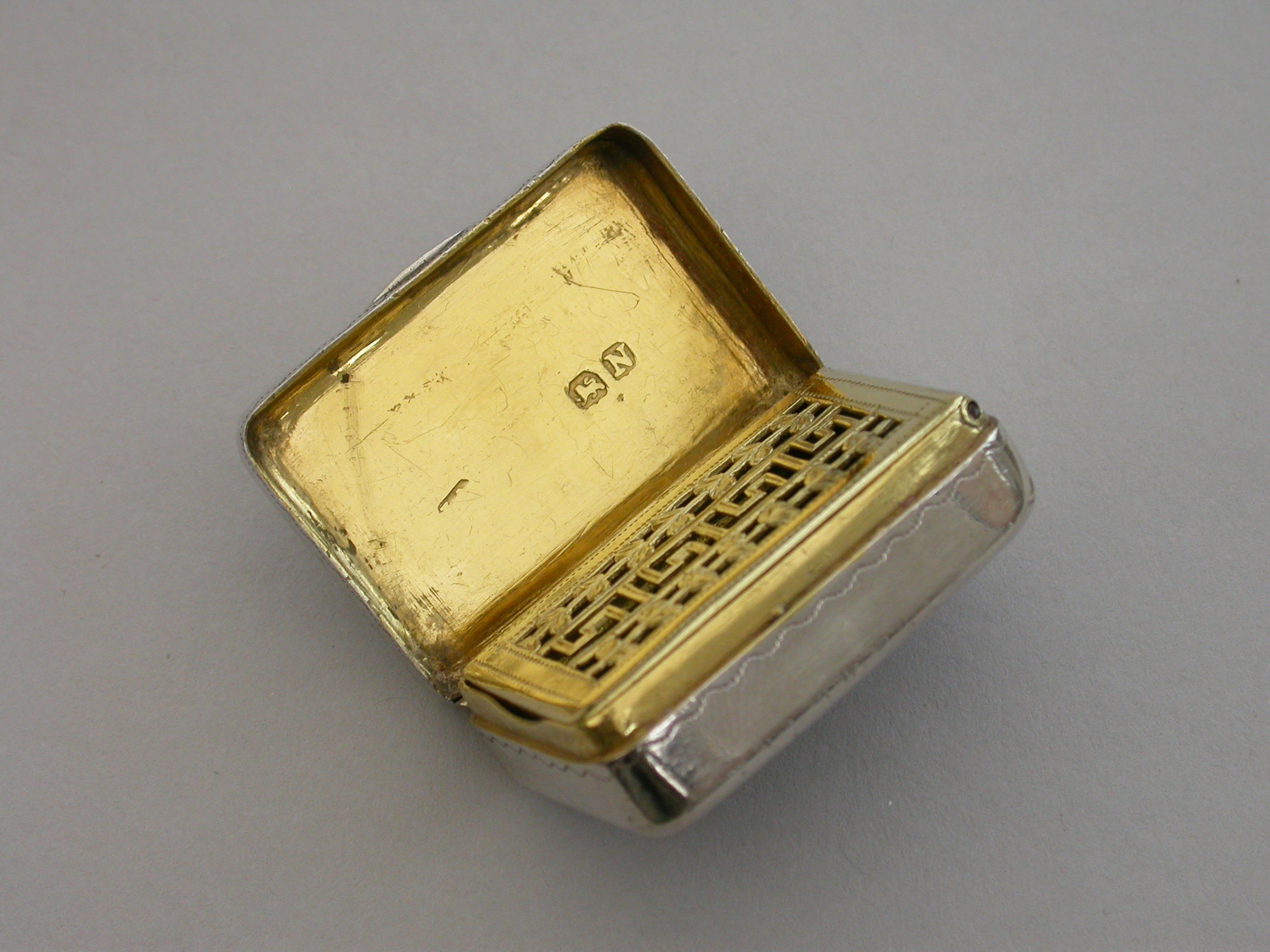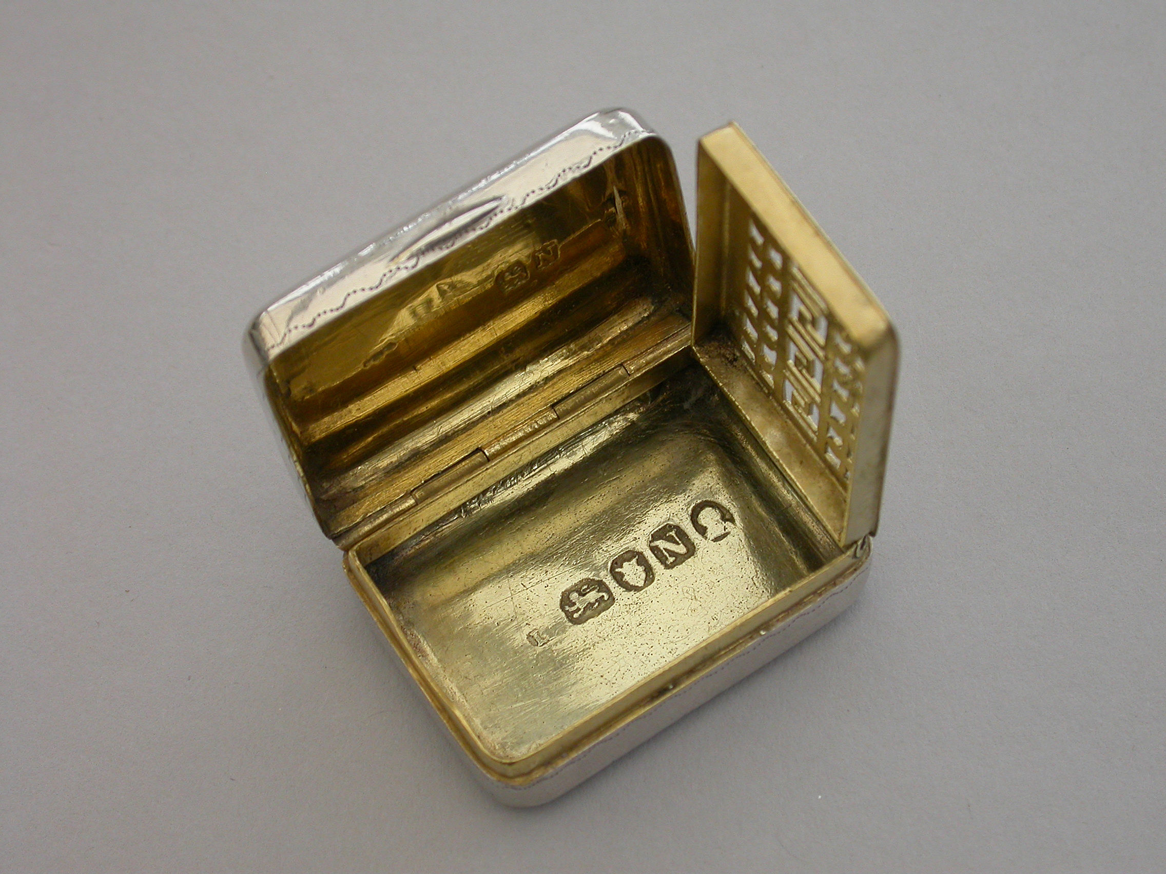 A good quality George III silver Vinaigrette of deep rounded rectangular form, the lid and base bright-cut engraved with an oval panel of vermecelli marked out by prick-dots within a plain frame and with a floret to each corner. The silver gilt grille unusually pierced with rows of leaves and Greek key motifs.