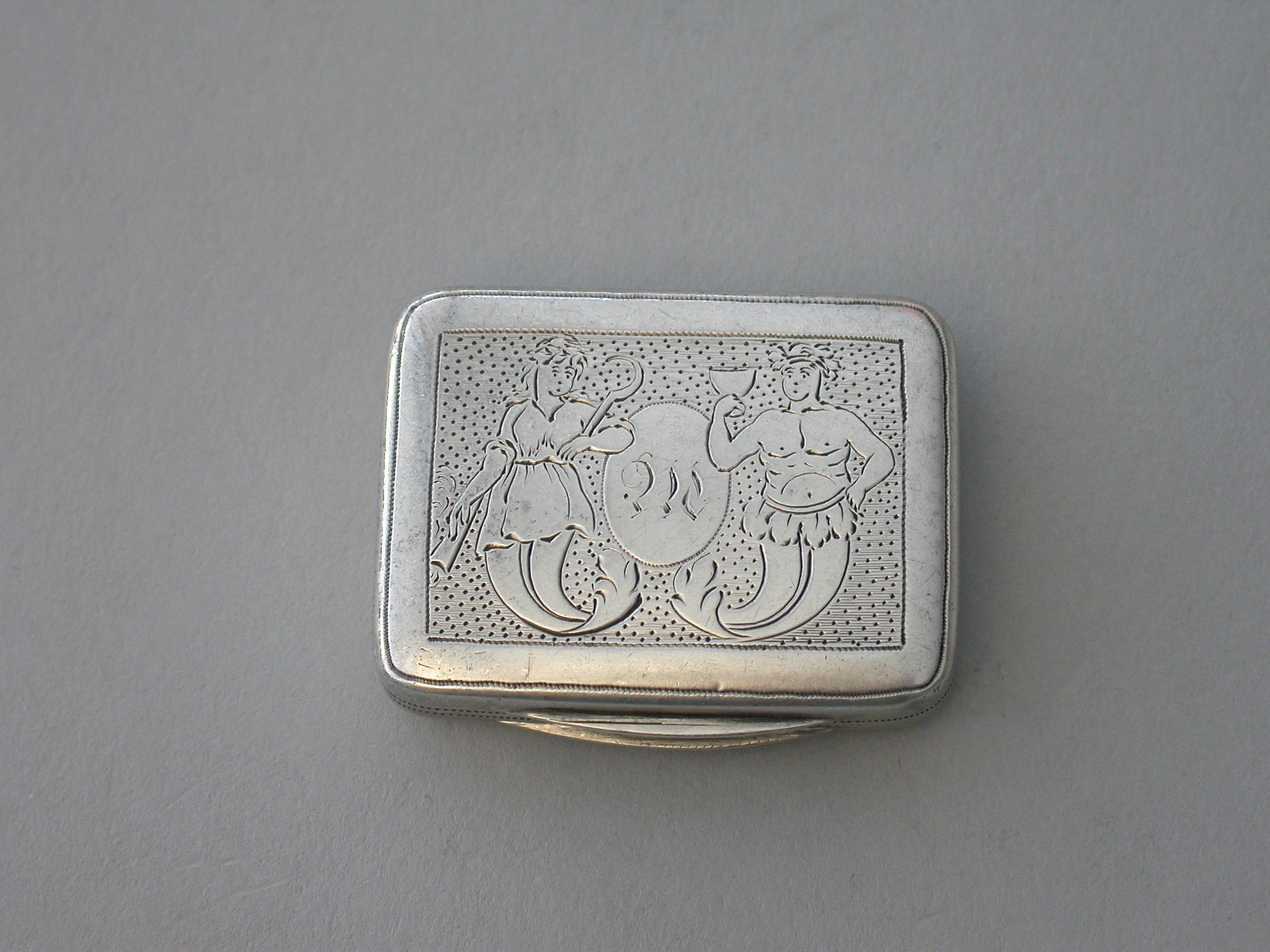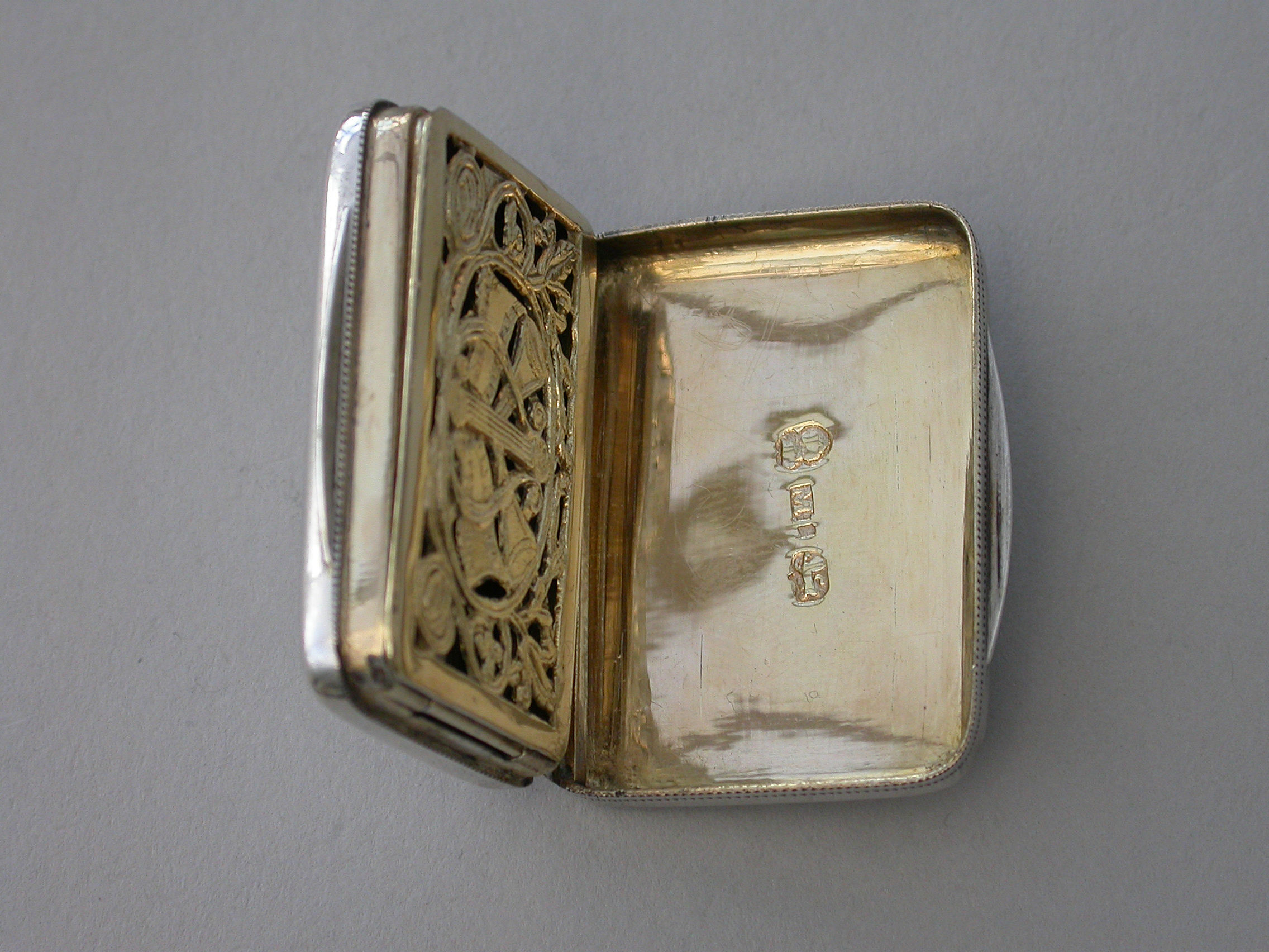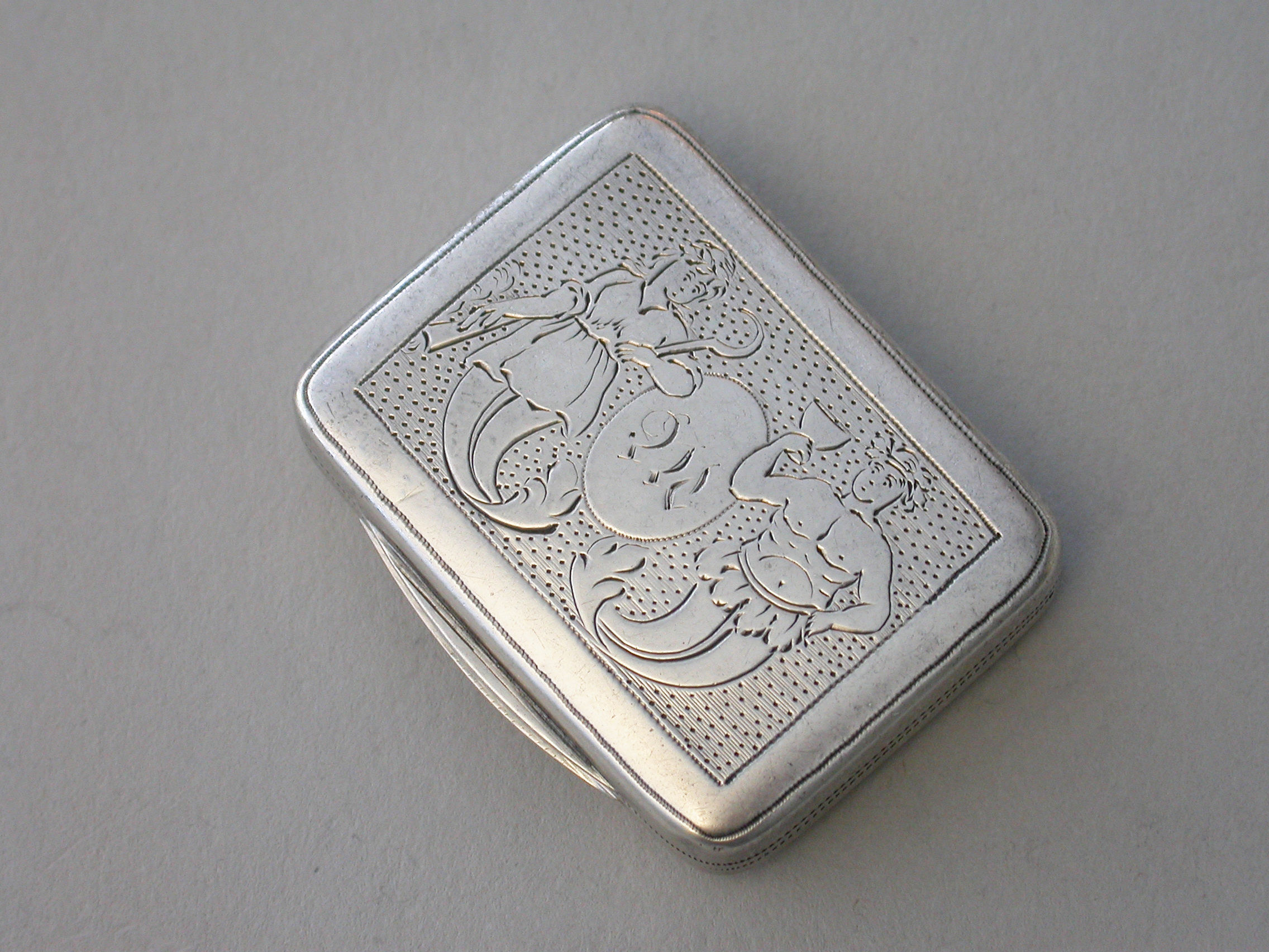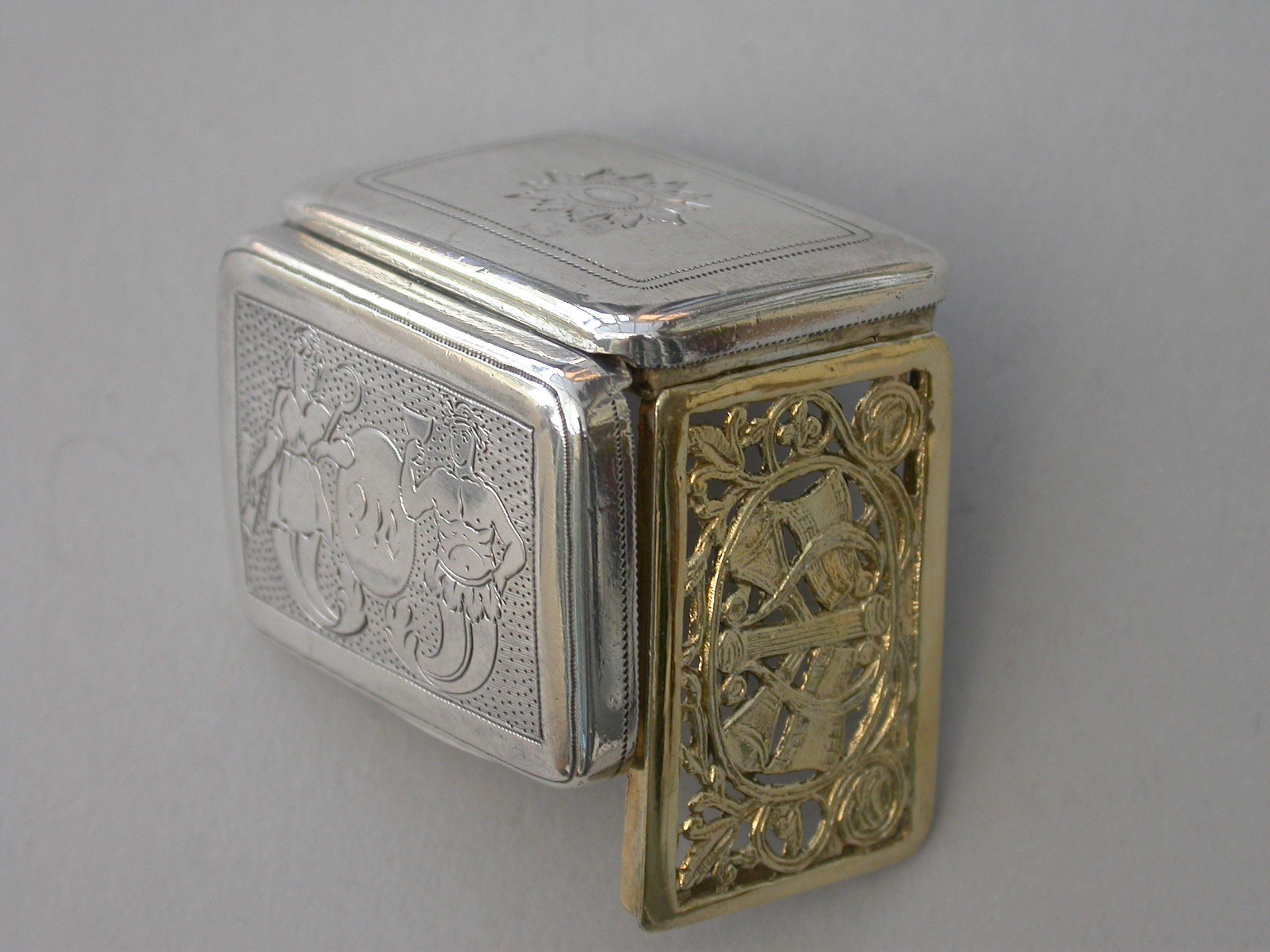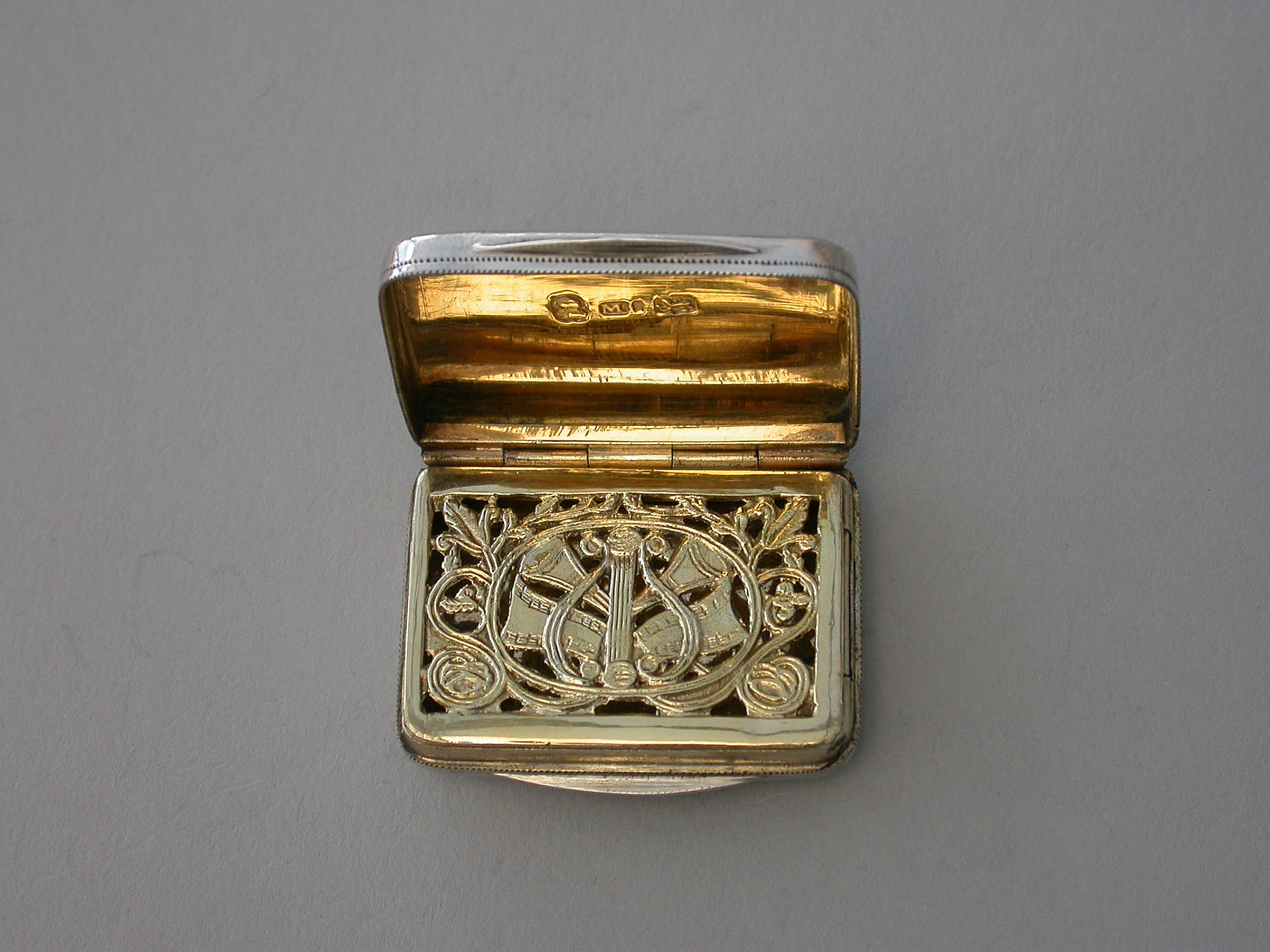 An extremely rare George III silver Vinaigrette of rounded rectangular form, the cover with engraved panel depicting the Greek Gods Demeter and Dionysus in abstract form, either side of an oval cartouche engraved with a stylised letter M, all on a prick-dot engraved background. The silver gilt interior grille pierced with musical instruments including a lyre, two bugles and two sheets of music.