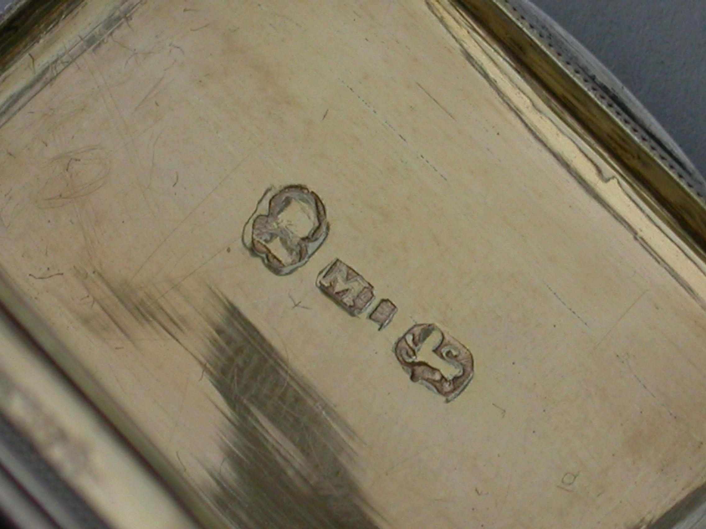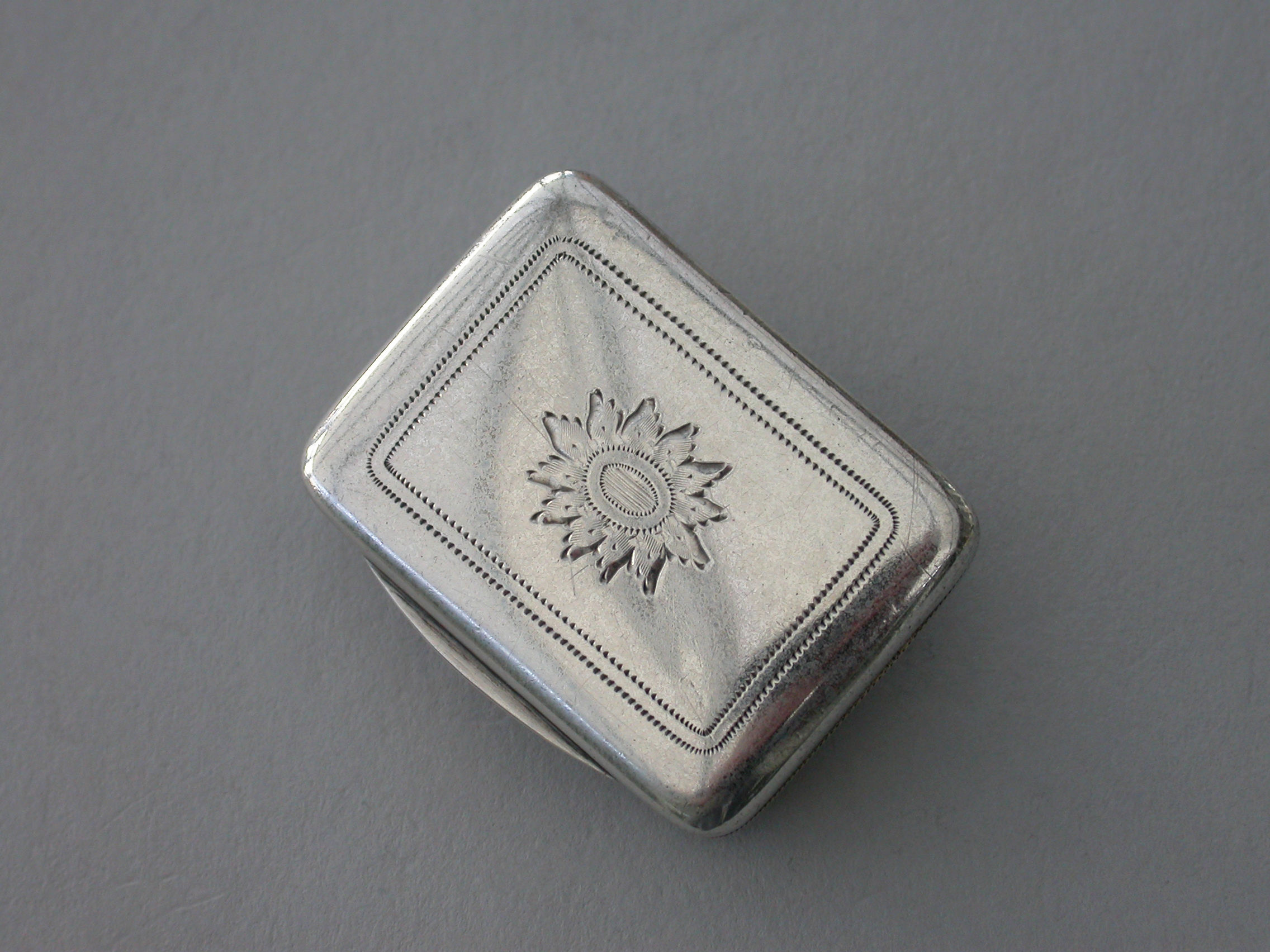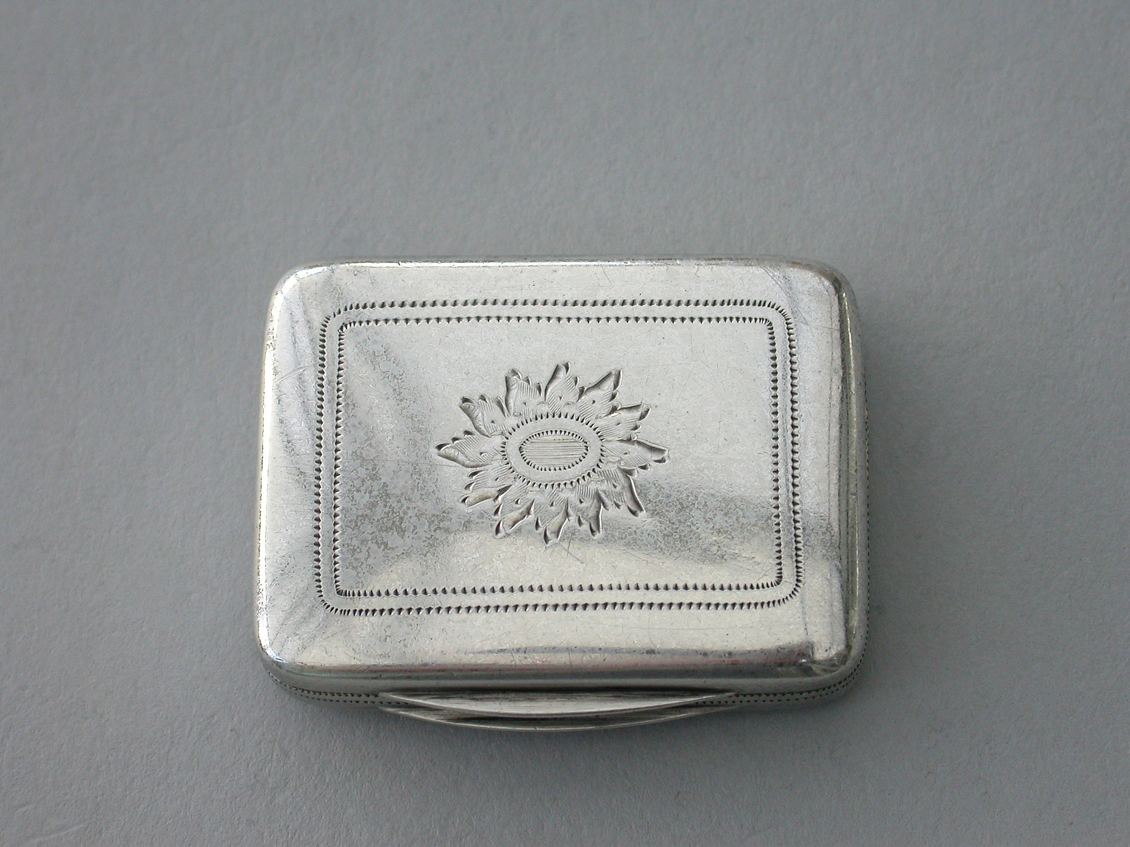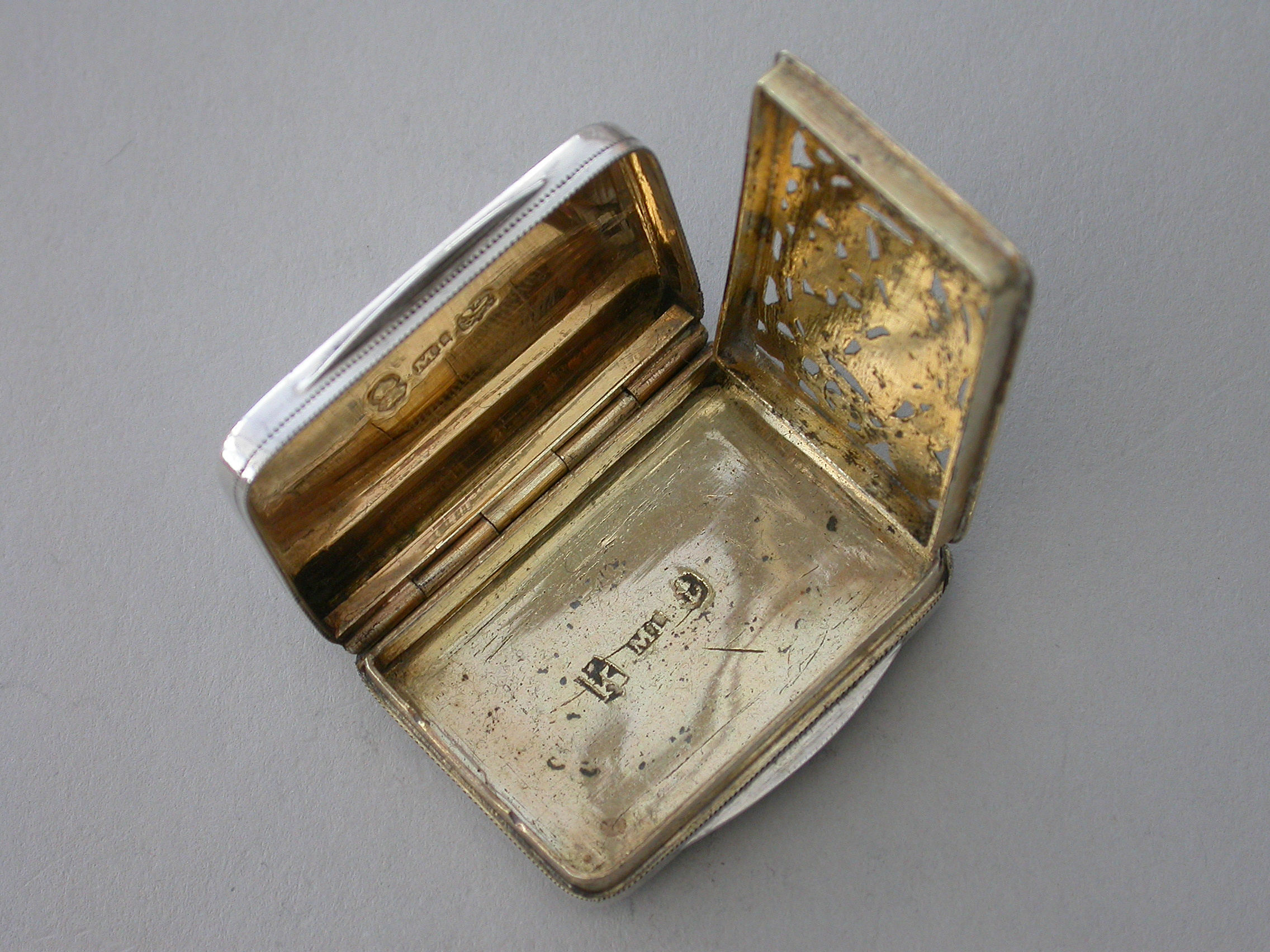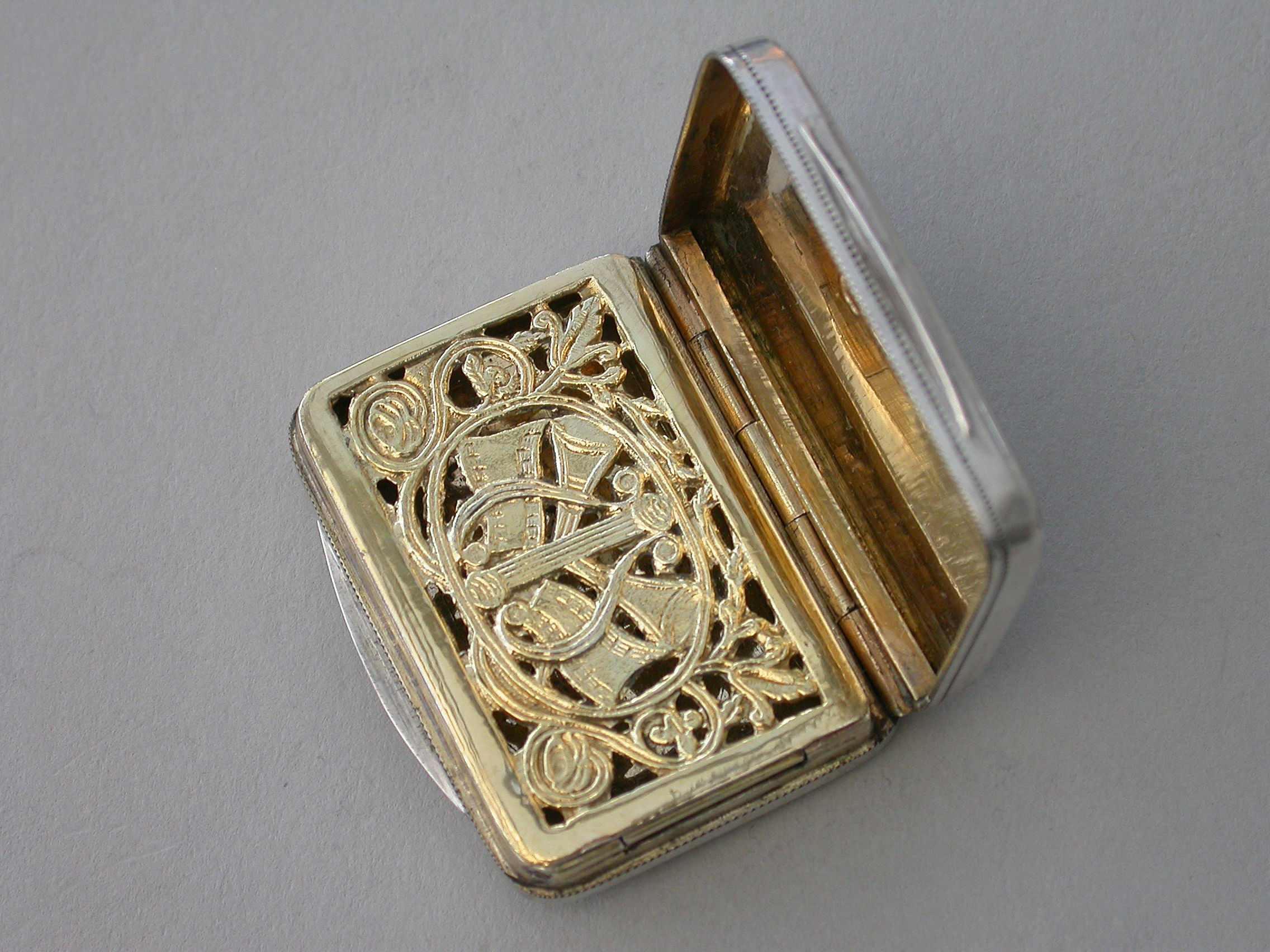 An extremely rare George III silver Vinaigrette of rounded rectangular form, the cover with engraved panel depicting the Greek Gods Demeter and Dionysus in abstract form, either side of an oval cartouche engraved with a stylised letter M, all on a prick-dot engraved background. The silver gilt interior grille pierced with musical instruments including a lyre, two bugles and two sheets of music.