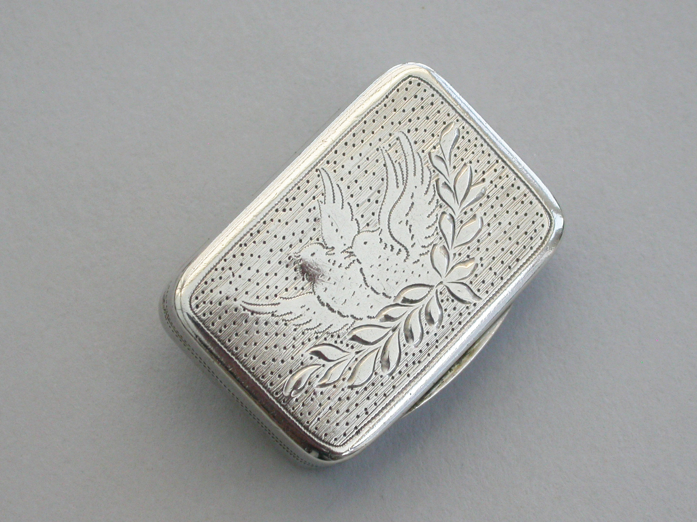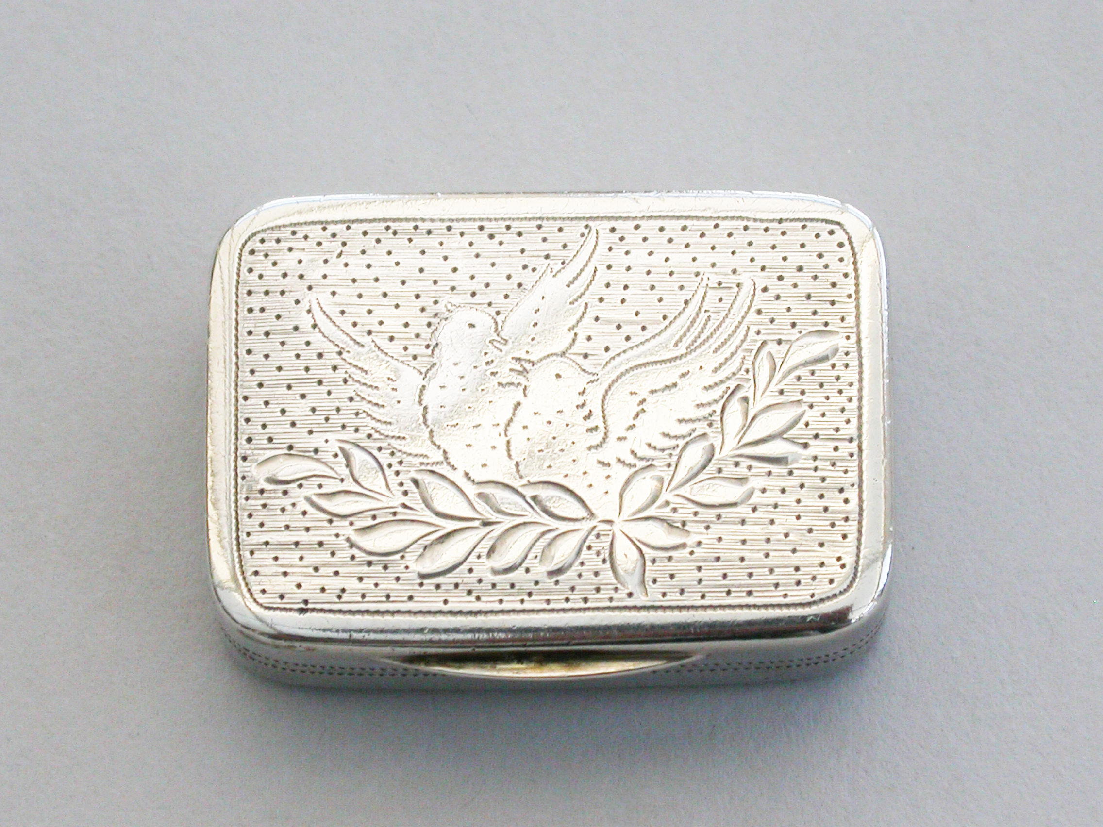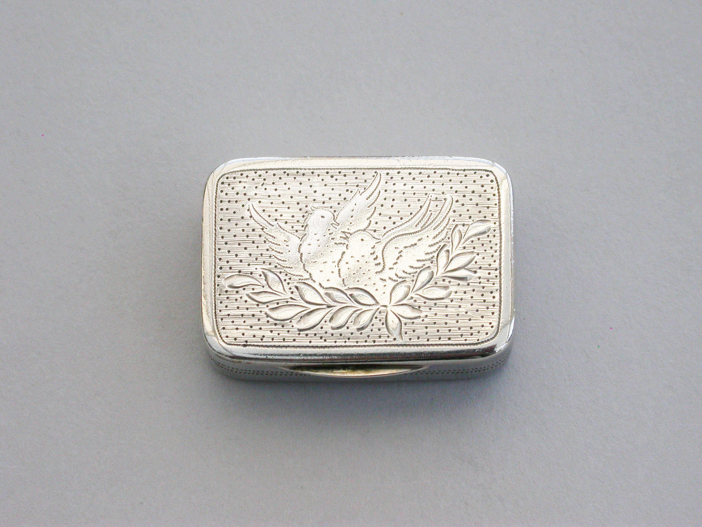A rare George III silver Vinaigrette of rounded rectangular form, the cover engraved with a pair of Doves siting on an olive branch with prick-dot background. The base with prick-dot borders and a central stylised flower head. The silver gilt interior with a hinged grille pierced with a vase of trailing flowers.