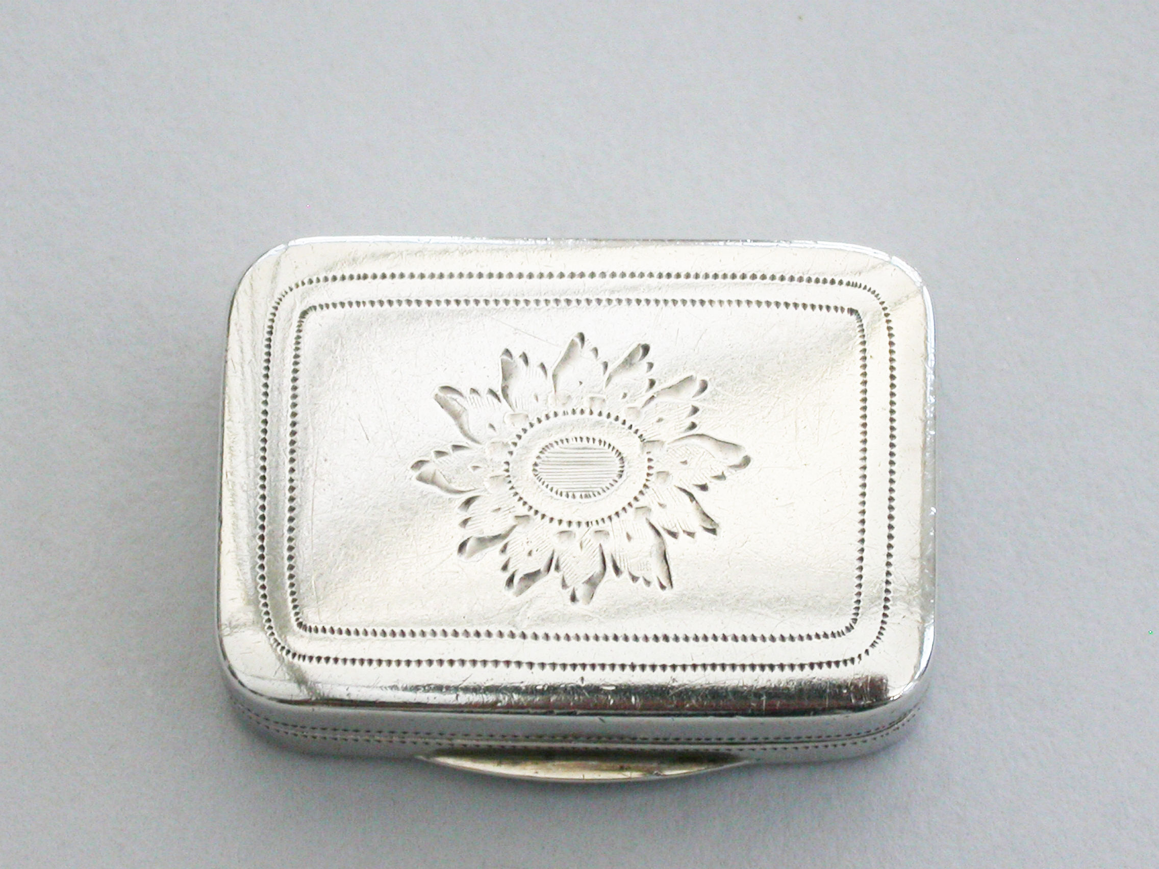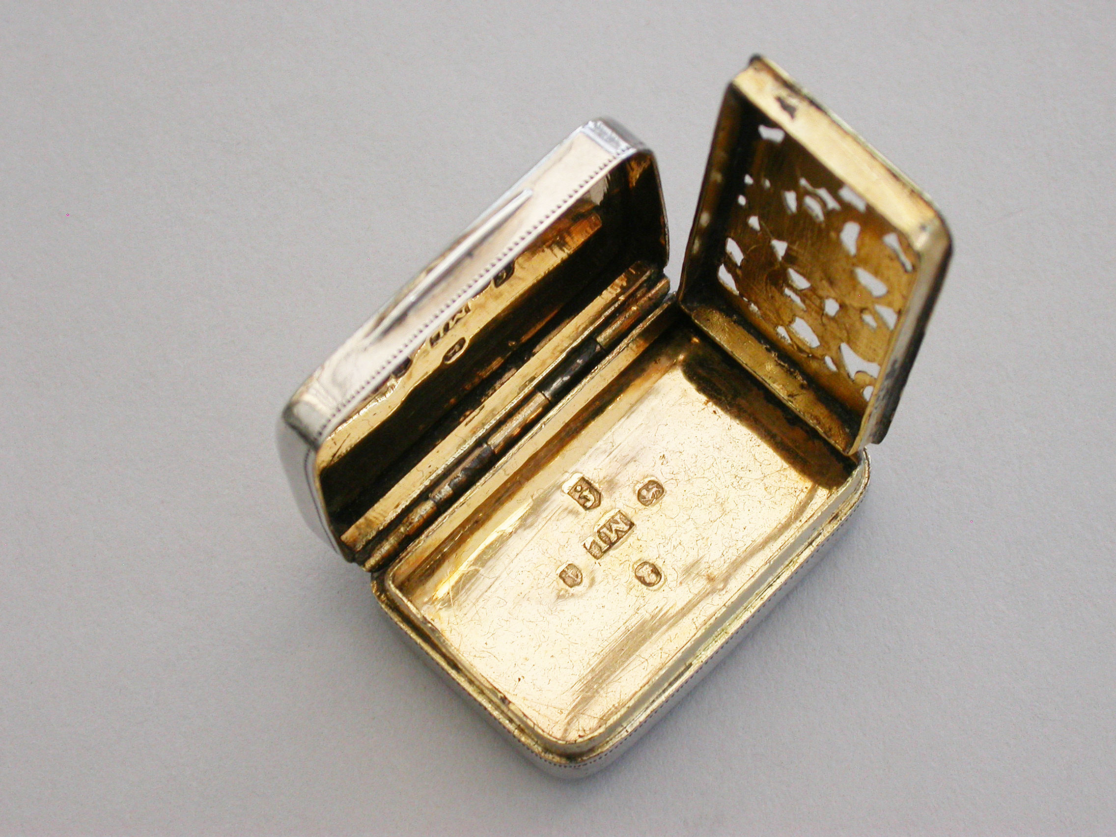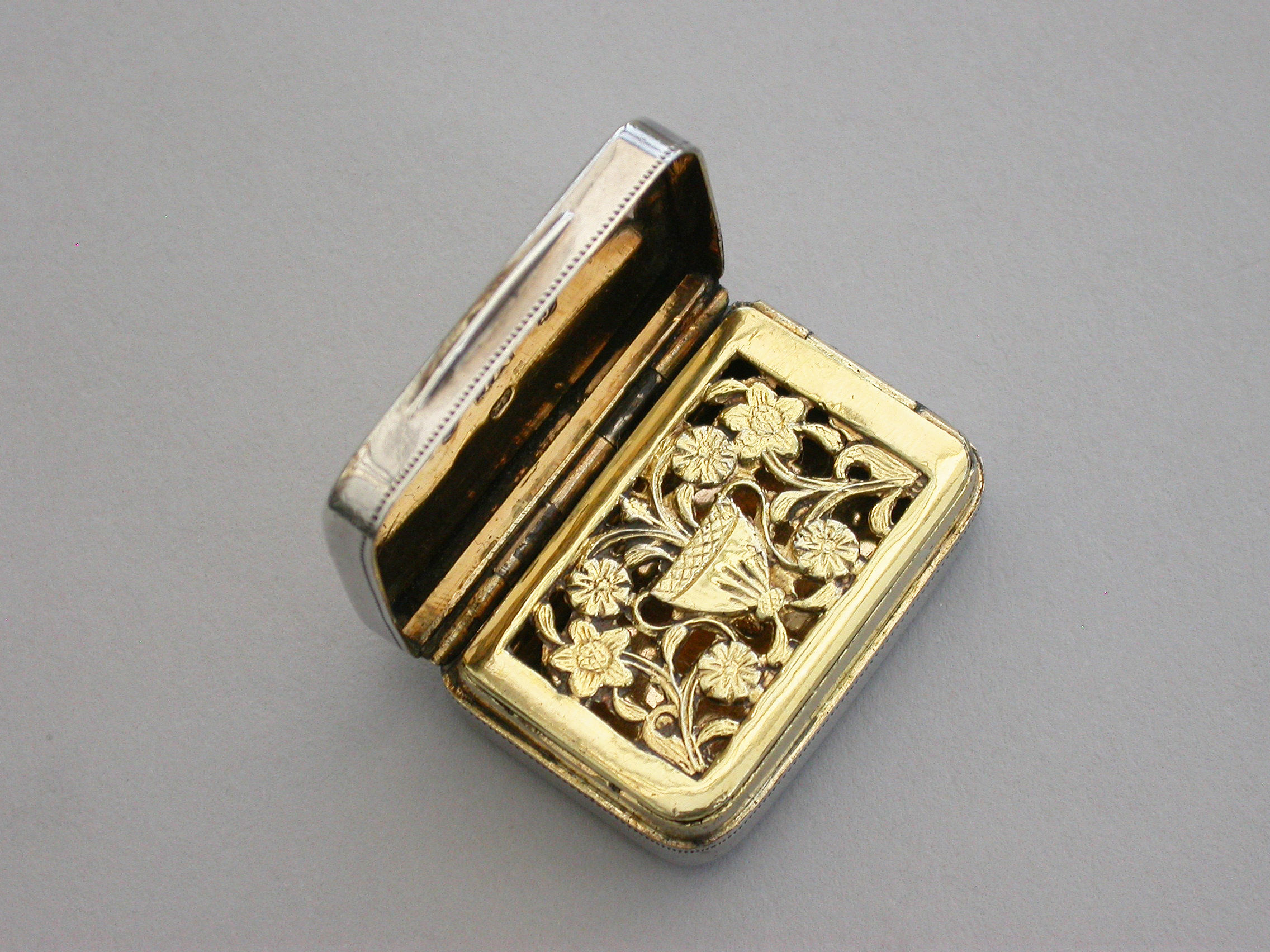 A rare George III silver Vinaigrette of rounded rectangular form, the cover engraved with a pair of Doves siting on an olive branch with prick-dot background. The base with prick-dot borders and a central stylised flower head. The silver gilt interior with a hinged grille pierced with a vase of trailing flowers.