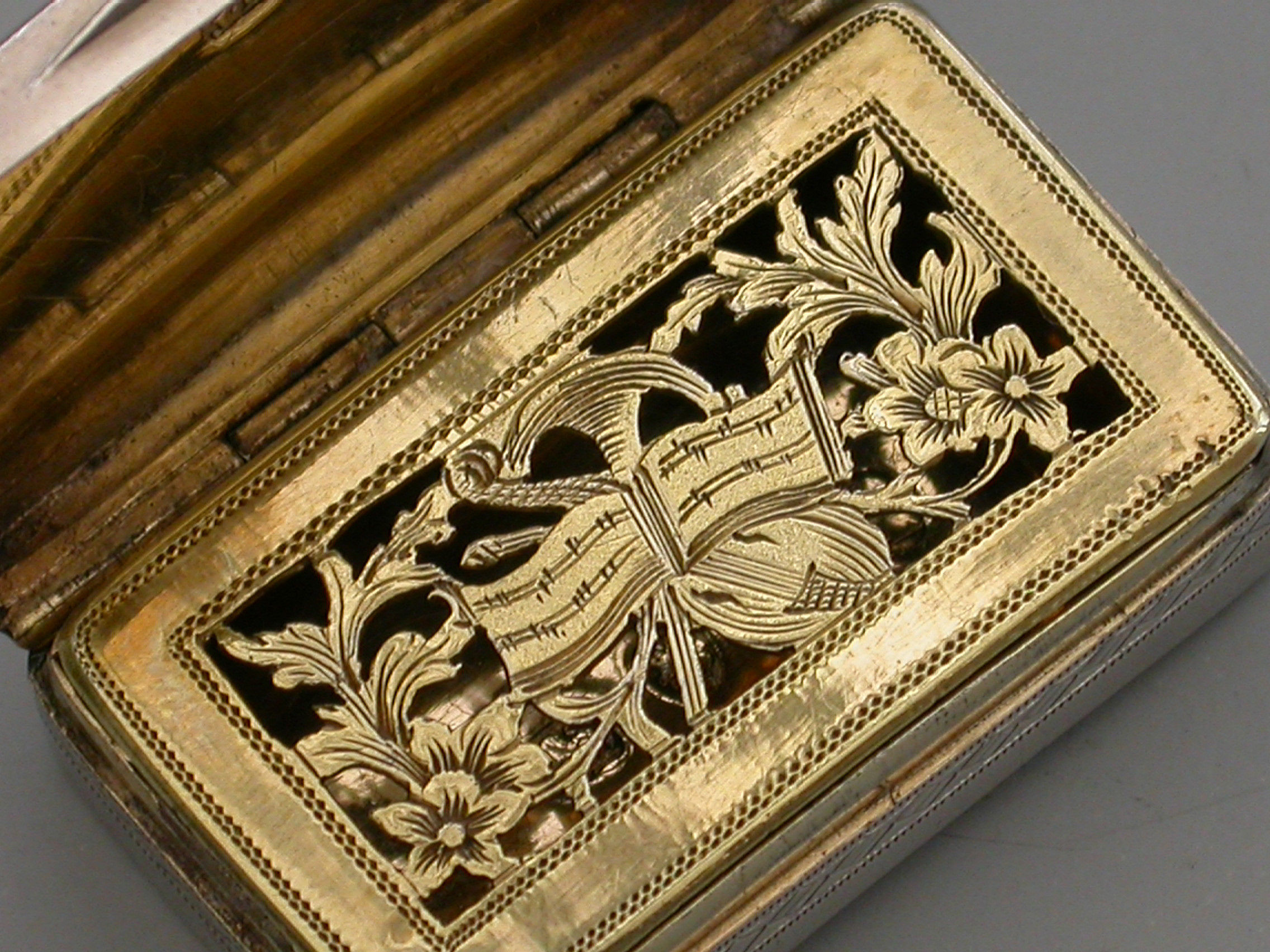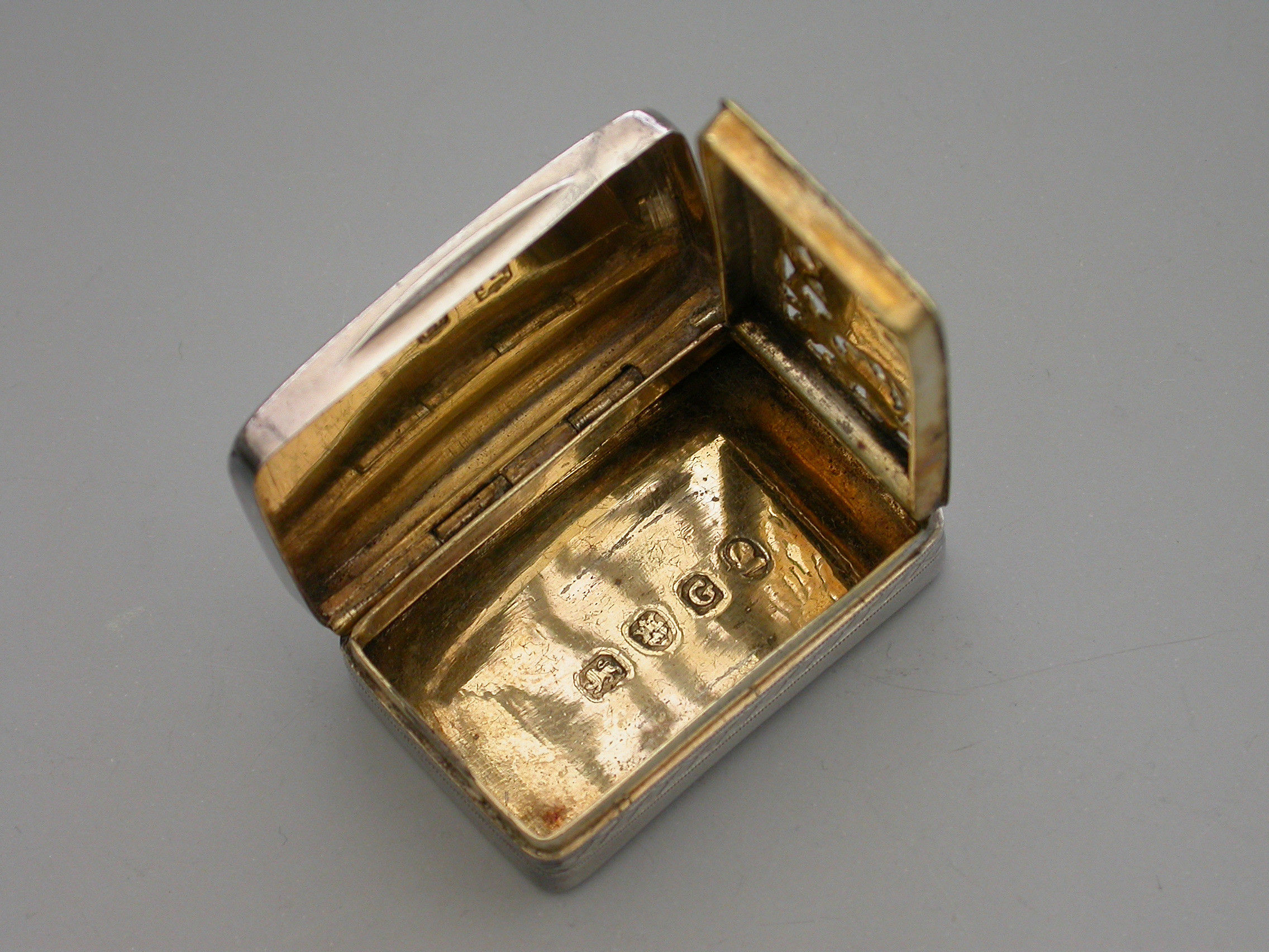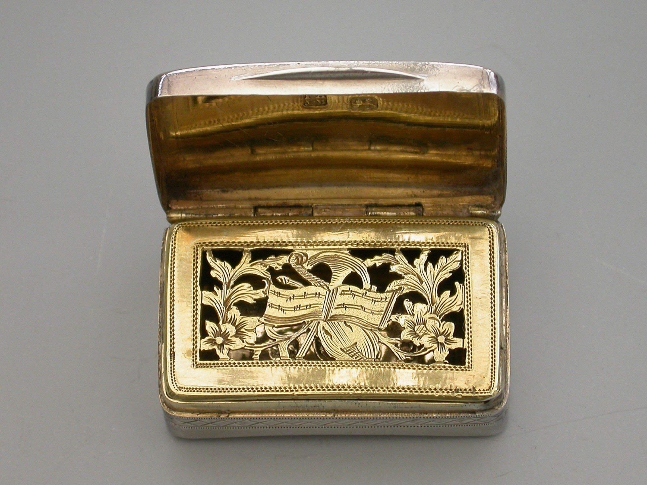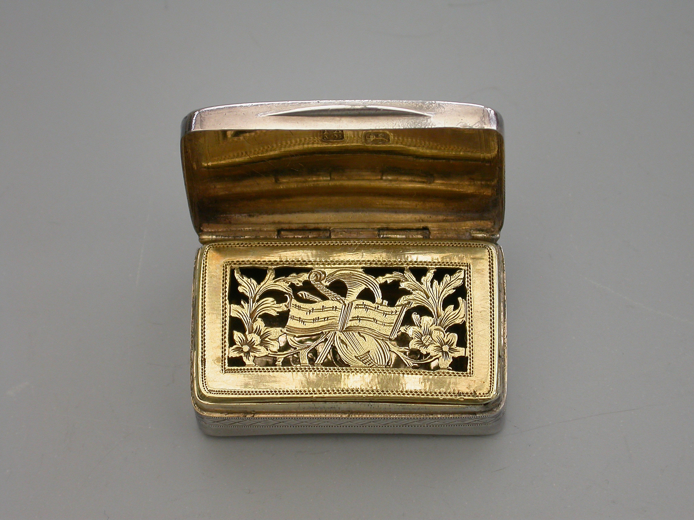 A rare George III silver Vinaigrette of rounded rectangular form with curved base, the lid with a central rectangular cartouche engraved with contemporary initials ‘E.J’, within bands of cross-hatched engraved decoration also echoed on the sides and bordering the base. The silver gilt interior with pierced and engraved “Musical Grille” depicting a Lute a Horn and Sheet Music within symmetrical flowering scrolls to either side.