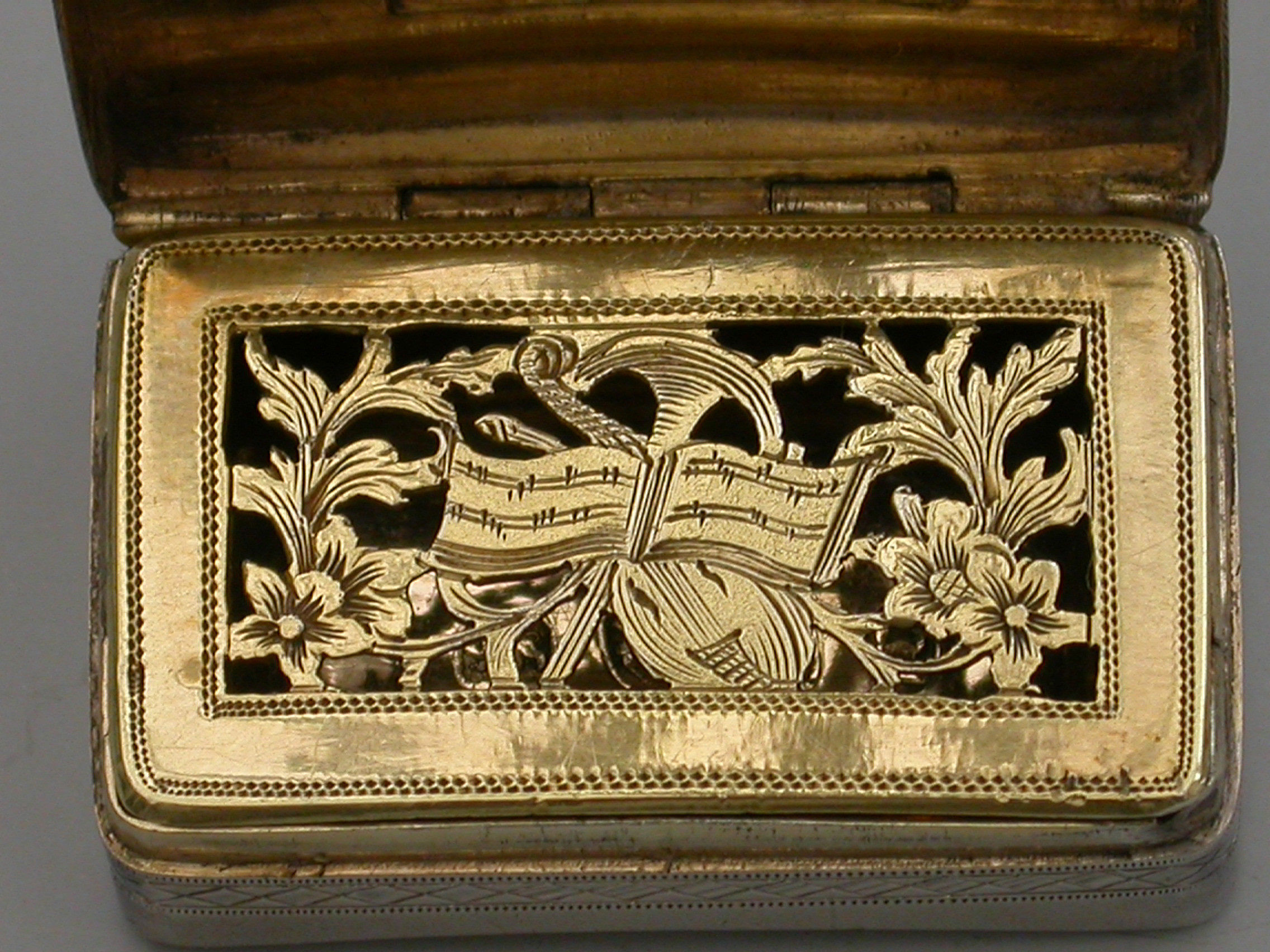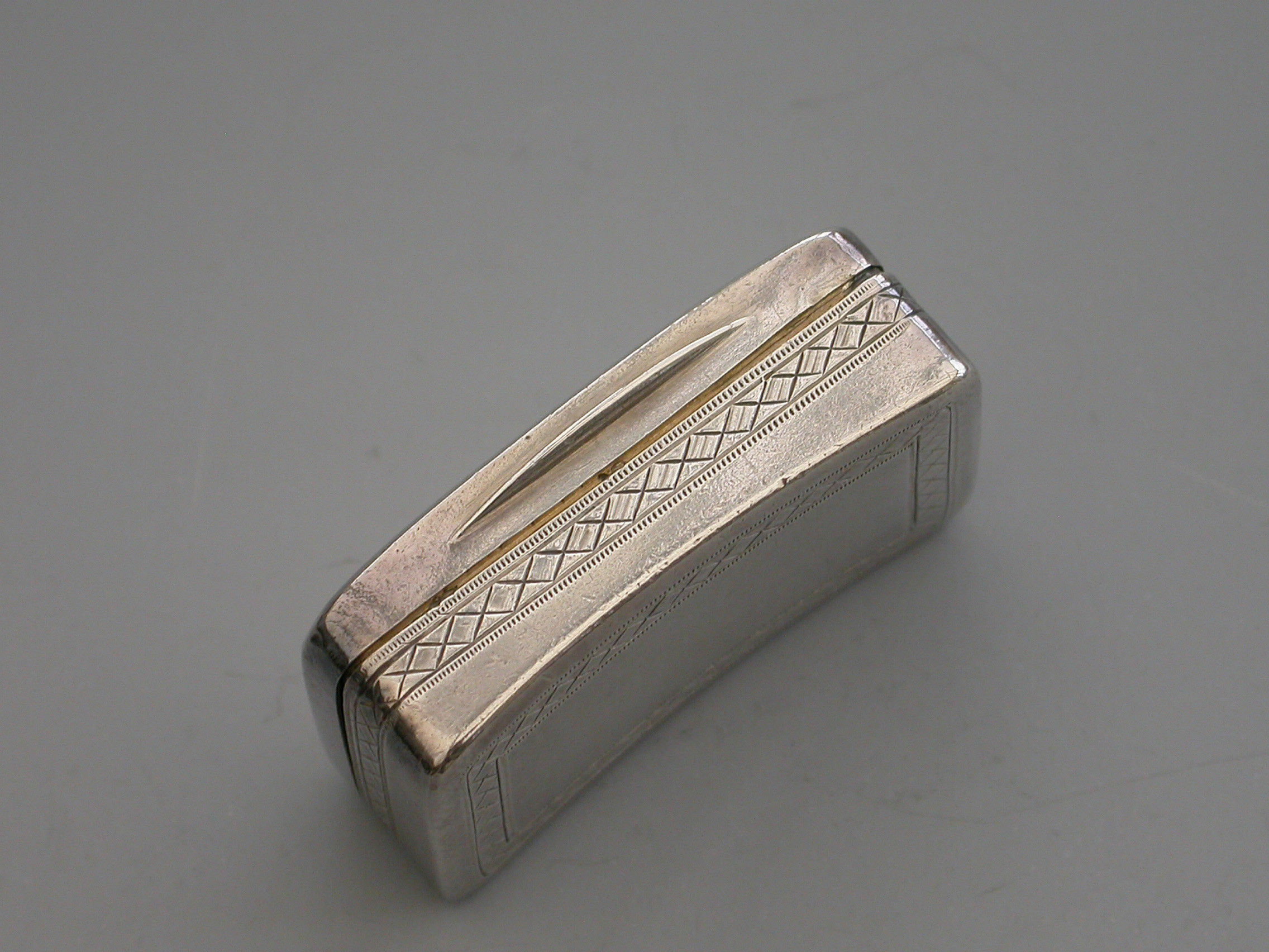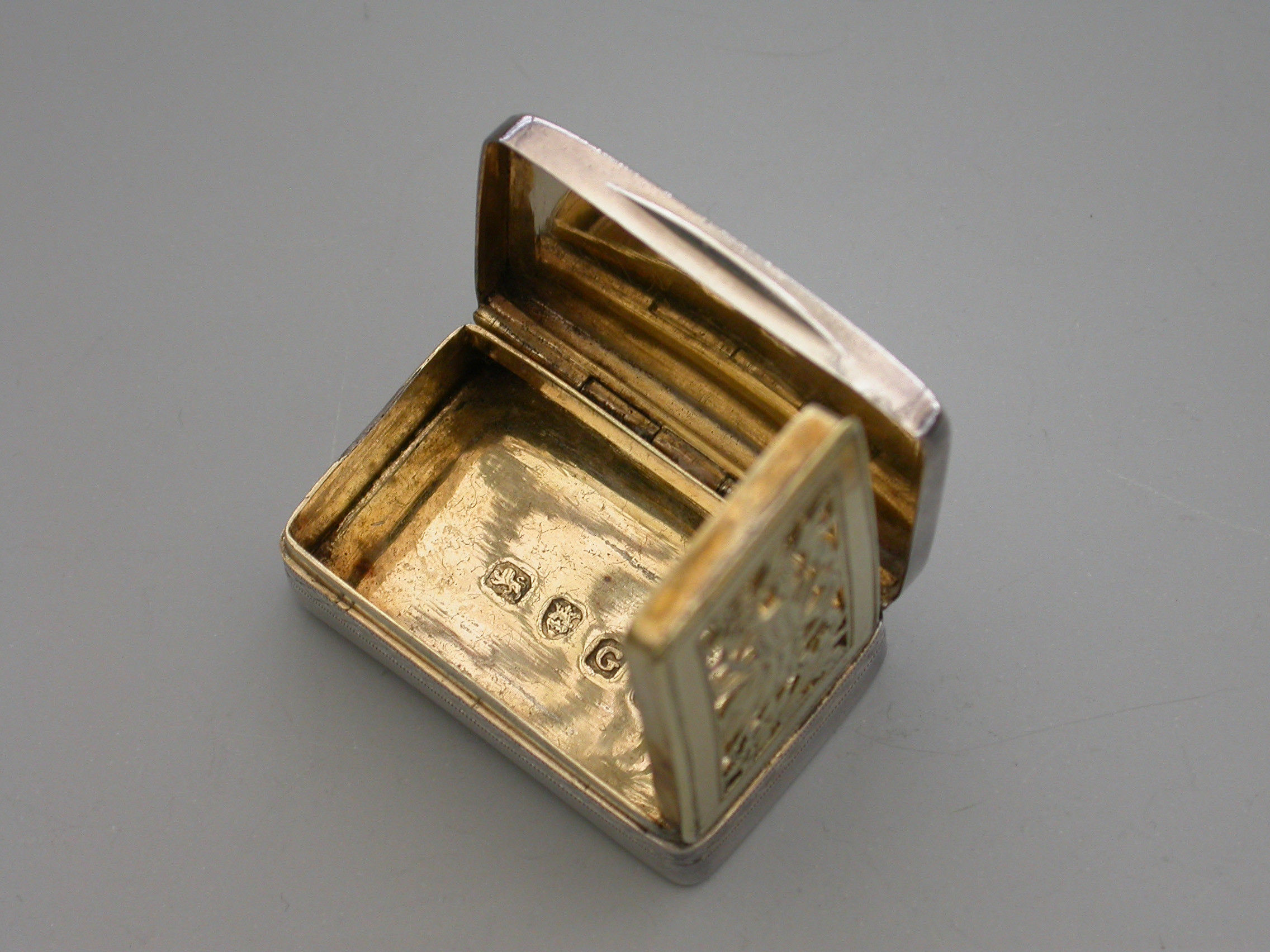 A rare George III silver Vinaigrette of rounded rectangular form with curved base, the lid with a central rectangular cartouche engraved with contemporary initials ‘E.J’, within bands of cross-hatched engraved decoration also echoed on the sides and bordering the base. The silver gilt interior with pierced and engraved “Musical Grille” depicting a Lute a Horn and Sheet Music within symmetrical flowering scrolls to either side.