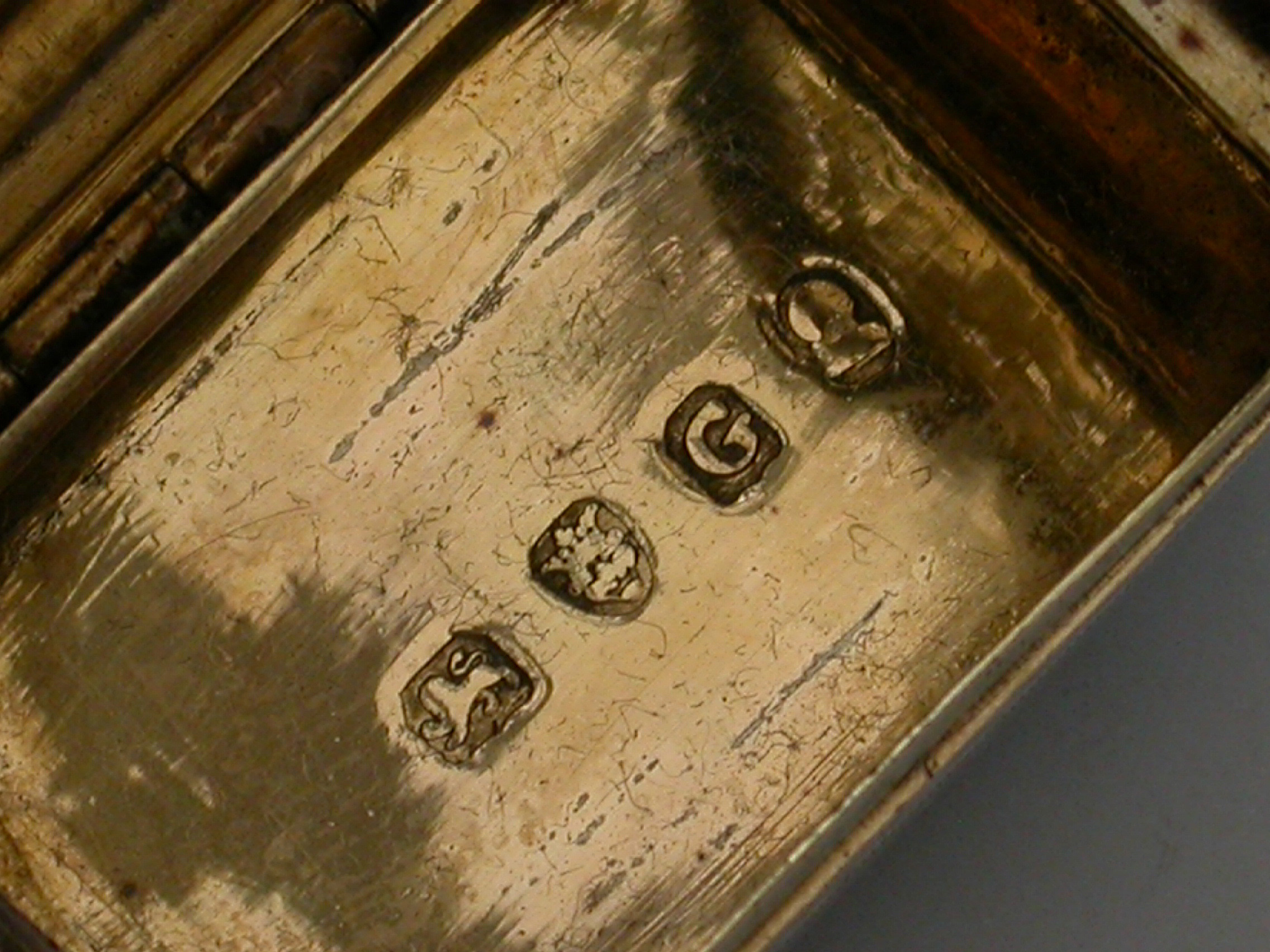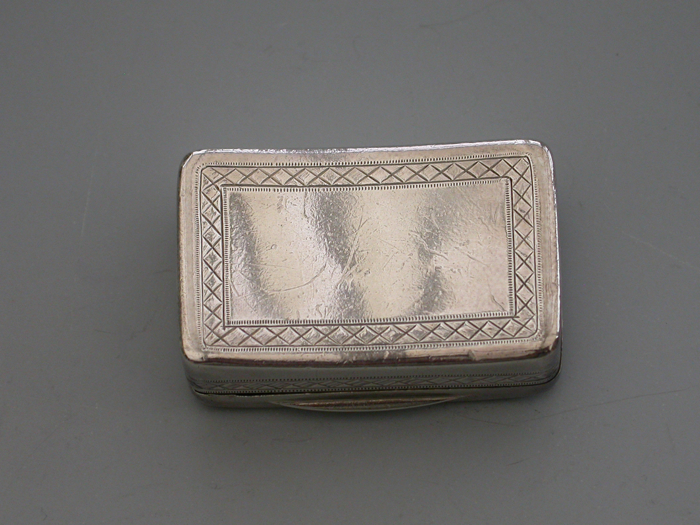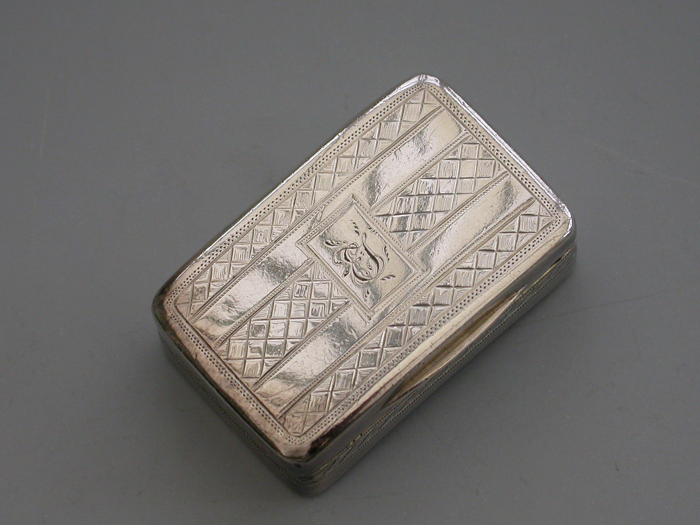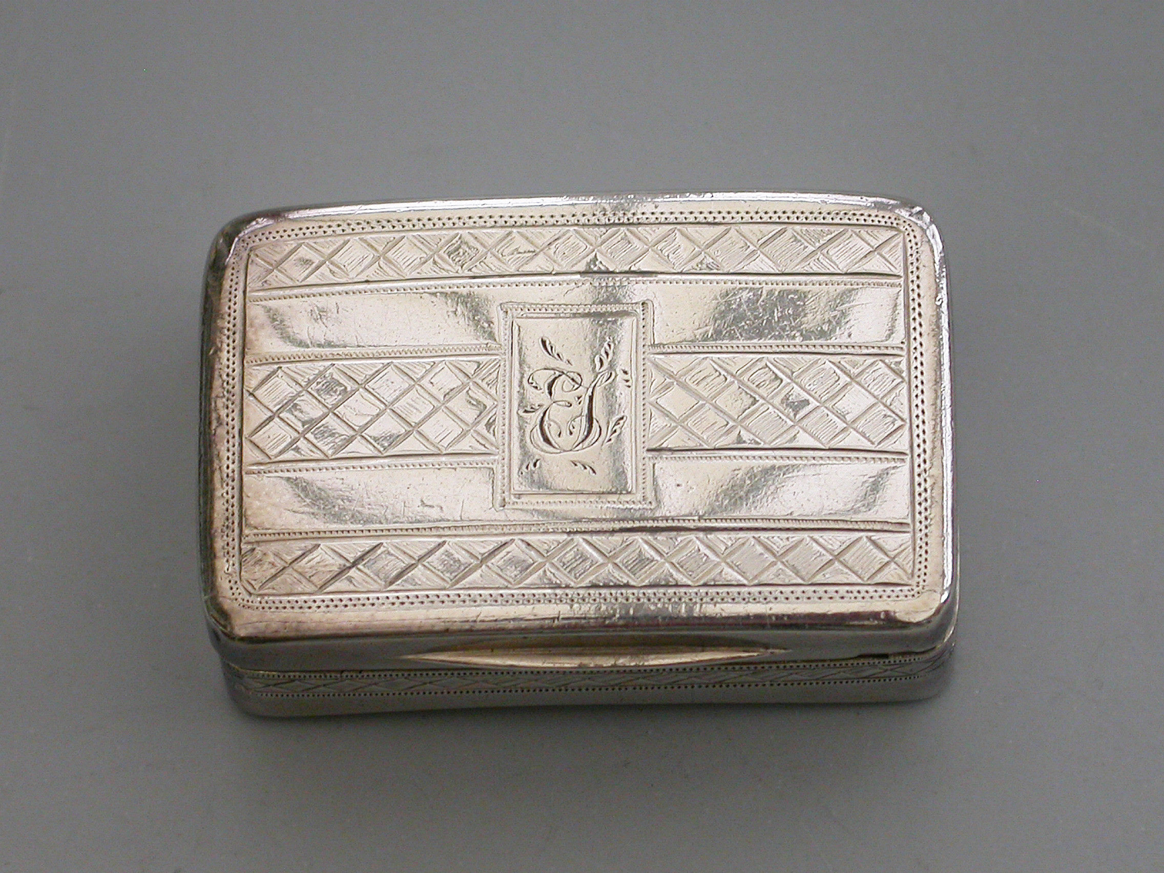 A rare George III silver Vinaigrette of rounded rectangular form with curved base, the lid with a central rectangular cartouche engraved with contemporary initials ‘E.J’, within bands of cross-hatched engraved decoration also echoed on the sides and bordering the base. The silver gilt interior with pierced and engraved “Musical Grille” depicting a Lute a Horn and Sheet Music within symmetrical flowering scrolls to either side.