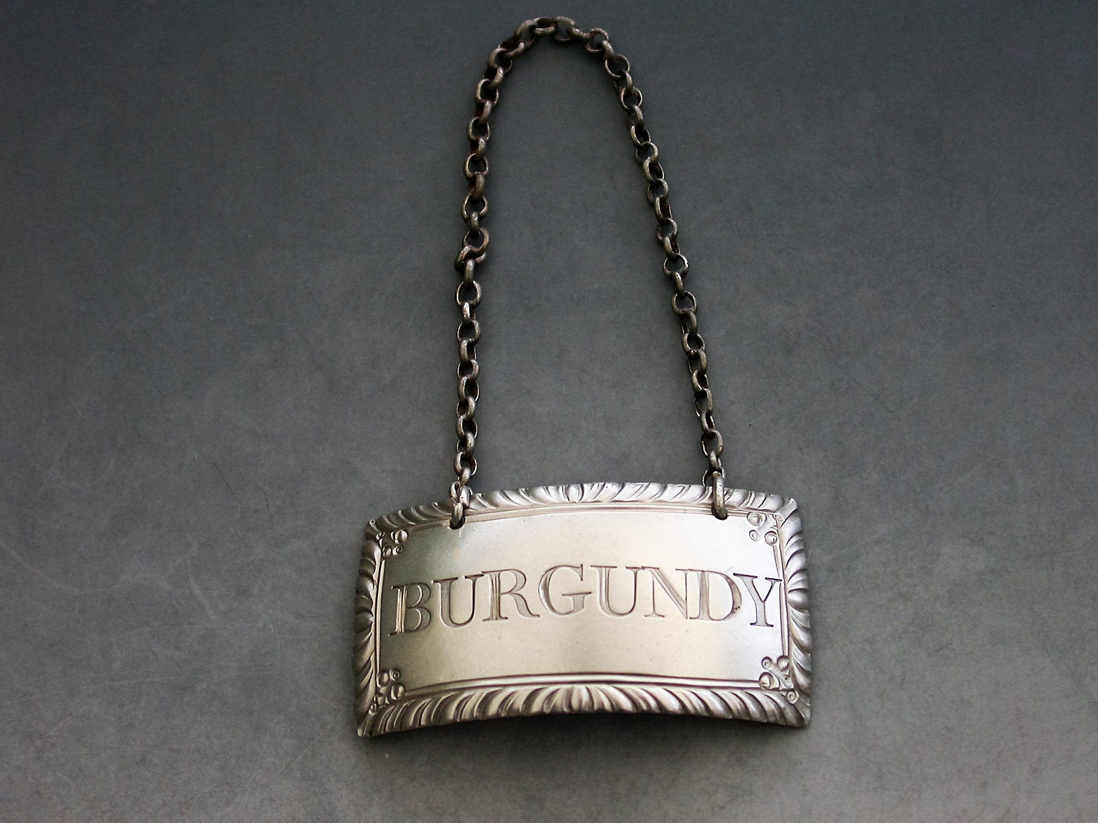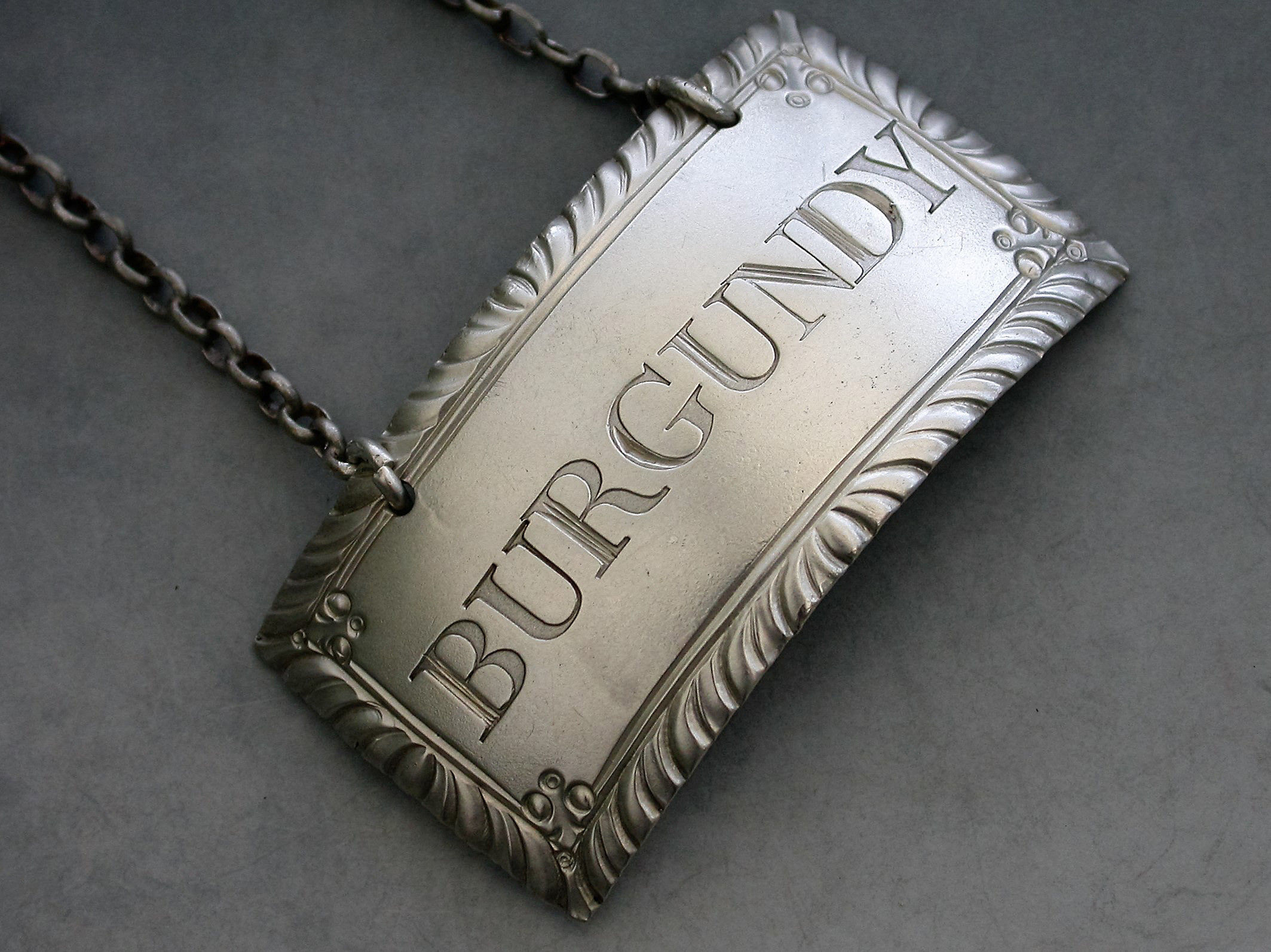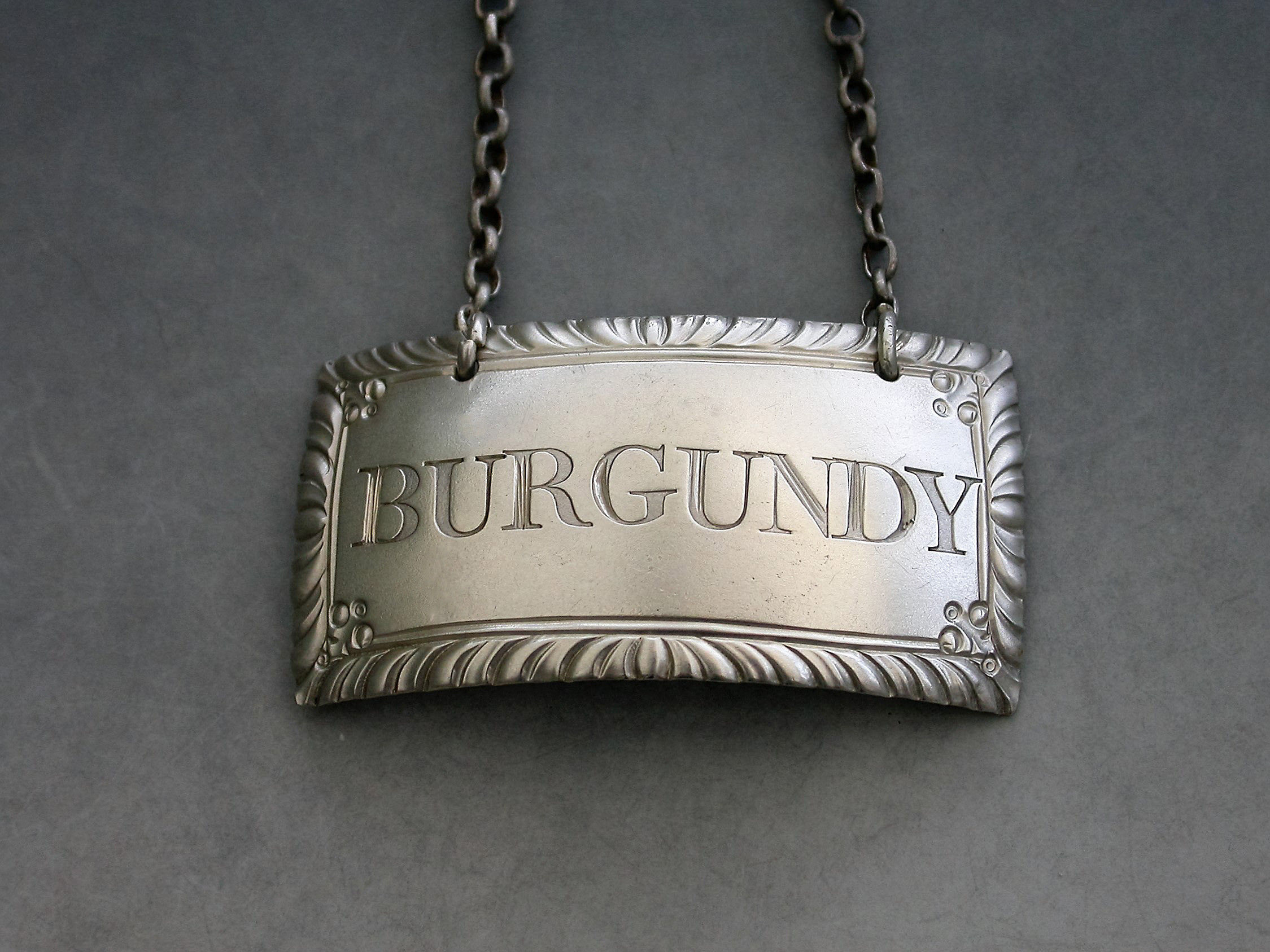 A good George III silver Wine Label of curved rectangular form with gadrooned border and a floral device at each corner, incised for Burgundy.
