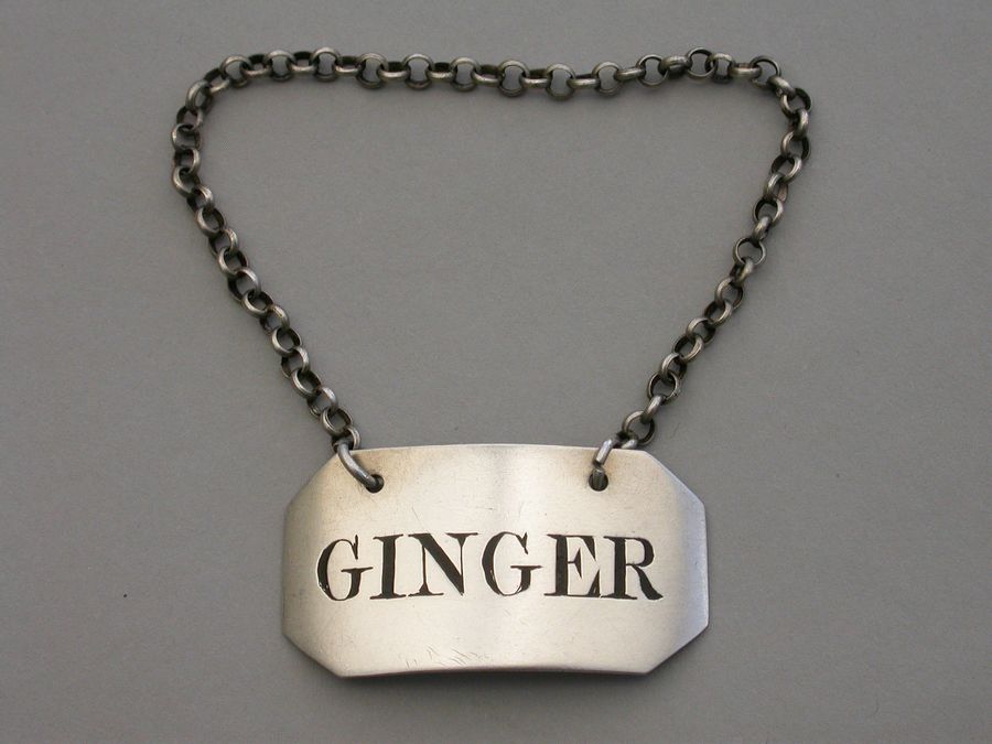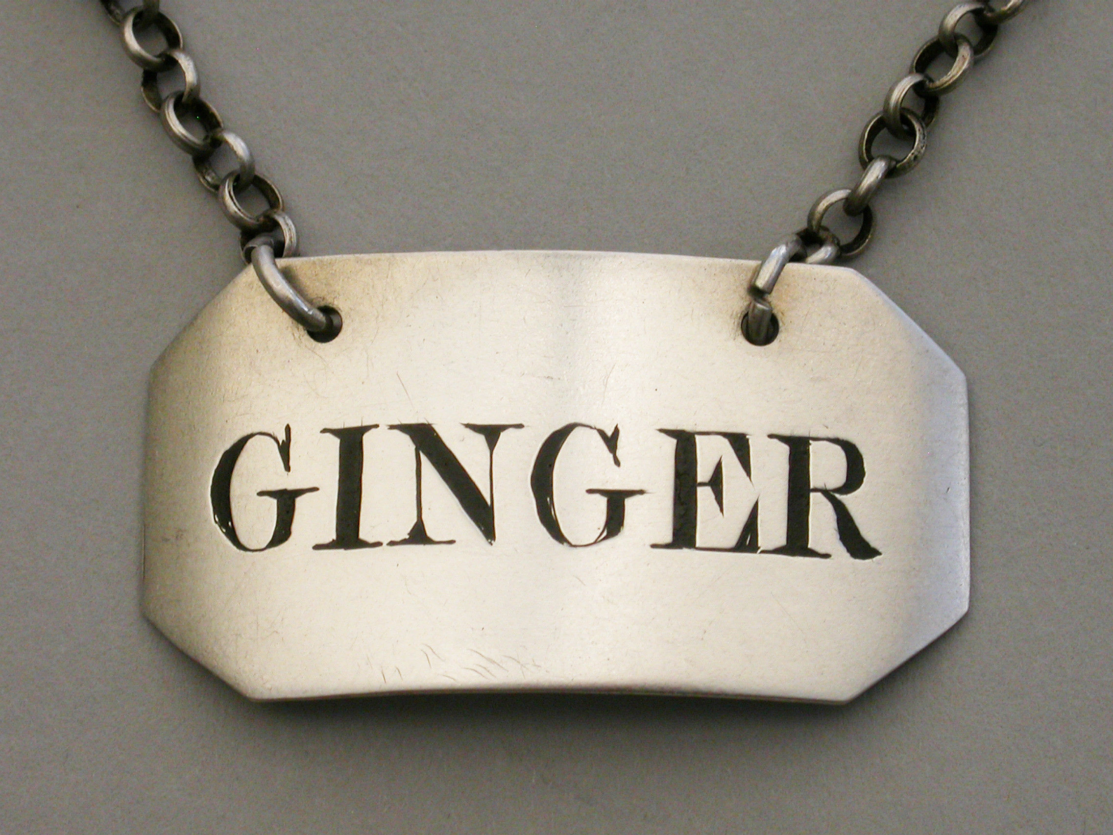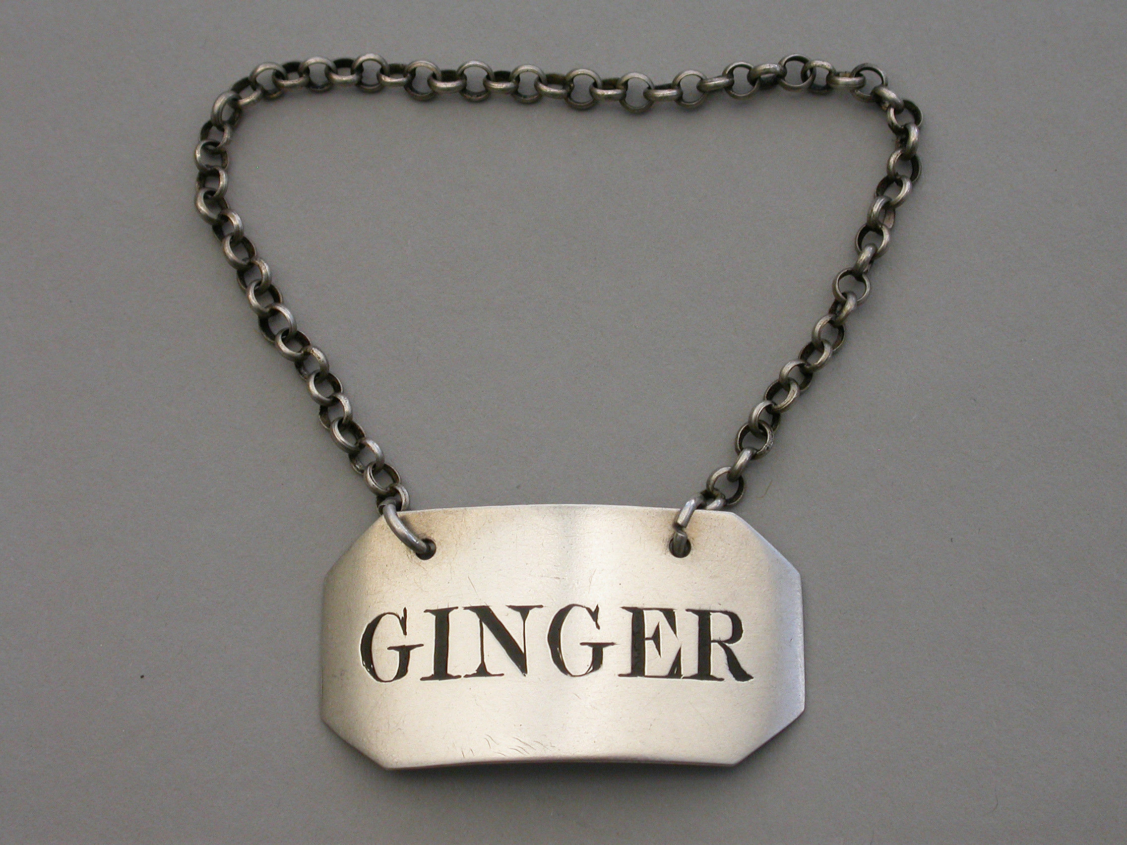 A rare George III silver Wine Label of plain cut-cornered rectangular form, incised and niello filled for Ginger.