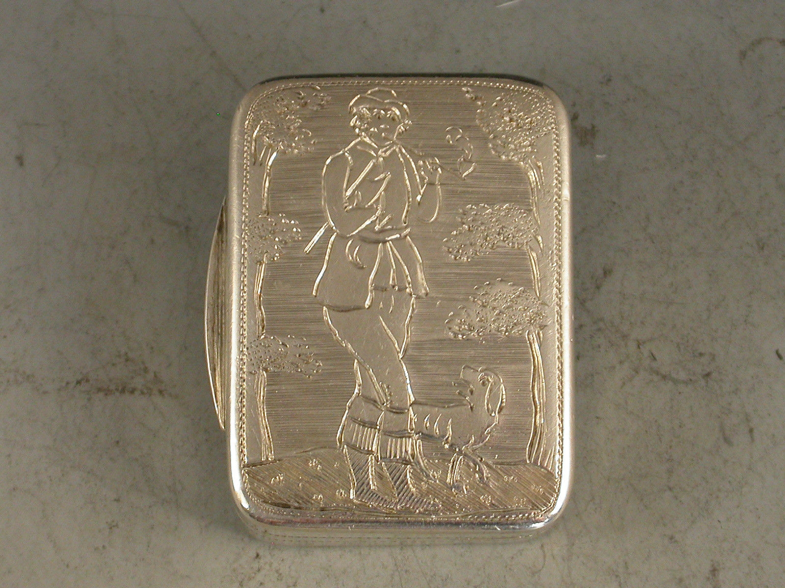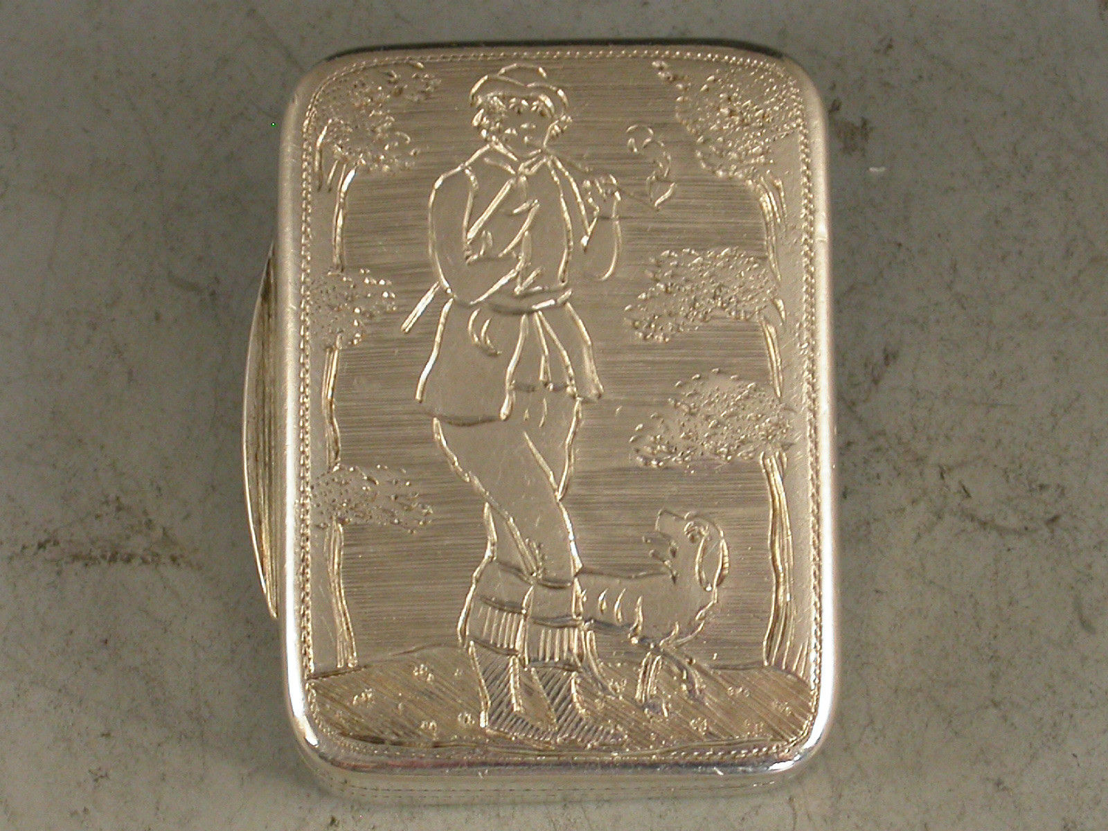 A very rare George III silver Vinaigrette of plain rounded rectangular form, the base and sides with prick-dot engraved decoration, the lid engraved with a scene depicting a Woodcutter smoking a pipe with a dog at his heals. The silver gilt interior with intricately pierced grille including a basket of fruit.