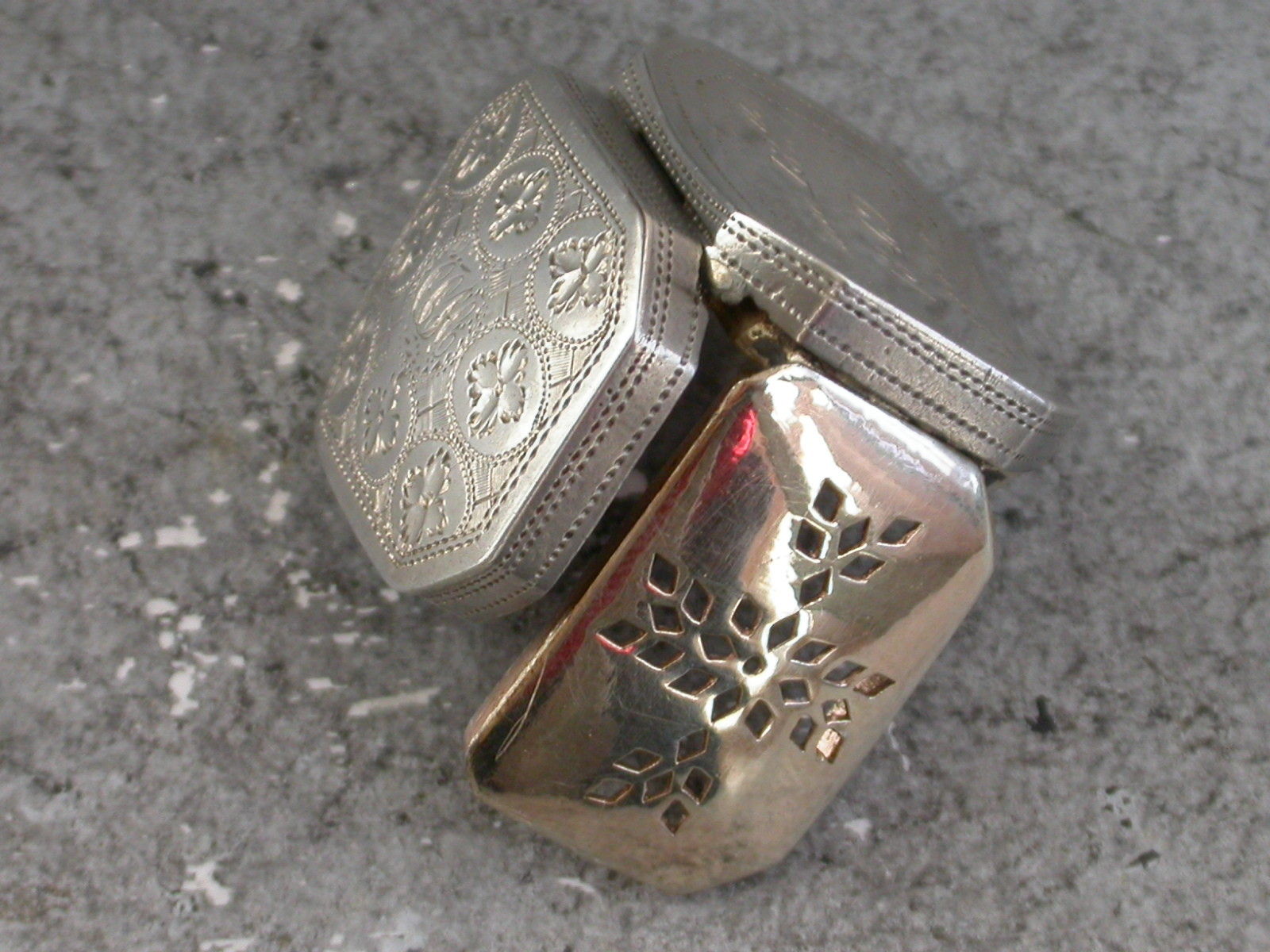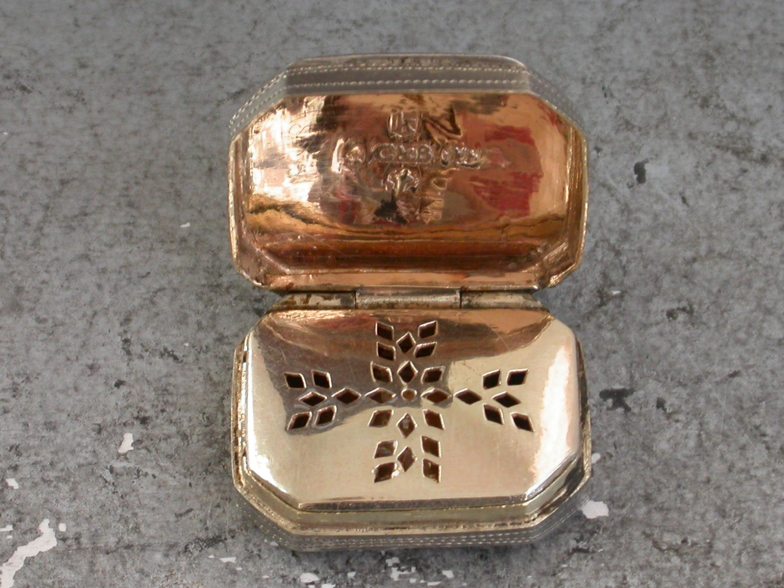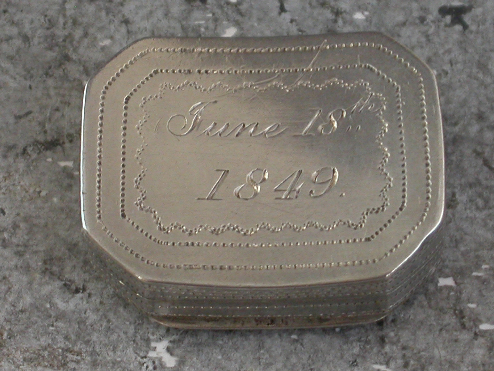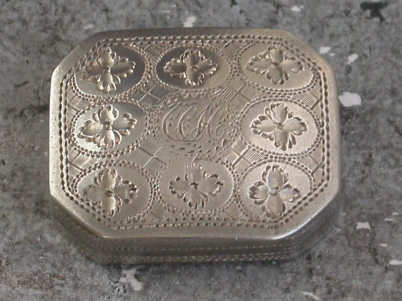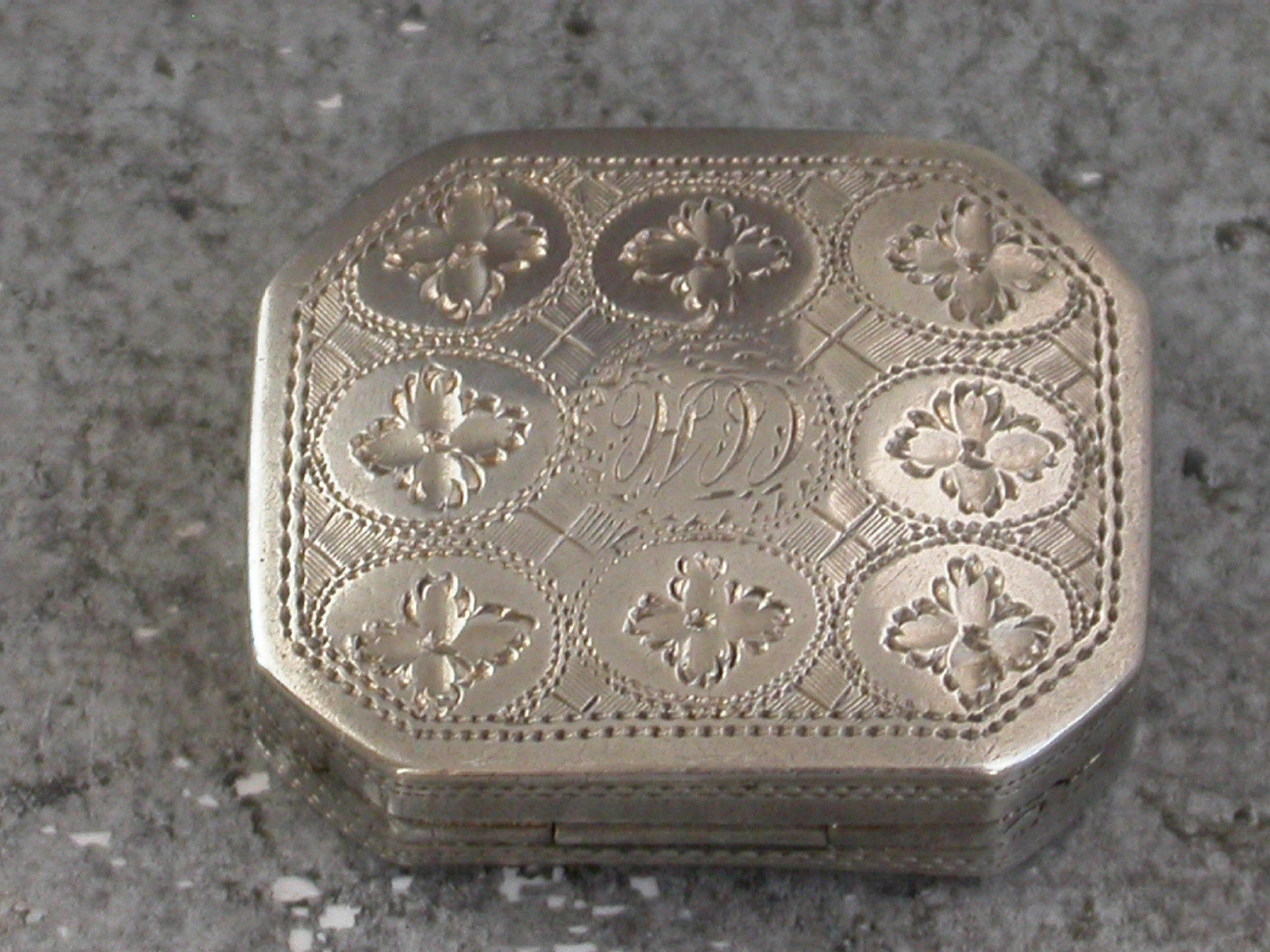 A good George III small silver Vinaigrette of curved cushion shape with cut-corners, the lid decorated with bright-cut engraved flower heads and engraved with contemporary initials, the base with prick-dot engraved borders and slightly later inscription for June 18th 1849. The silver gilt interior with pierced flower head grille.