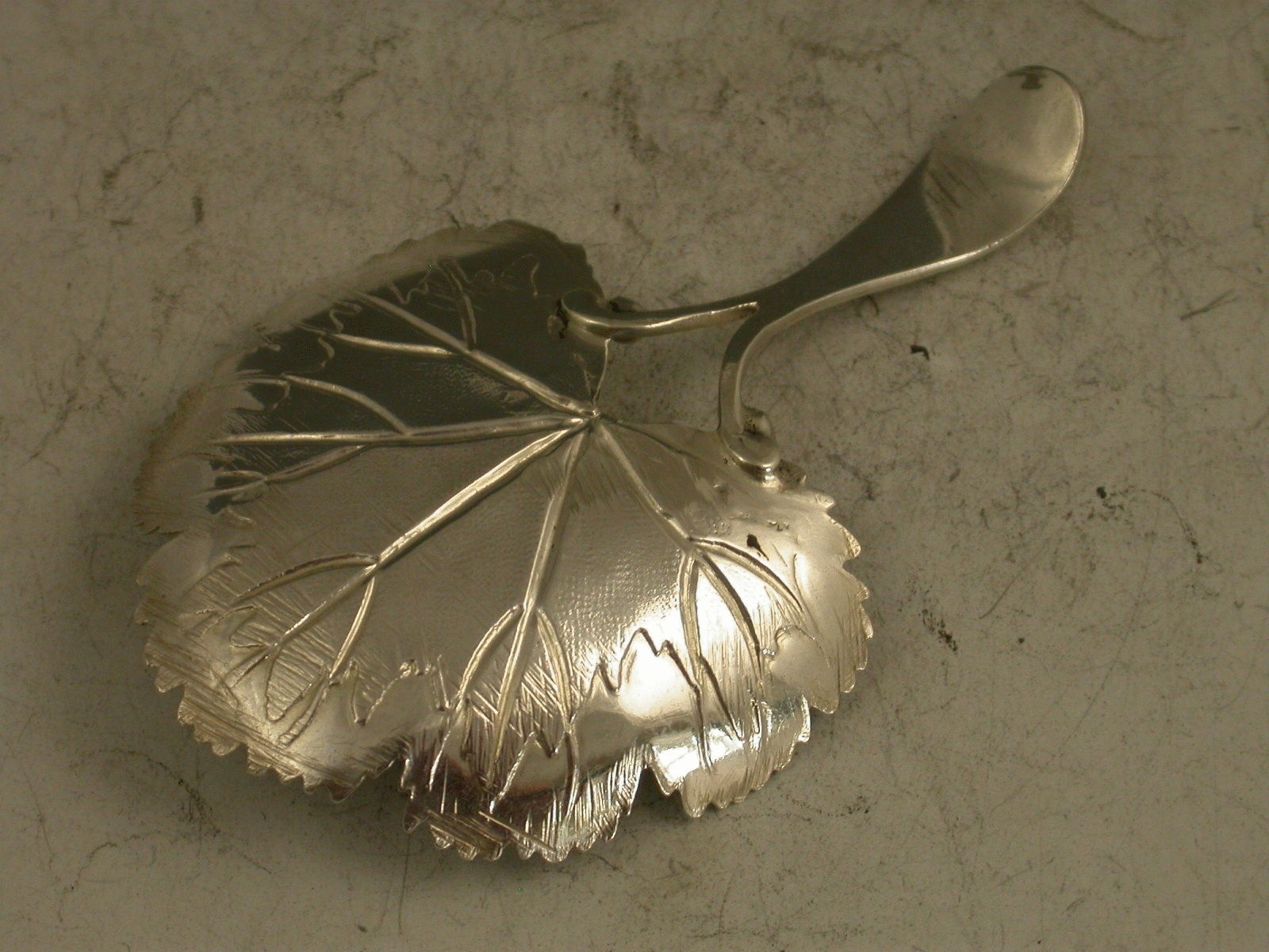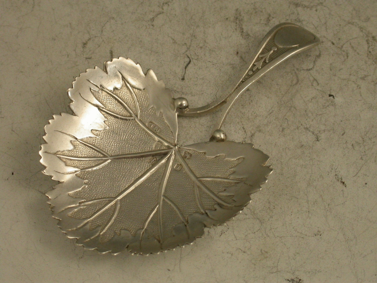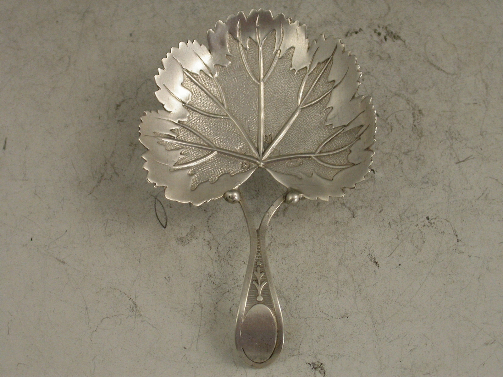 A rare George III silver Caddy Spoon, the bowl formed as a strawberry leaf with veins, matted background and serrated rim, the bifurcated handle with vacant oval cartouche.