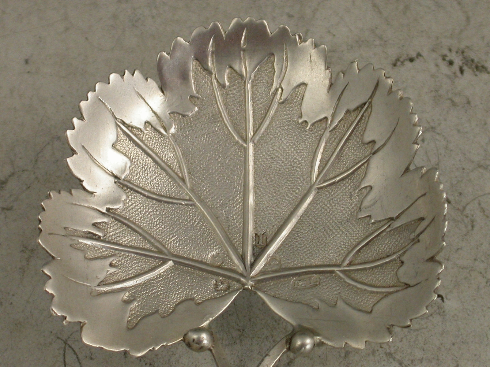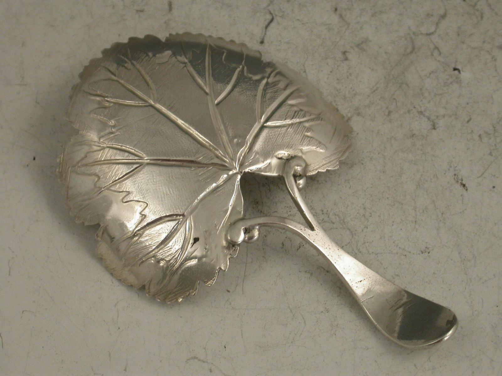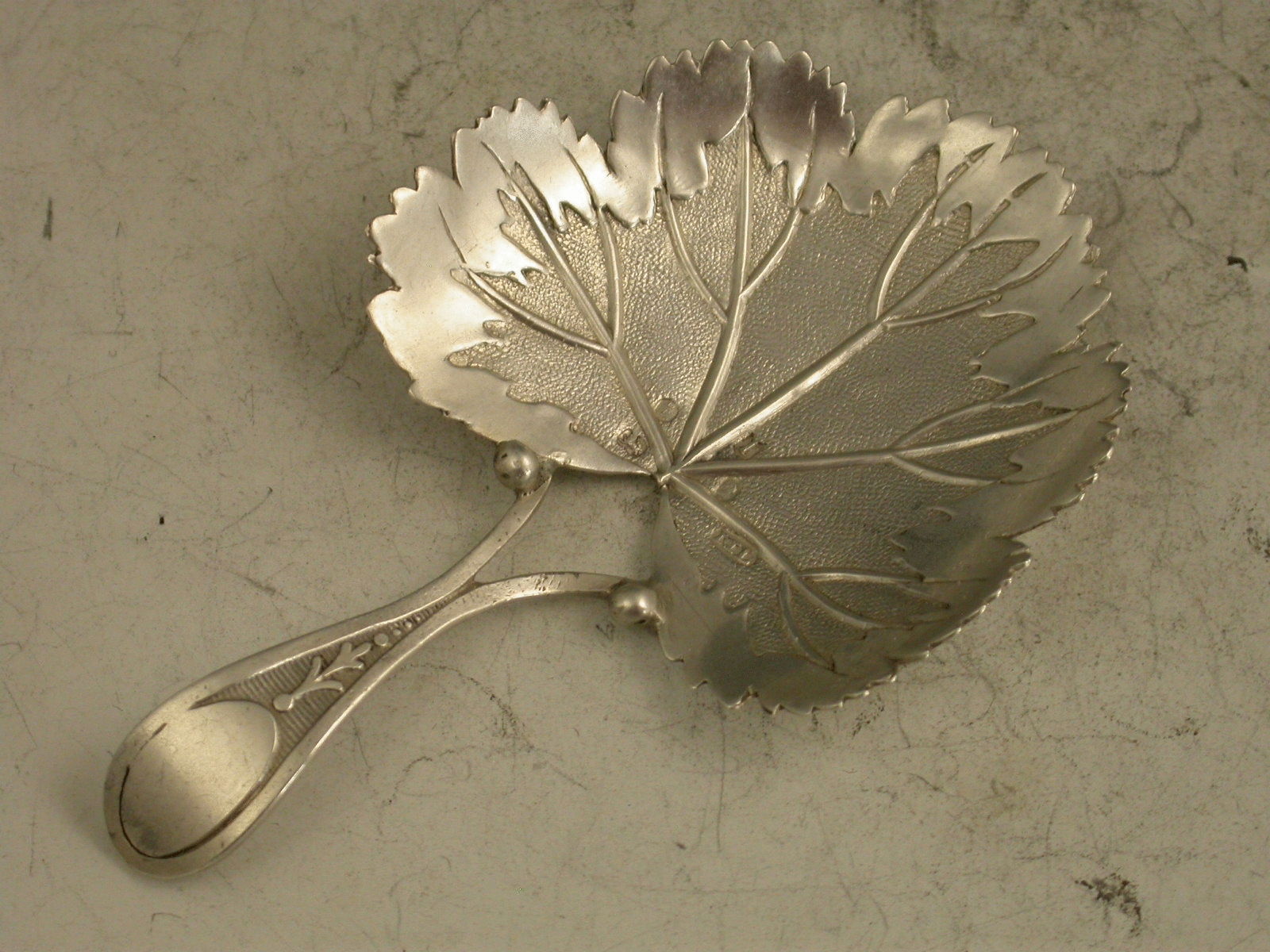 A rare George III silver Caddy Spoon, the bowl formed as a strawberry leaf with veins, matted background and serrated rim, the bifurcated handle with vacant oval cartouche.