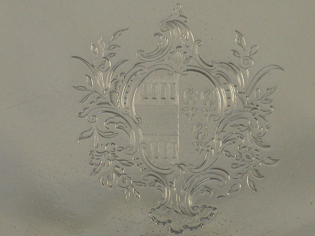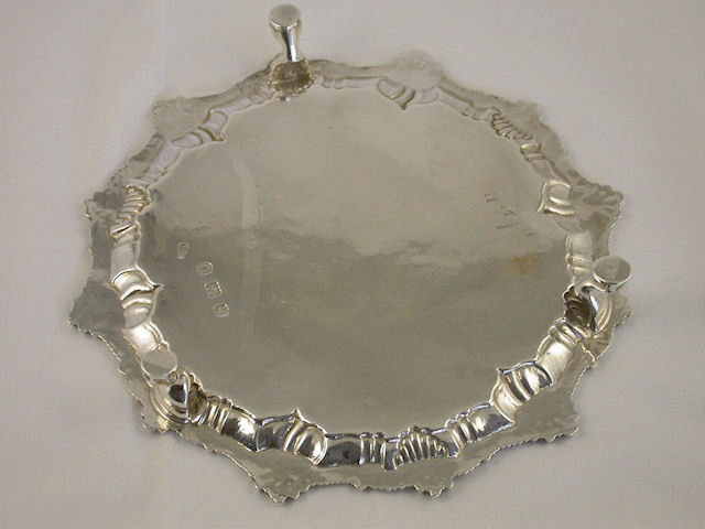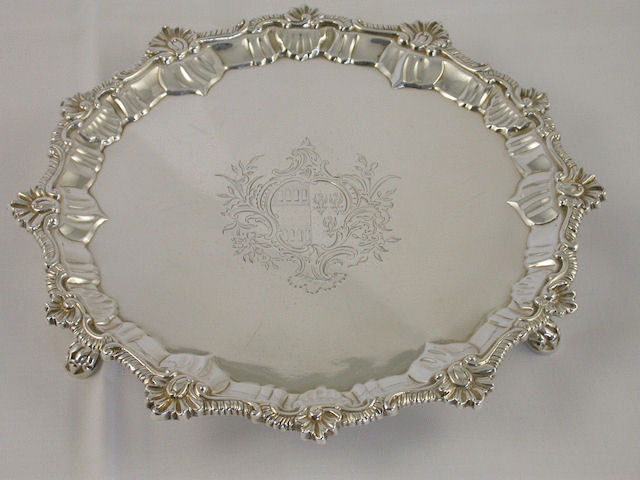A good George III circular silver Waiter with shell, scroll and gadrooned border, standing on three claw feet, engraved with a contemporary Coat of Arms. The reverse engraved with initials M over M : R.