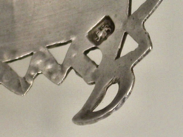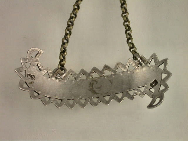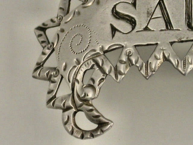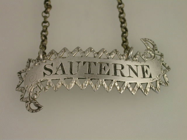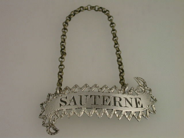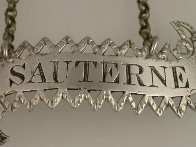 A very fine and rare George III 18th century silver Wine Label of scroll form with pierced and bright cut engraved zig-zag border, incised for SAUTERNE.