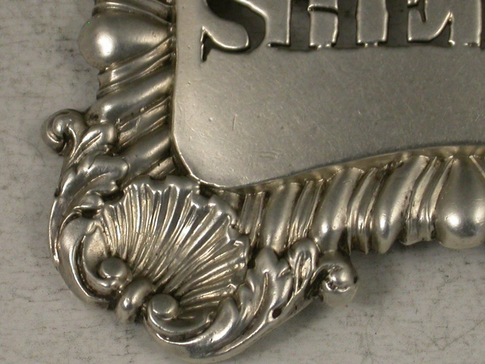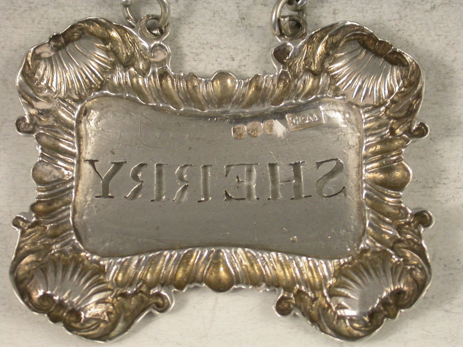 An unusual George III silver Wine Label of larger than average size, of shaped rectangular form with gadrooned border and a shell to each corner, pierced for Sherry below an engraved crest of a tree issuing out of a Ducal Coronet below an Earls Coronet.