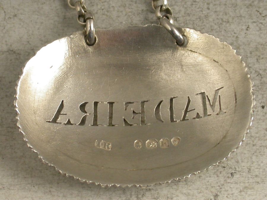 A good George IV cast silver Wine Label of oval form with gadrooned border, pierced for Madeira.