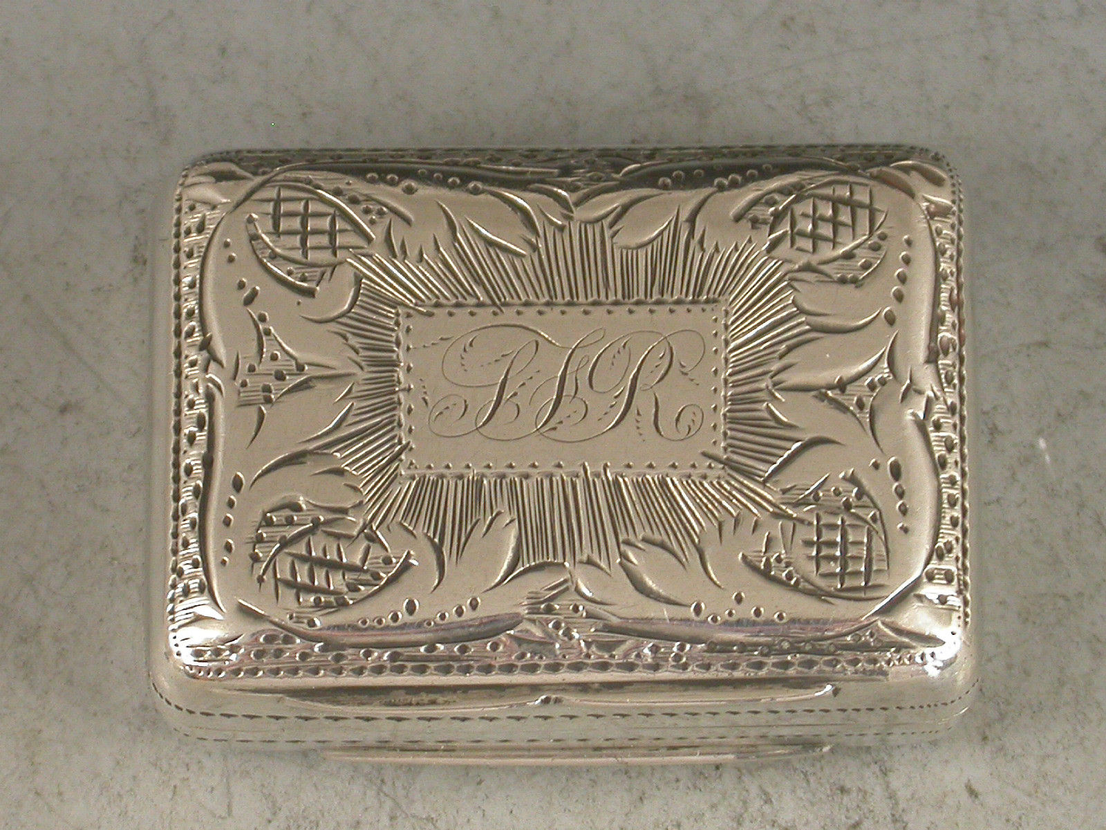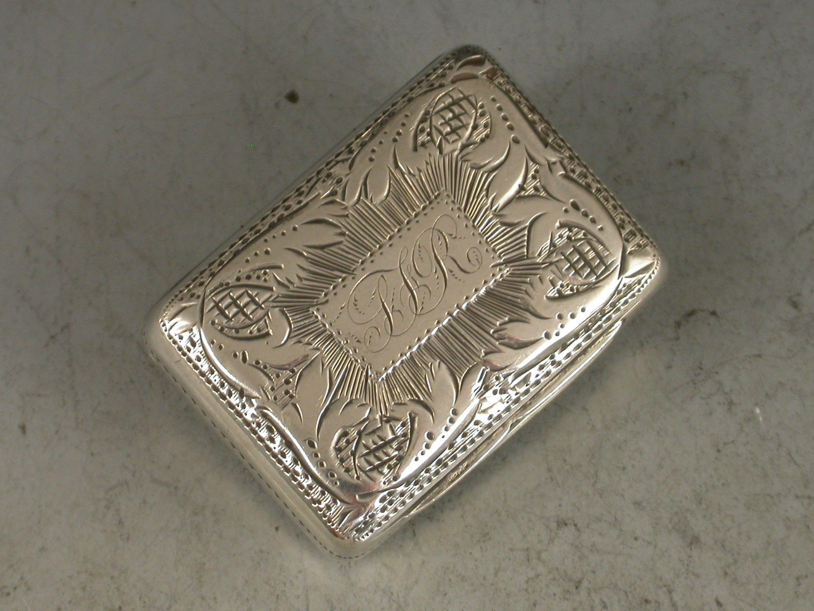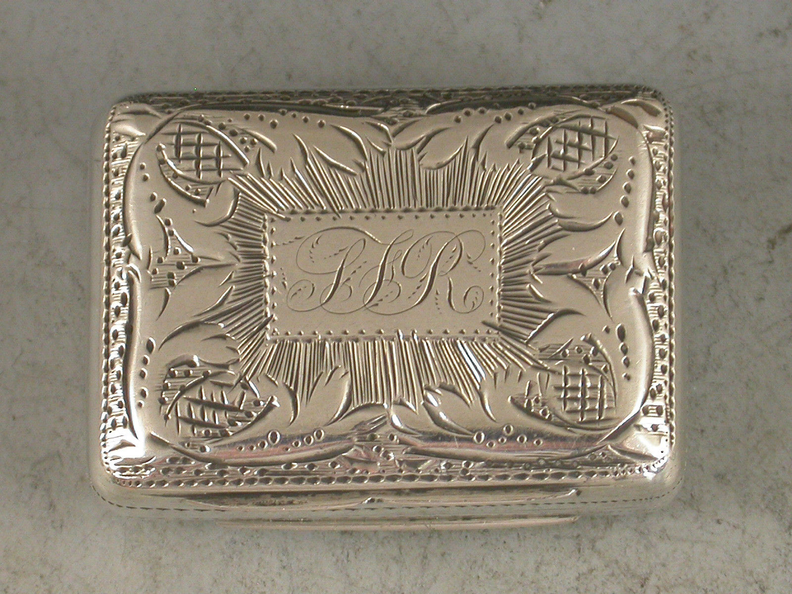 A good George IV silver Vinaigrette of rounded rectangular form, the base with bright cut engraved flower head motif surrounded by a prick dot and wriggle work border. The lid with a rectangular cartouche engraved with contemporary script initials surrounded by rayed decoration with a pineapple motif at each corner. The silver gilt interior with scroll pierced grille centered by a flower head.