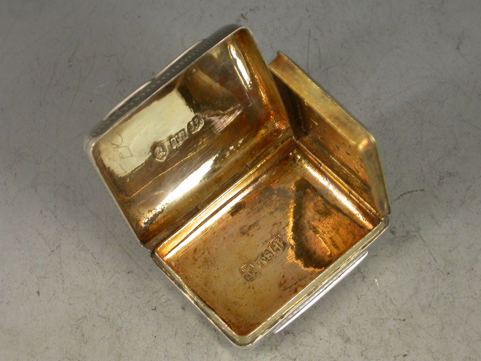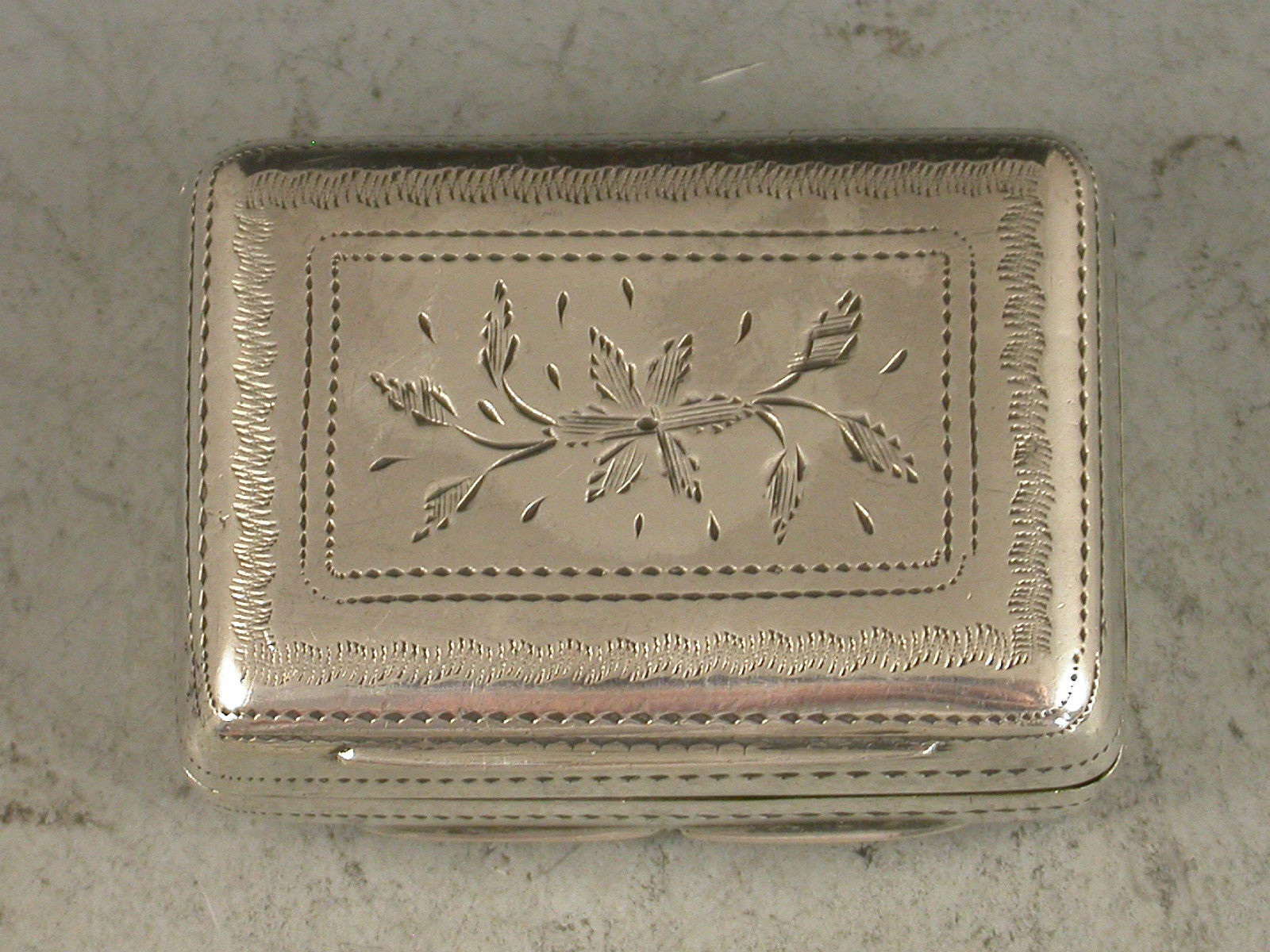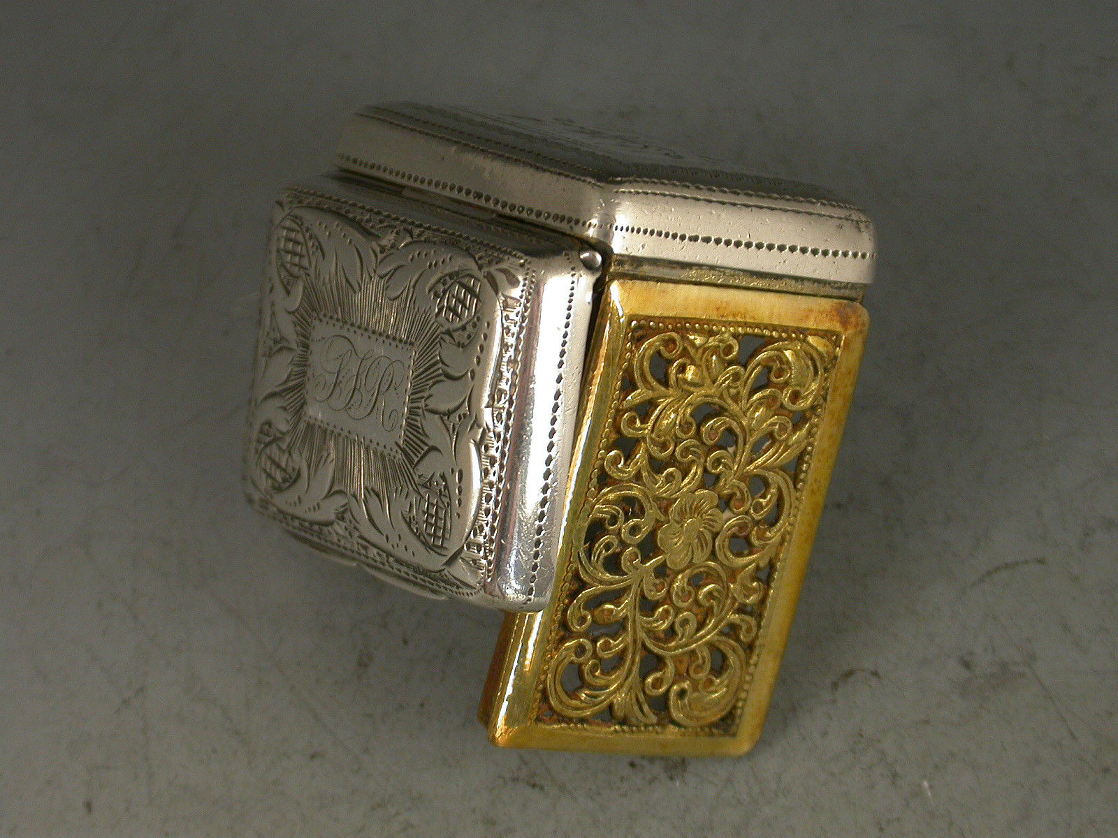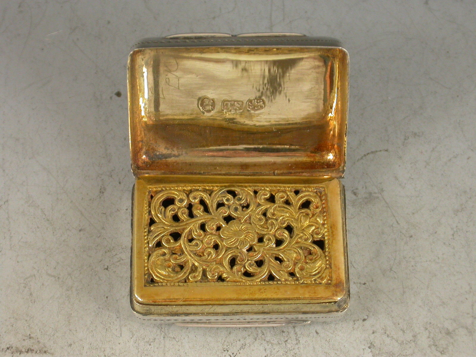 A good George IV silver Vinaigrette of rounded rectangular form, the base with bright cut engraved flower head motif surrounded by a prick dot and wriggle work border. The lid with a rectangular cartouche engraved with contemporary script initials surrounded by rayed decoration with a pineapple motif at each corner. The silver gilt interior with scroll pierced grille centered by a flower head.