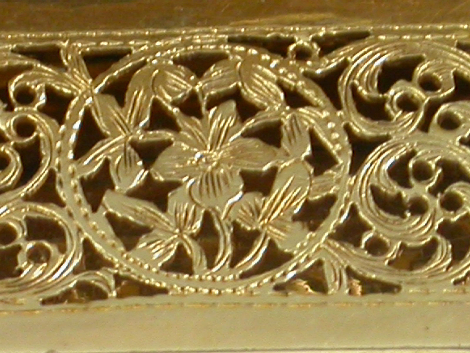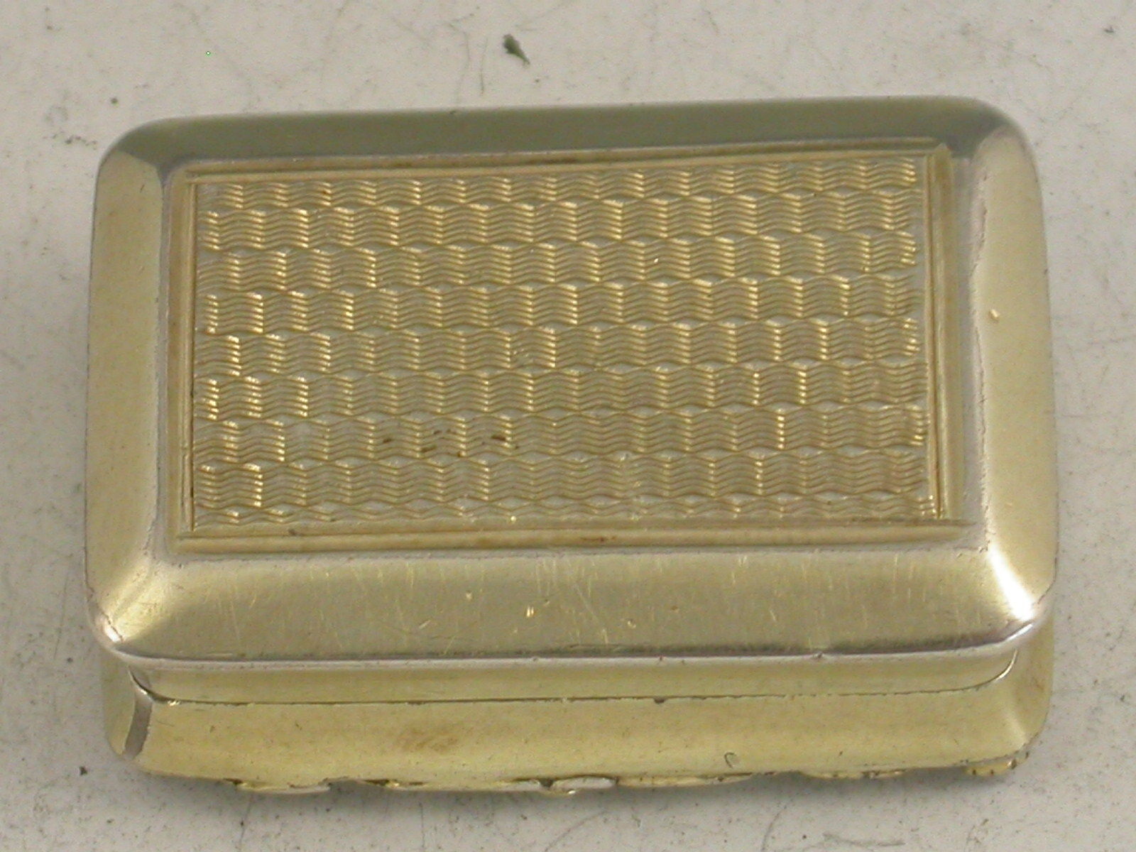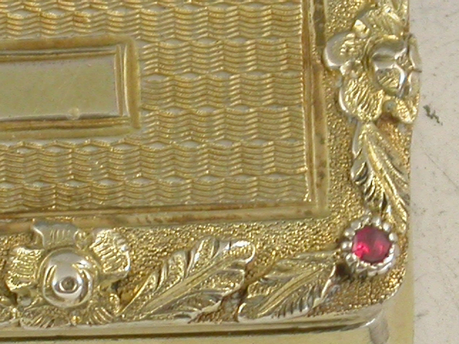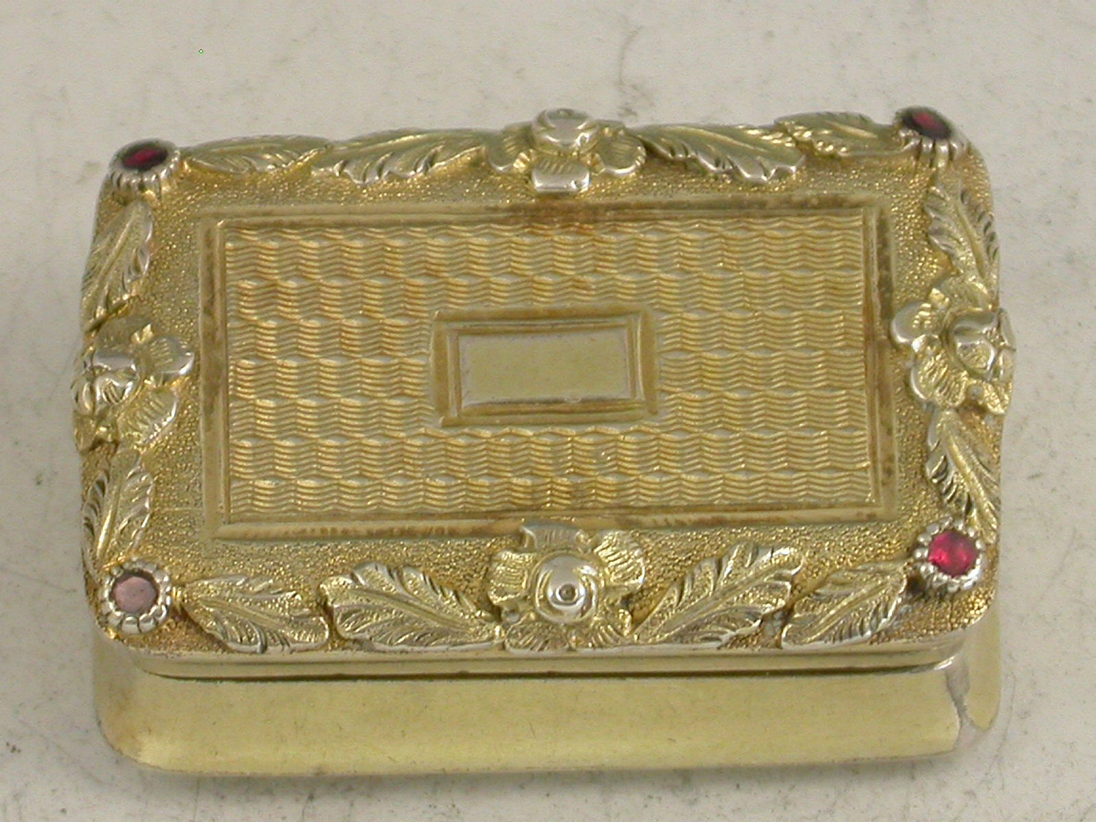 A fine and rare George IV silver gilt Vinaigrette of rectangular cushion shape, with engine turned decoration to the base and cover, a raised border of leaves and flower heads inset with a ruby at each corner, vacant rectangular cartouche to the lid, the silver gilt interior with intricately pierced grill.