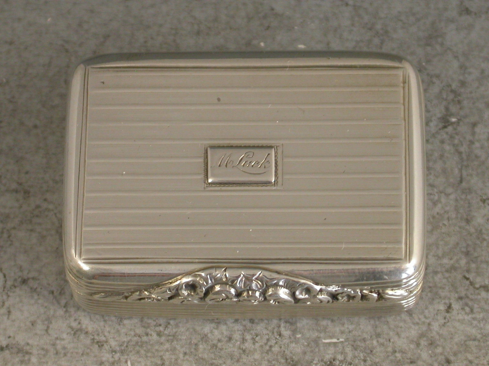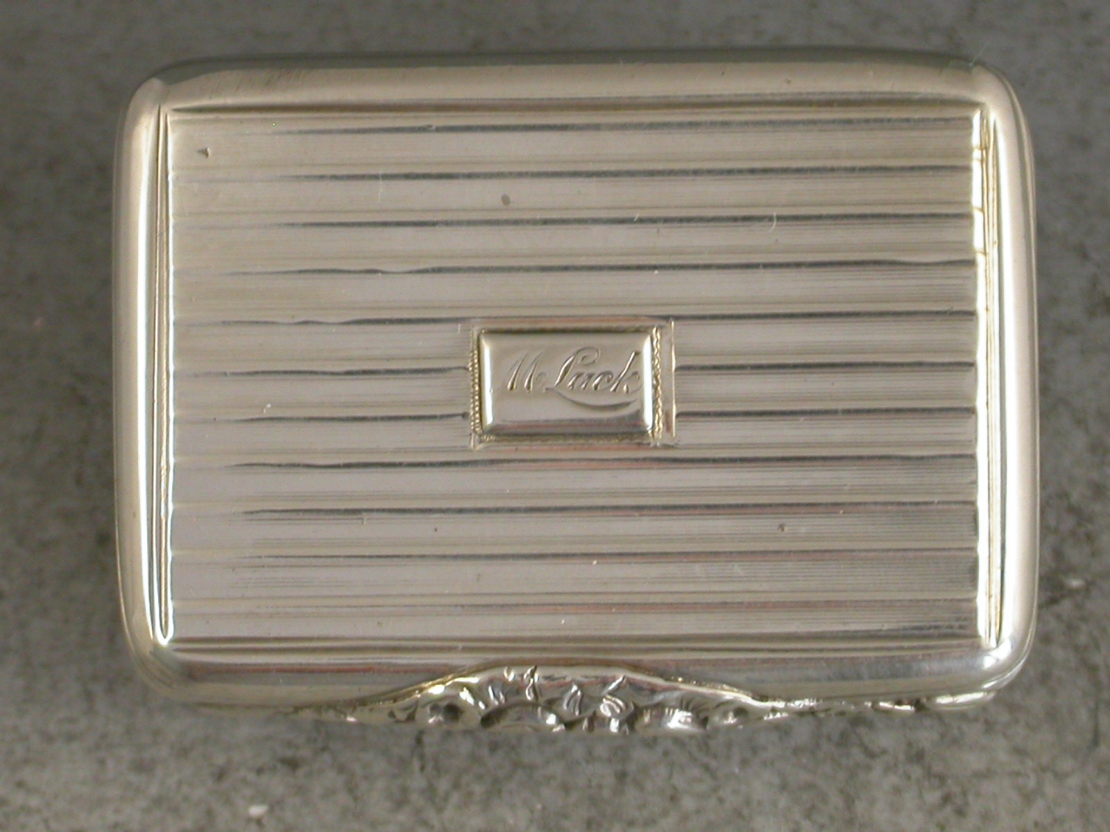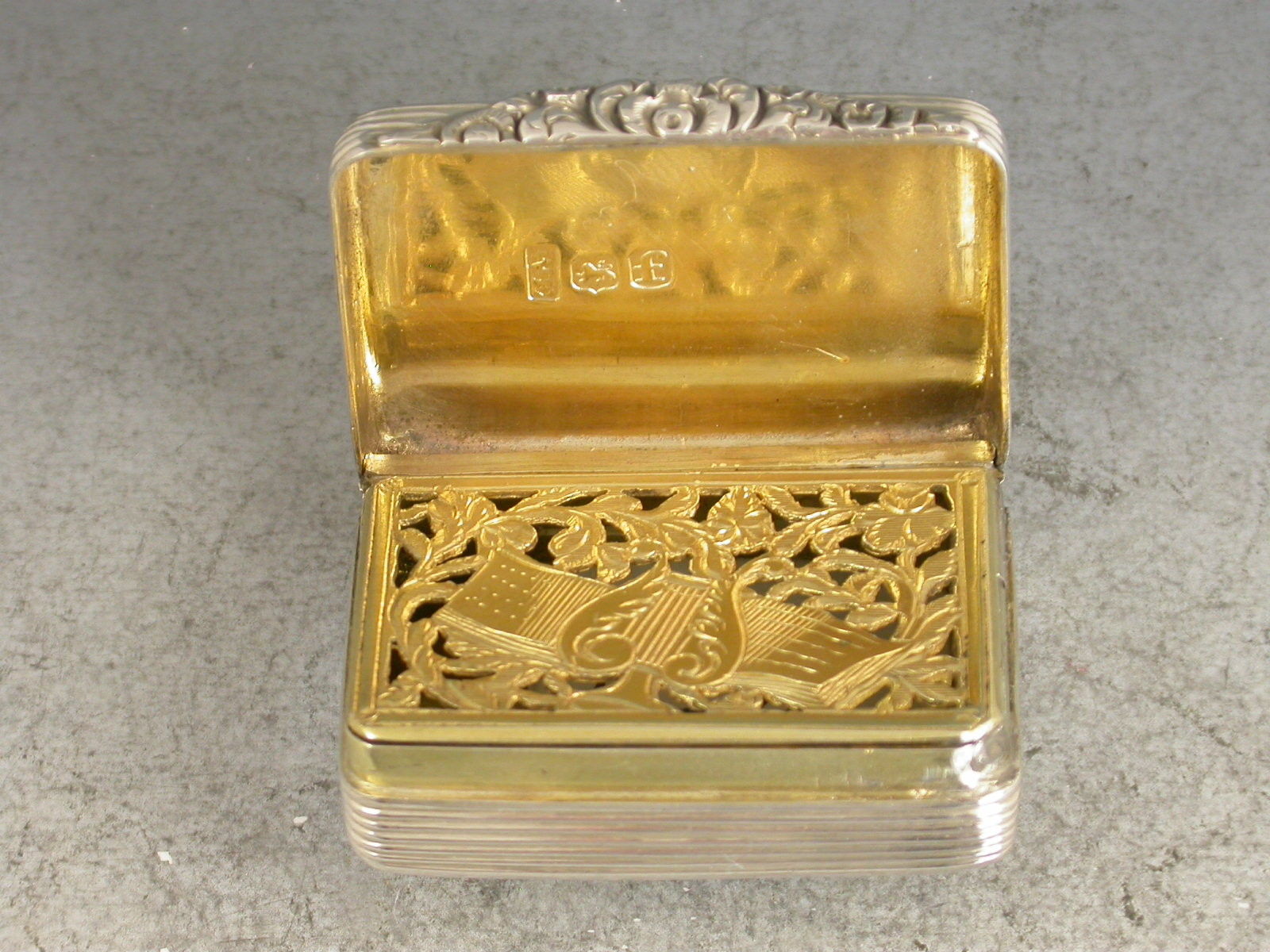 A rare George IV silver Vinaigrette of rounded rectangular form, the lid, base and sides with reeded engine turned decoration, a rectangular cartouche to the lid engraved 'M Luck'. The silver gilt interior with an intricately pierced grill depicting a lyre and sheet music amongst foliate scrolls.