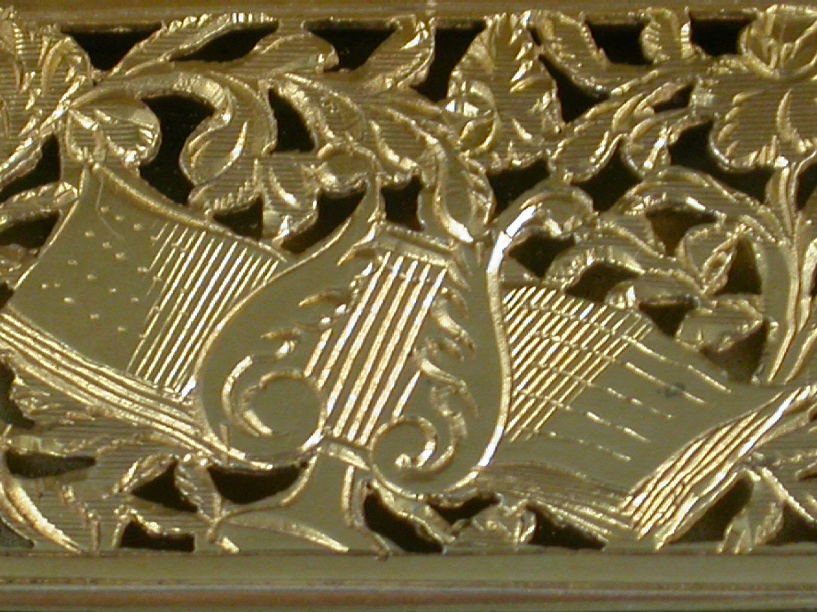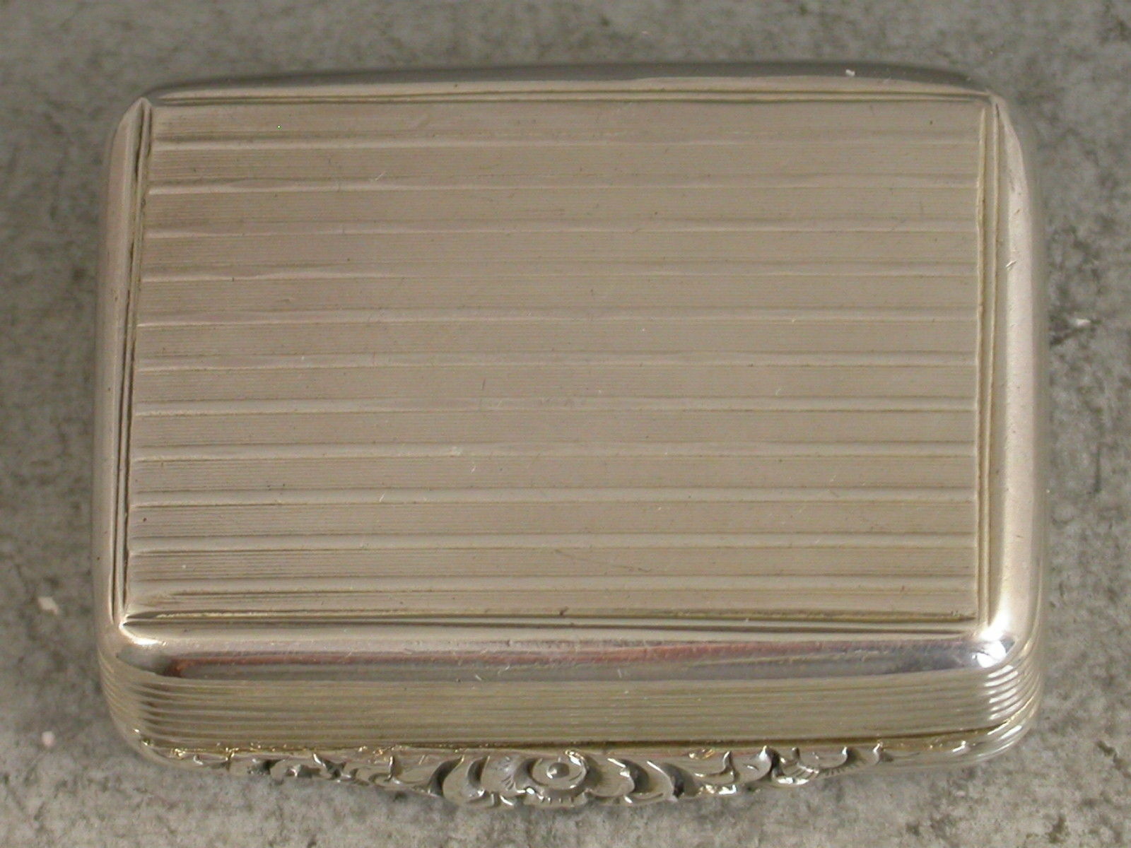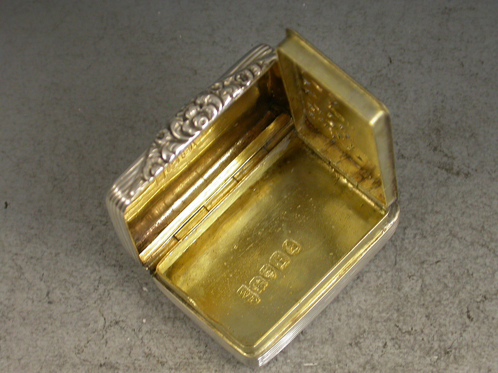 A rare George IV silver Vinaigrette of rounded rectangular form, the lid, base and sides with reeded engine turned decoration, a rectangular cartouche to the lid engraved 'M Luck'. The silver gilt interior with an intricately pierced grill depicting a lyre and sheet music amongst foliate scrolls.