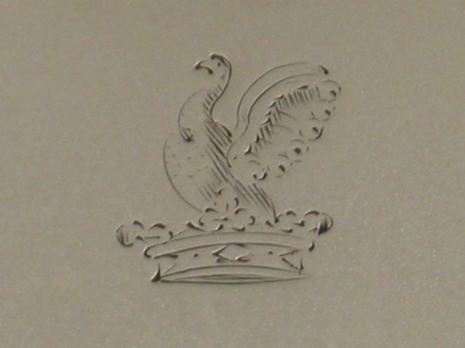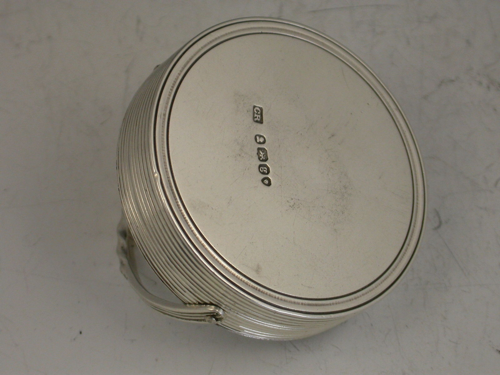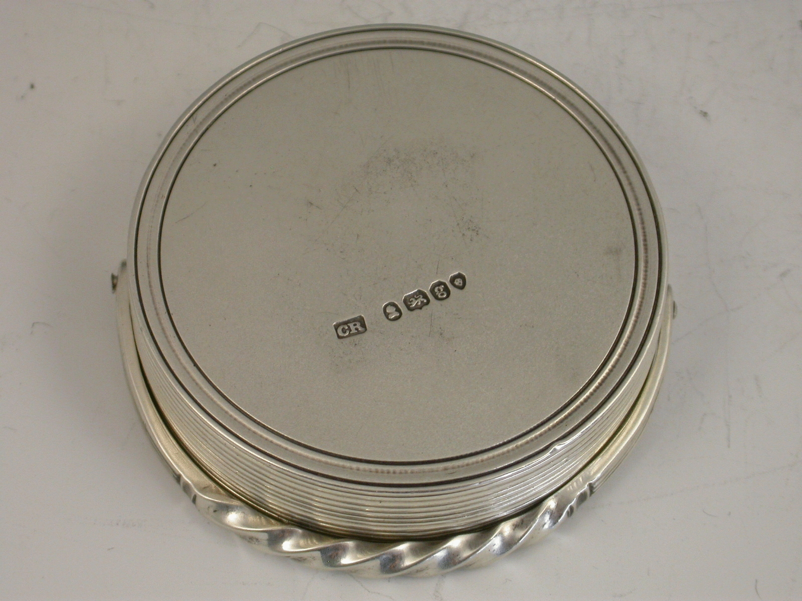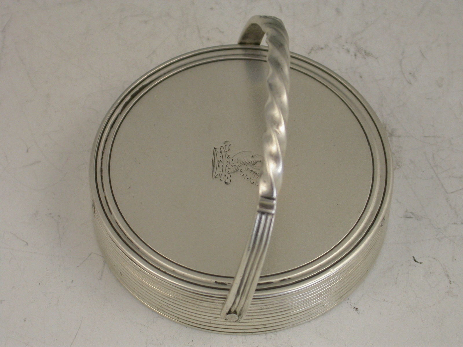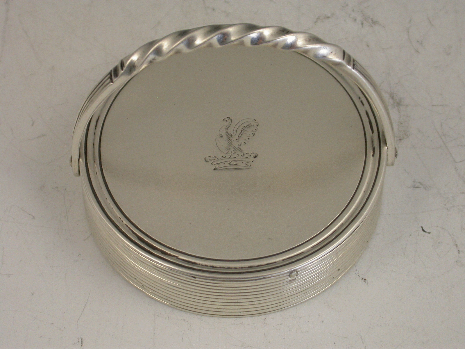 An unusual George IV silver Paperweight of circular form with reeded sides and twisted swing handle, the top engraved with a crest depicting a bird issuing out of a coronet. Probably weighted with lead (205 grams).