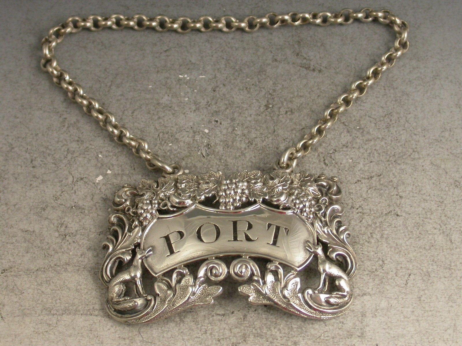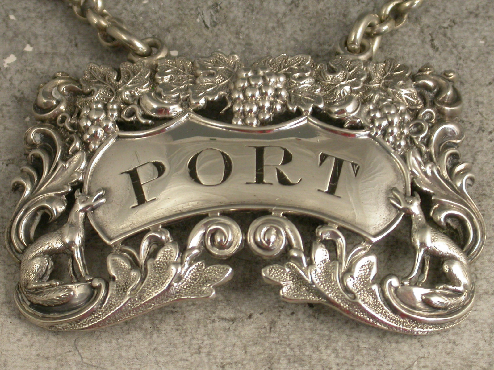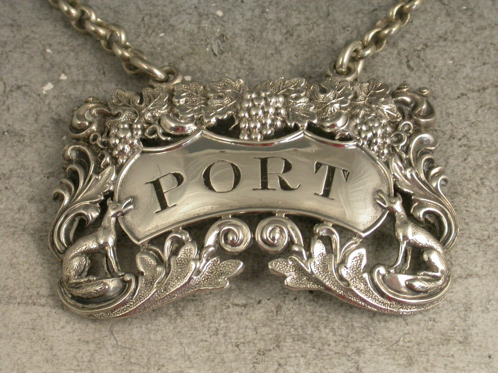 A rare George IV die-stamped silver Wine Label of pierced shaped rectangular form decorated with scrolls, vine leaves and grapes and with a seated fox at either end of the shaped name plate incised for Port.