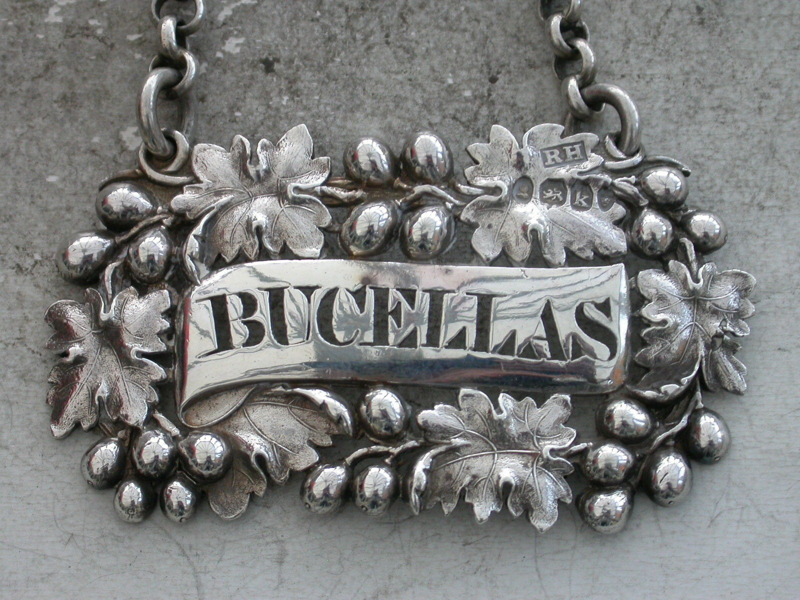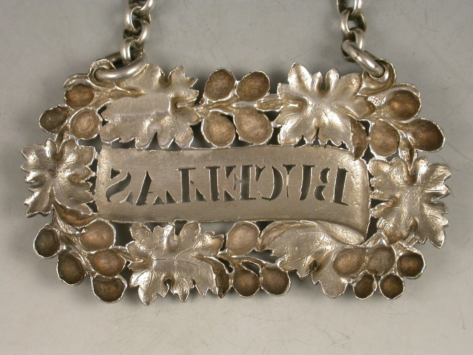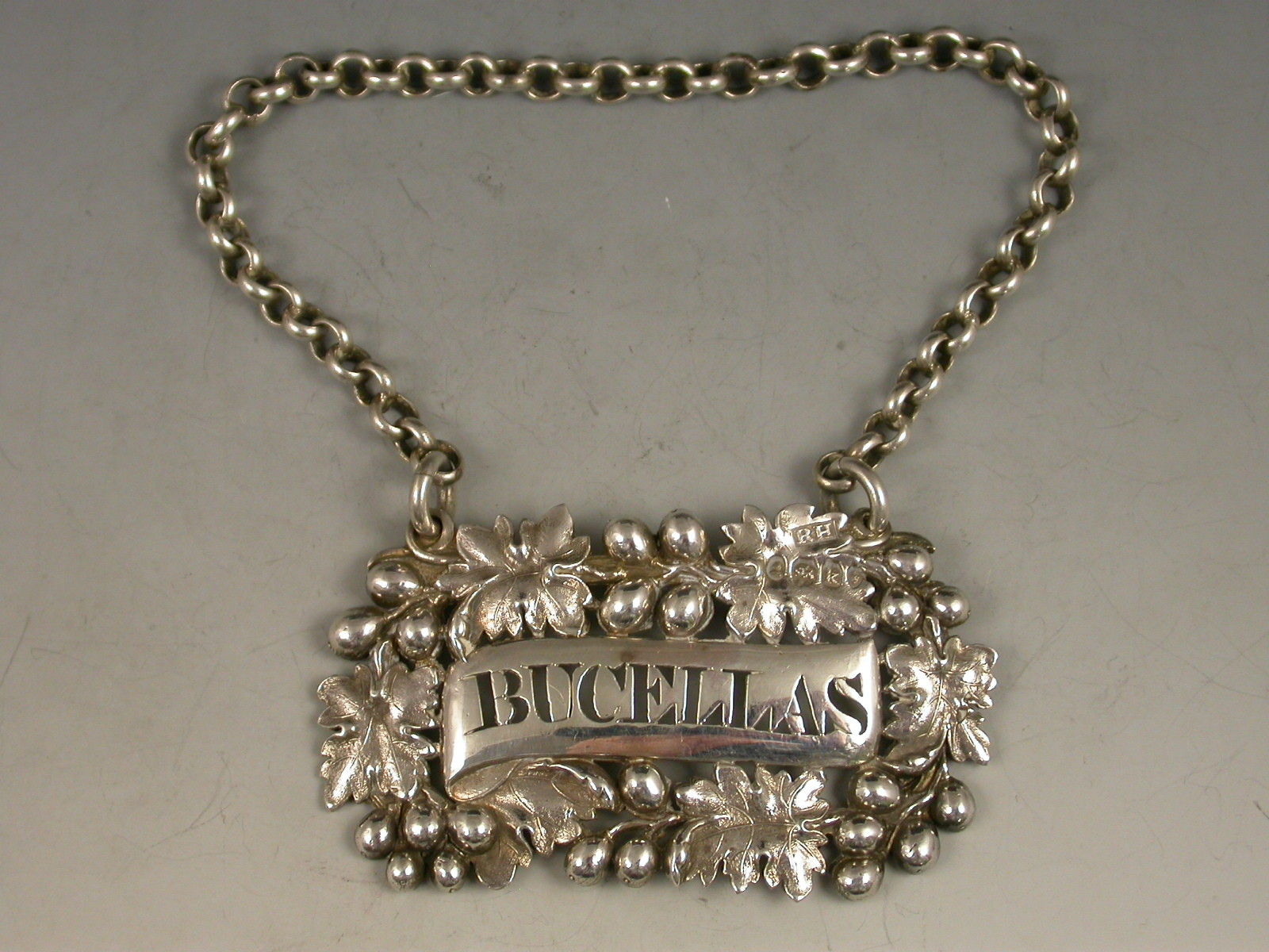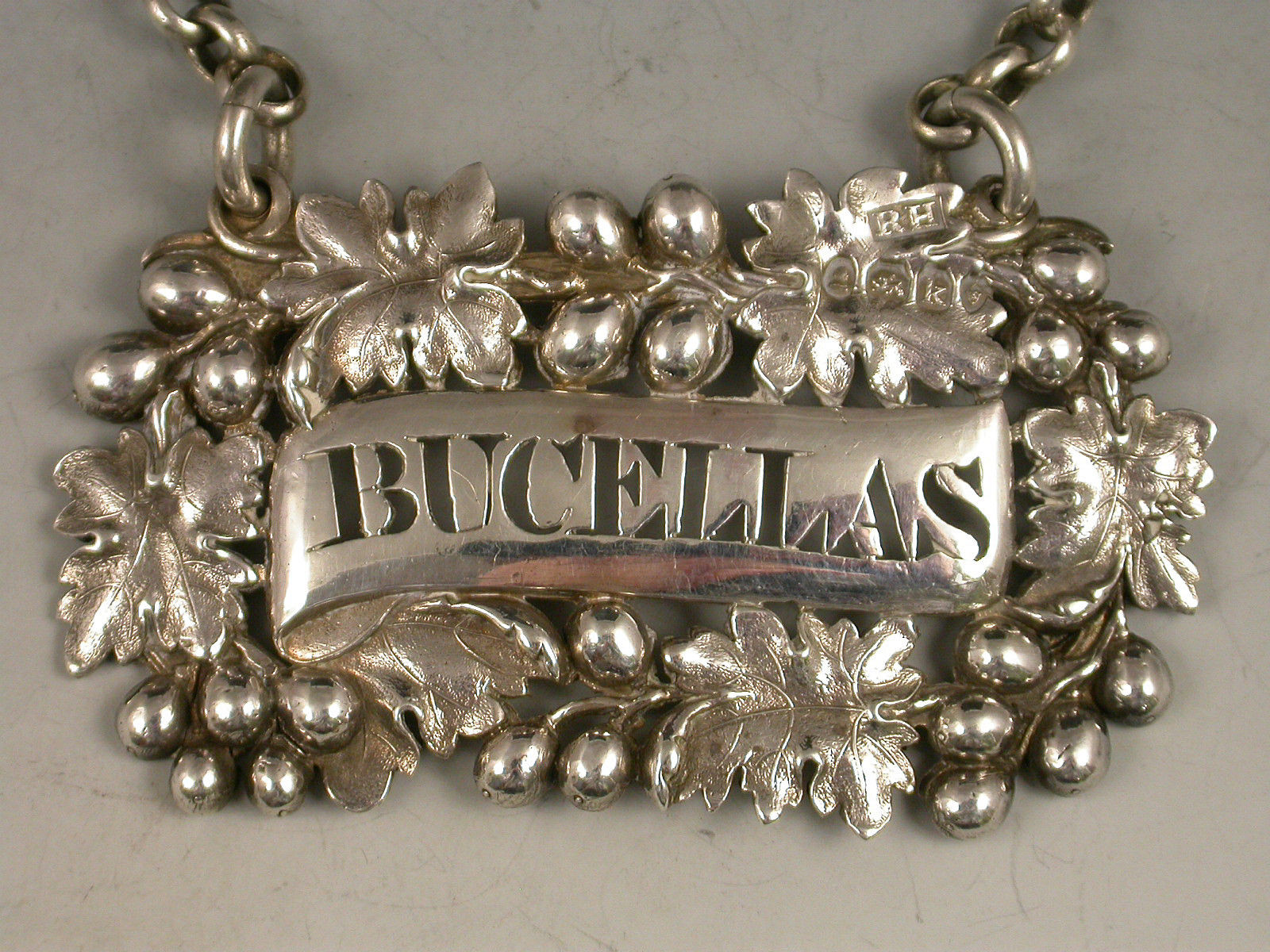 A good quality George IV heavy die-stamped silver Wine Label of shaped oval form, the border formed from vine leaves and large grapes surrounding a plain scrolled name plate pierced for Bucellas.