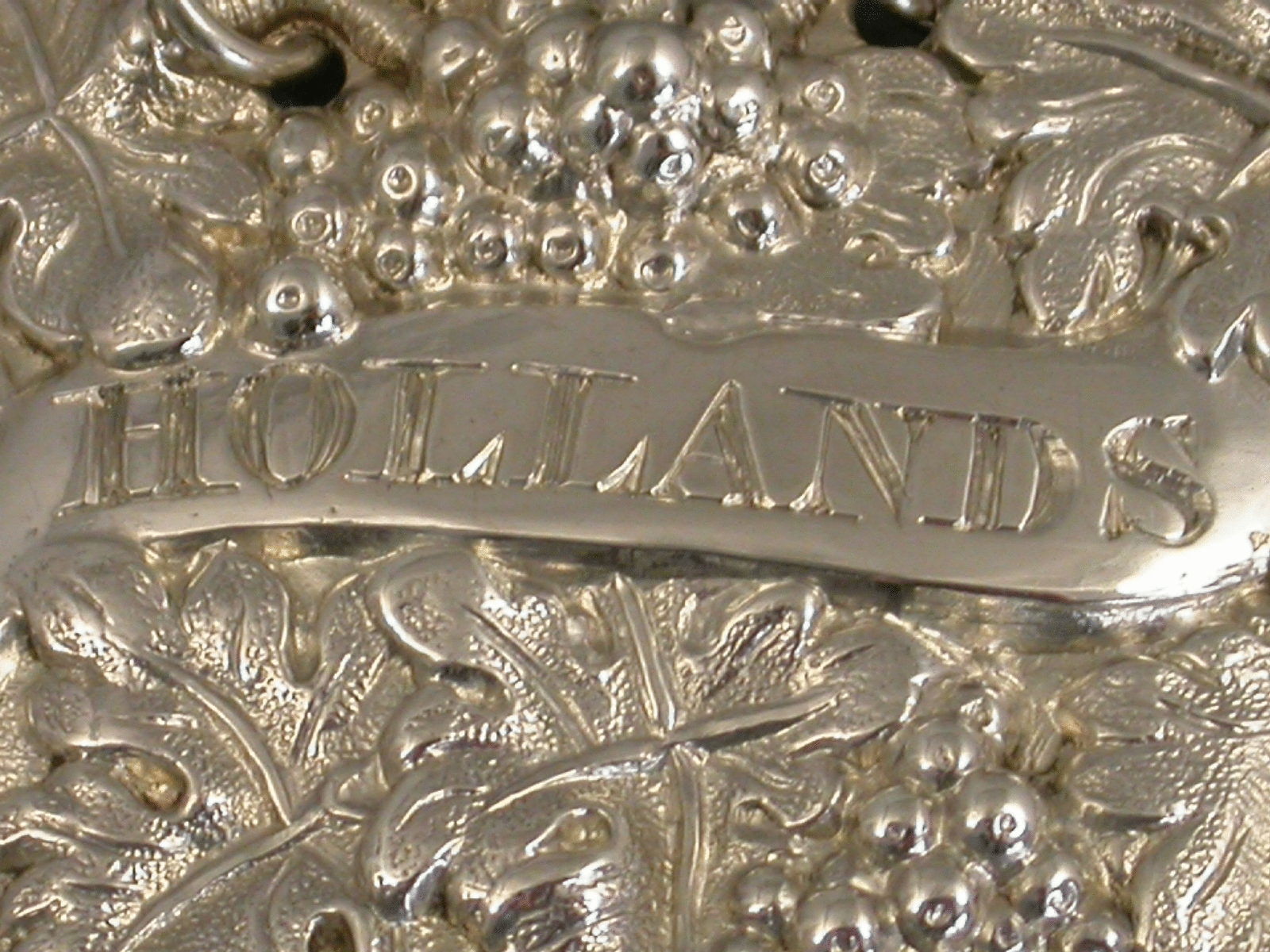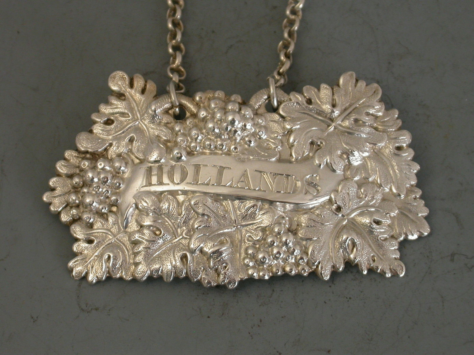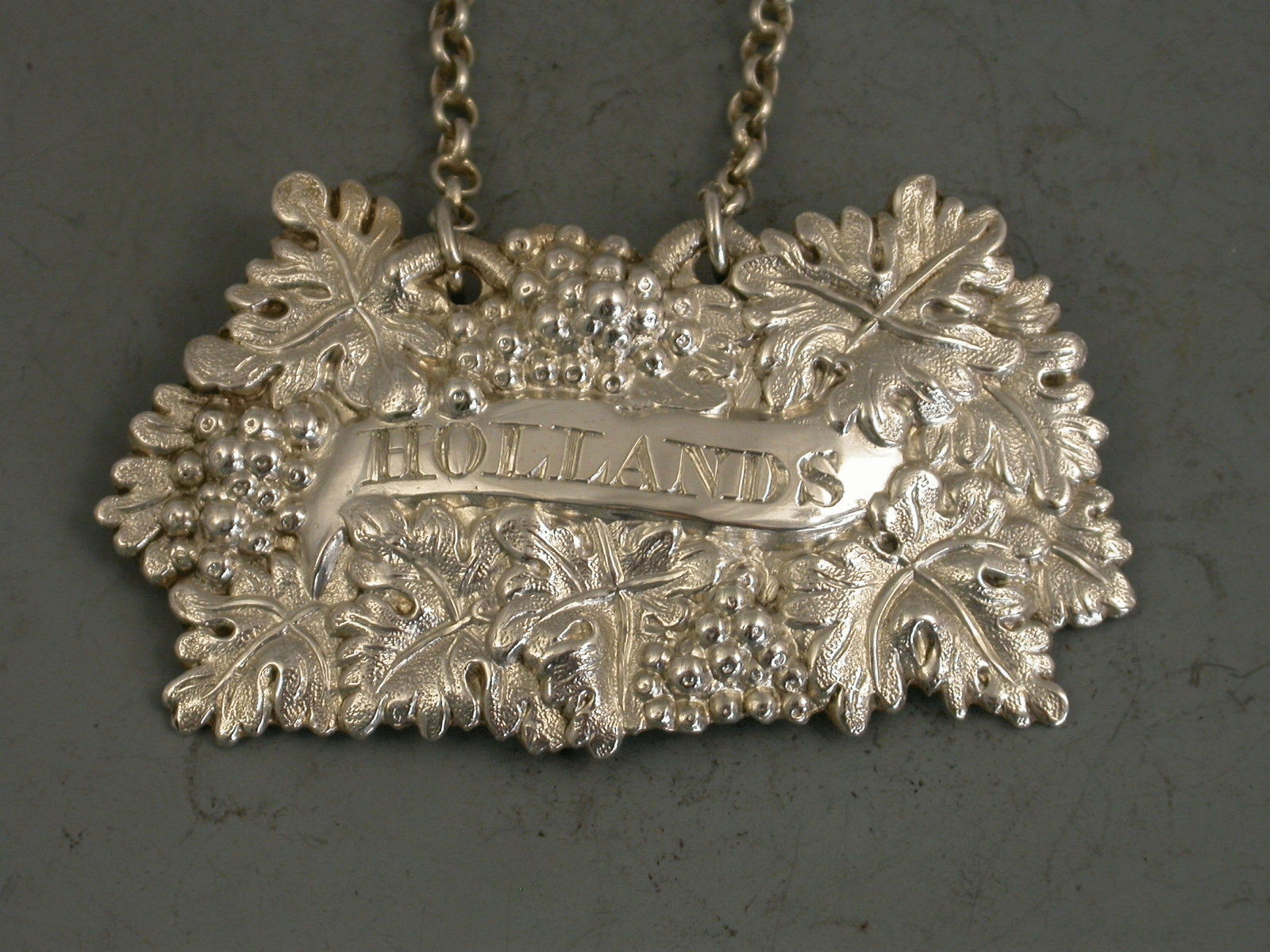A George IV die-stamped silver Wine Label, the plain scrolled name plate incised for Hollands (Dutch Gin), surrounded by a border of entwined vine leaves and grapes.